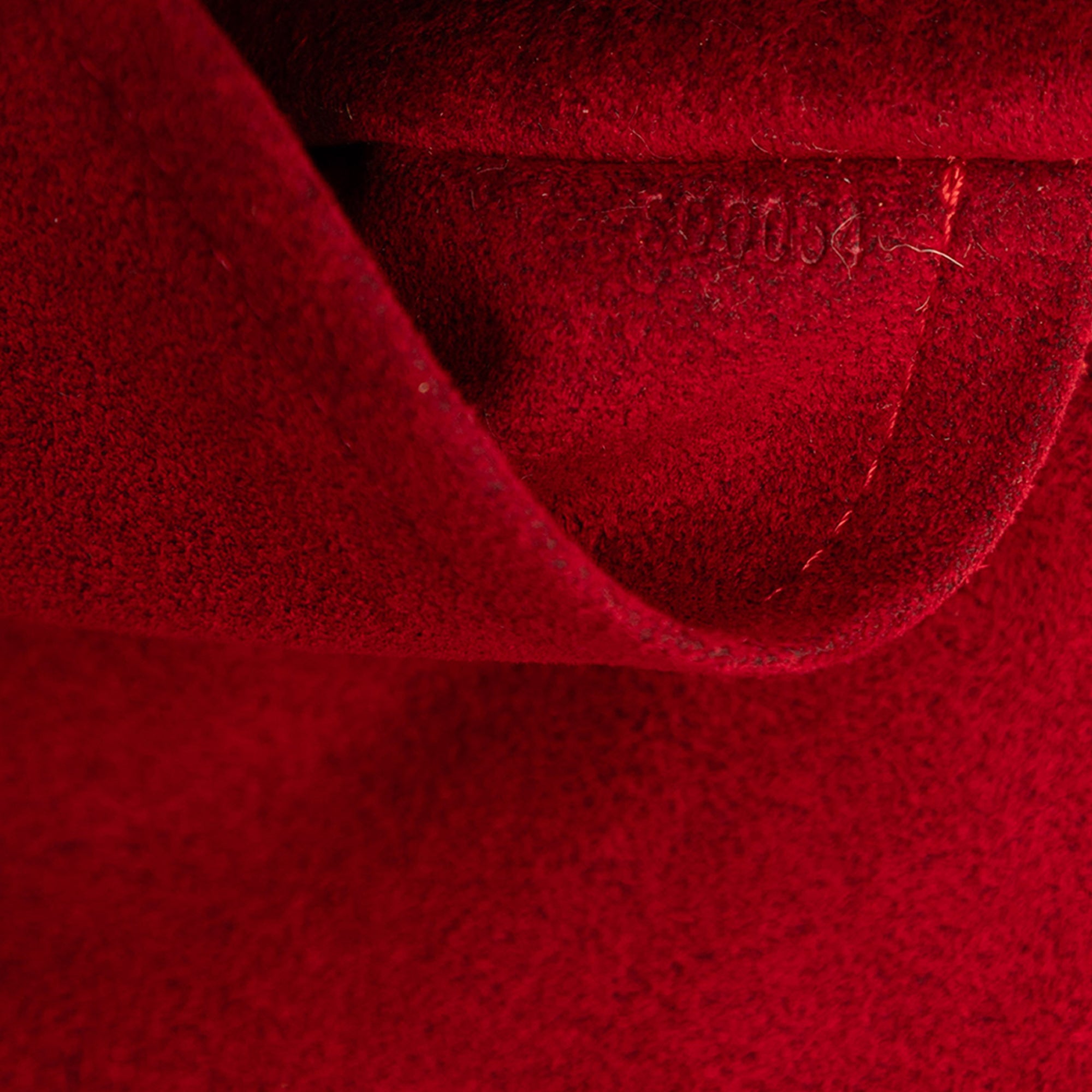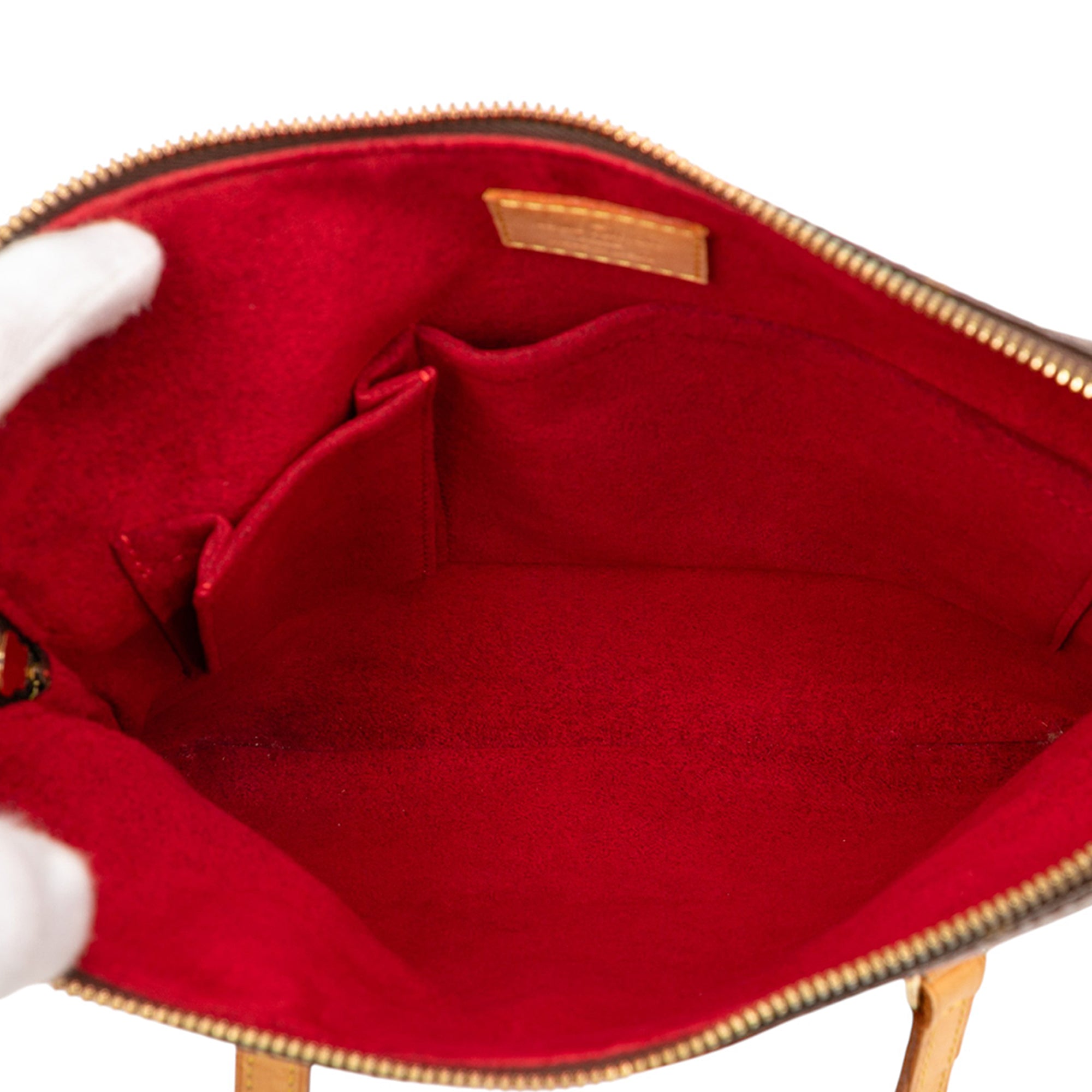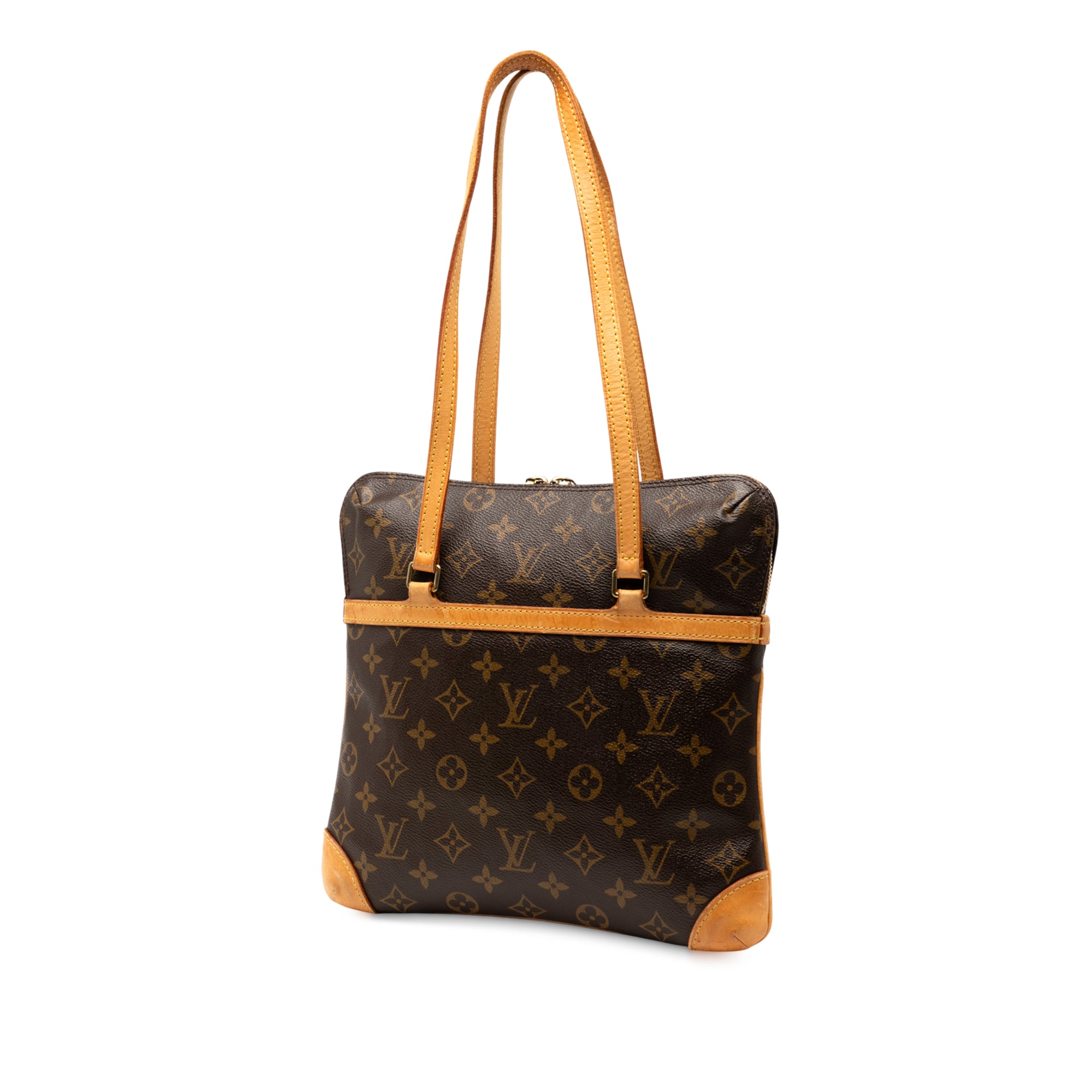 The Coussin GM features a monogram canvas body with vachetta leather trim, flat vachetta leather straps, a top zip closure, exterior open pockets, and interior slip pockets. Retail Price: 795.00