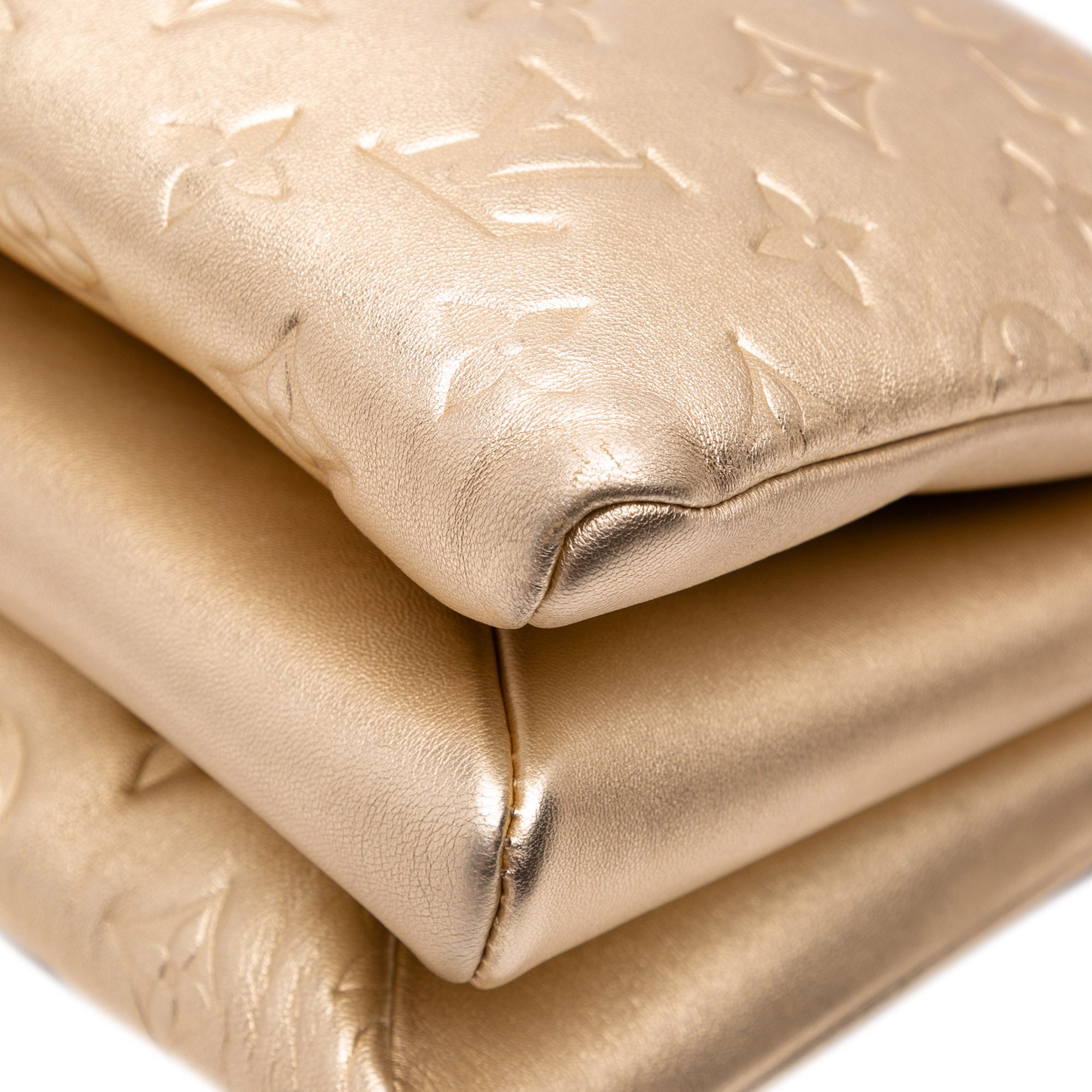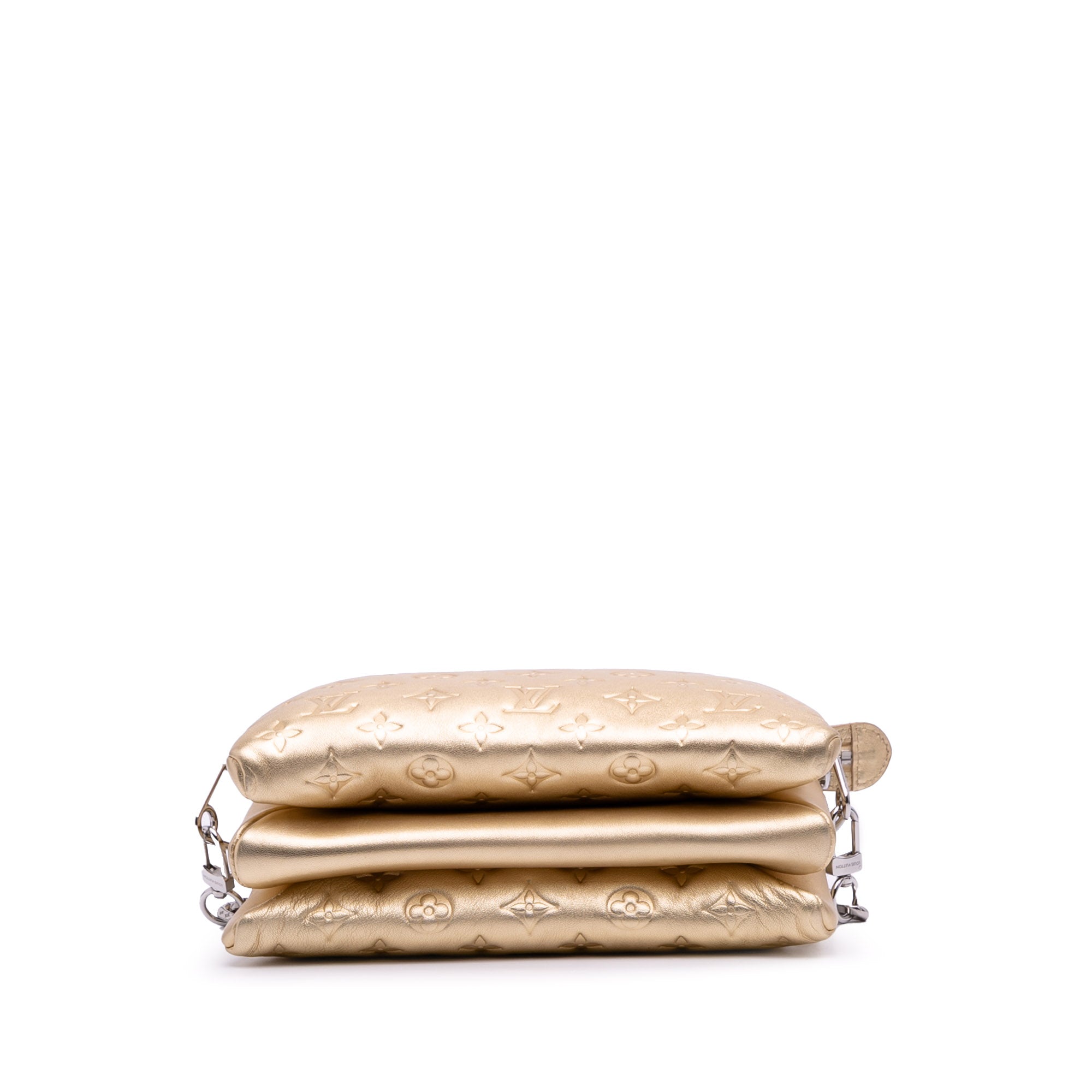 The Coussin features an embossed lambskin leather body, a detachable chain link strap, a detachable flat canvas shoulder strap, a top zip closure, and an interior zip compartment. Inclusion: Dust bag. Retail Price: 4800.00