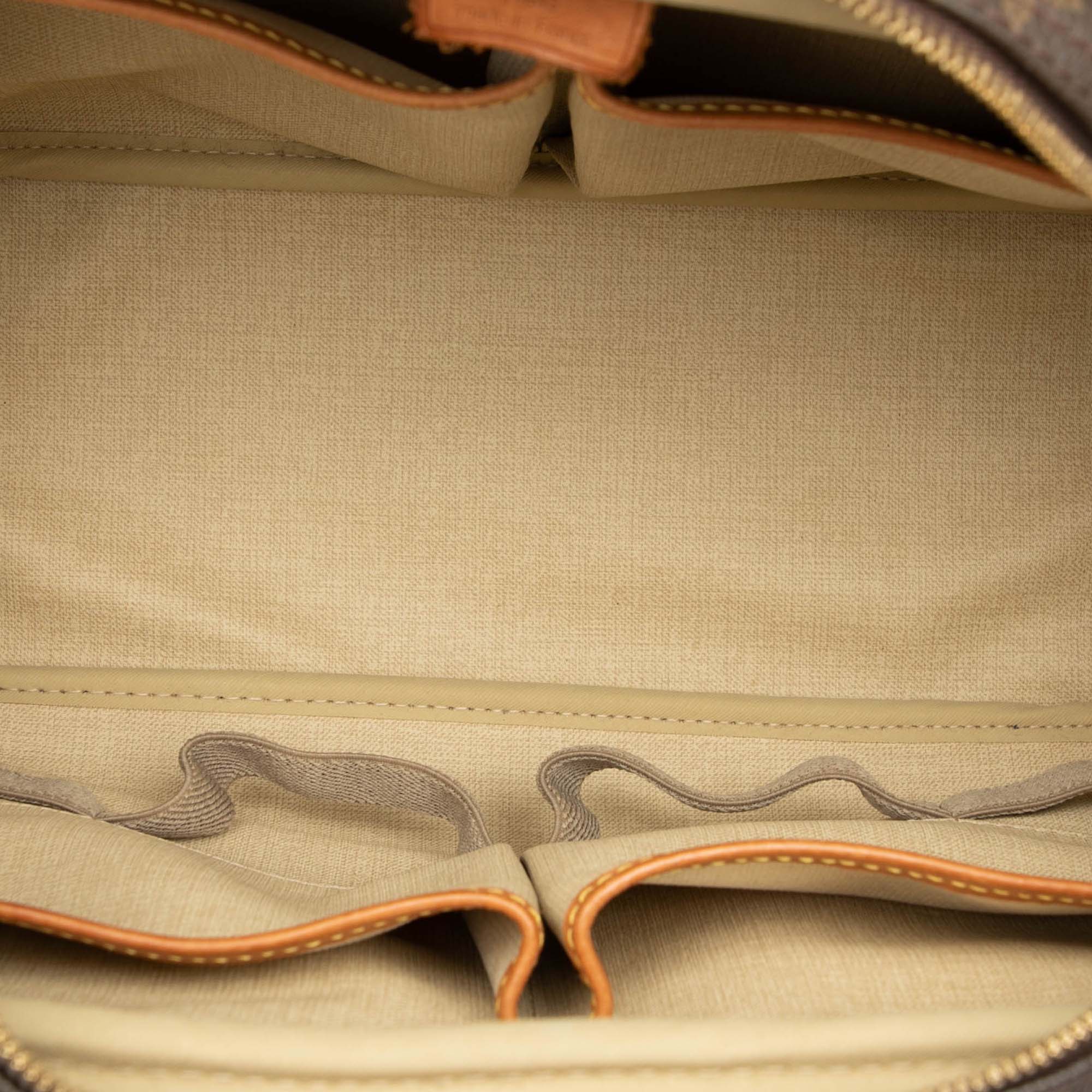The Deauville features a monogram canvas body with vachetta leather trim, rolled vachetta leather handles, an exterior slip pocket, a top zip closure, and interior open pockets. Retail Price: 1150.00