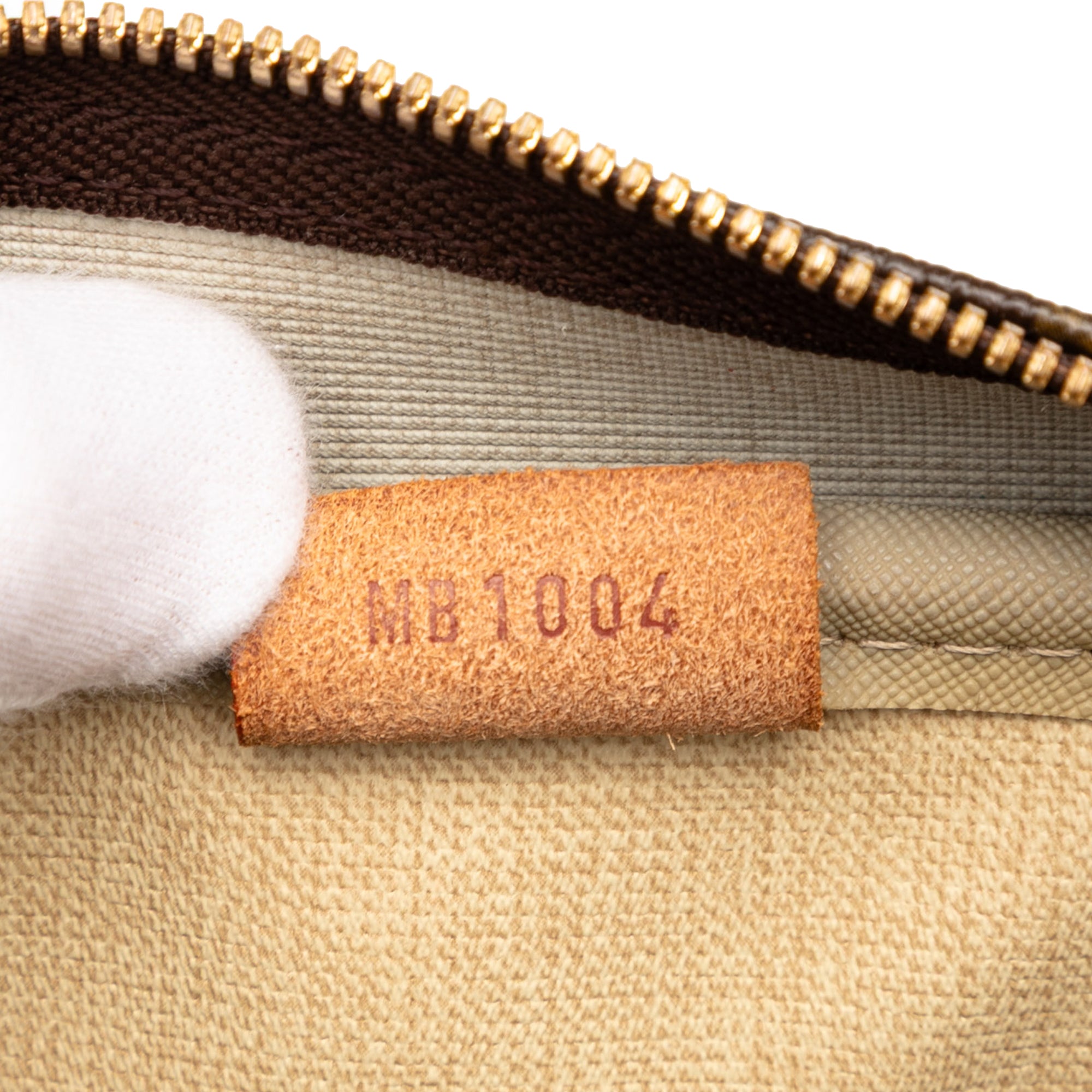 The Deauville features a monogram canvas body with vachetta leather trim, rolled vachetta leather handles, a top zip closure, an exterior slip pocket, and interior open pockets. Retail Price: 968.00