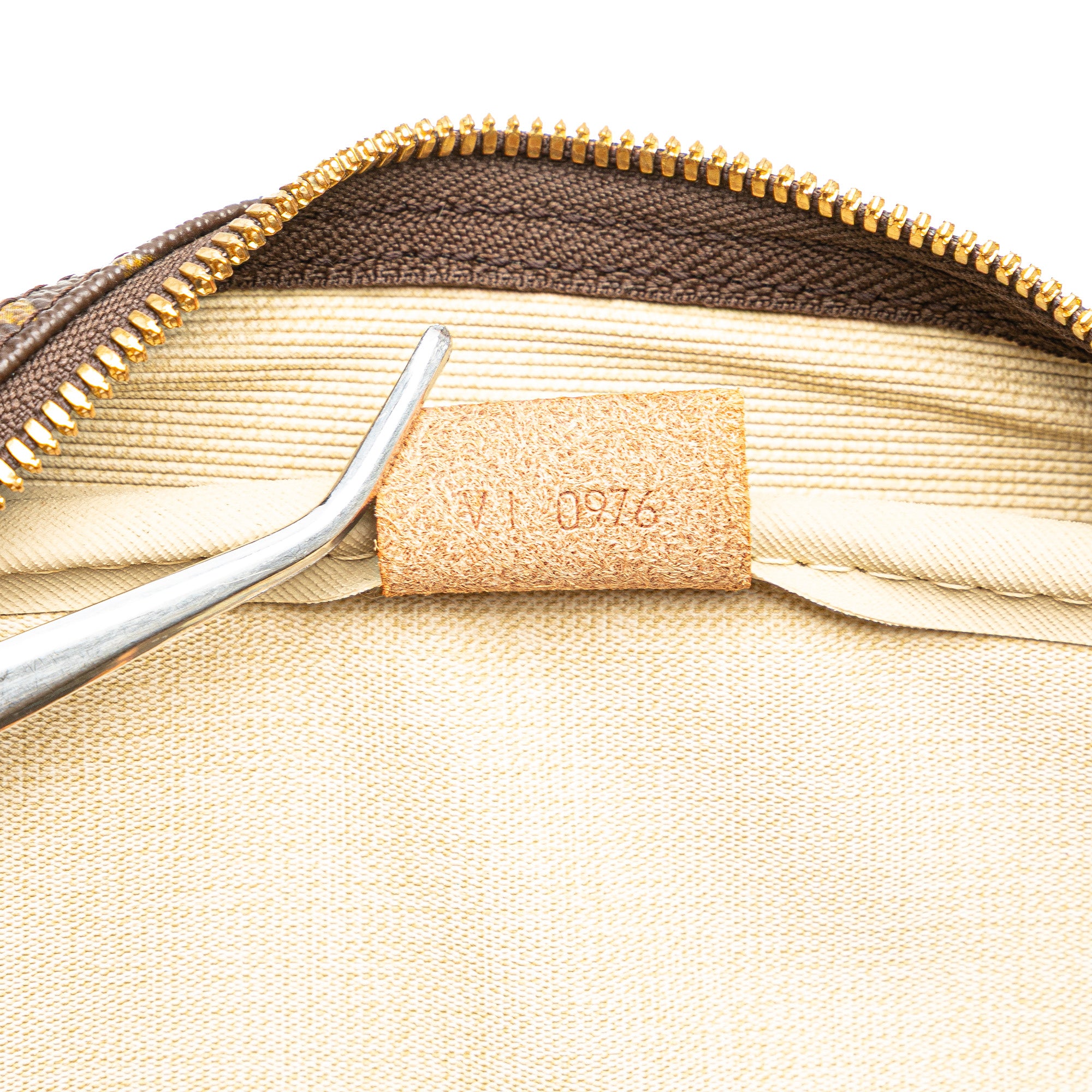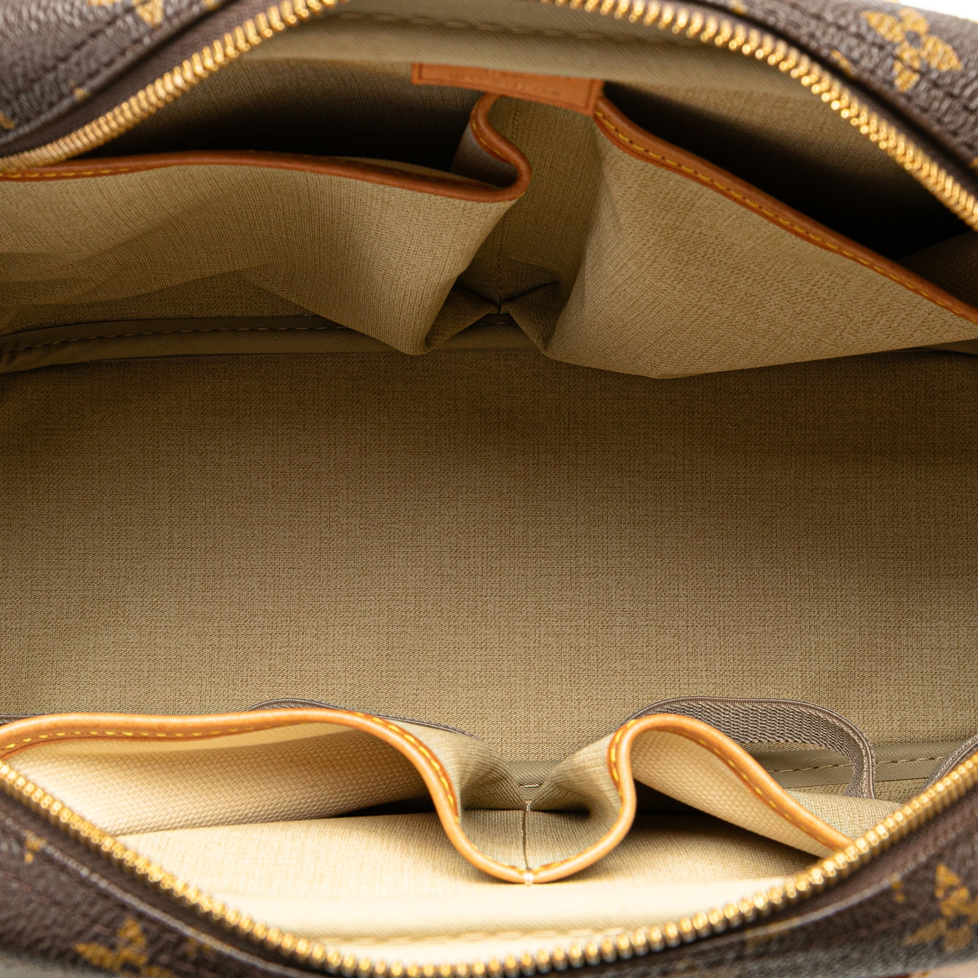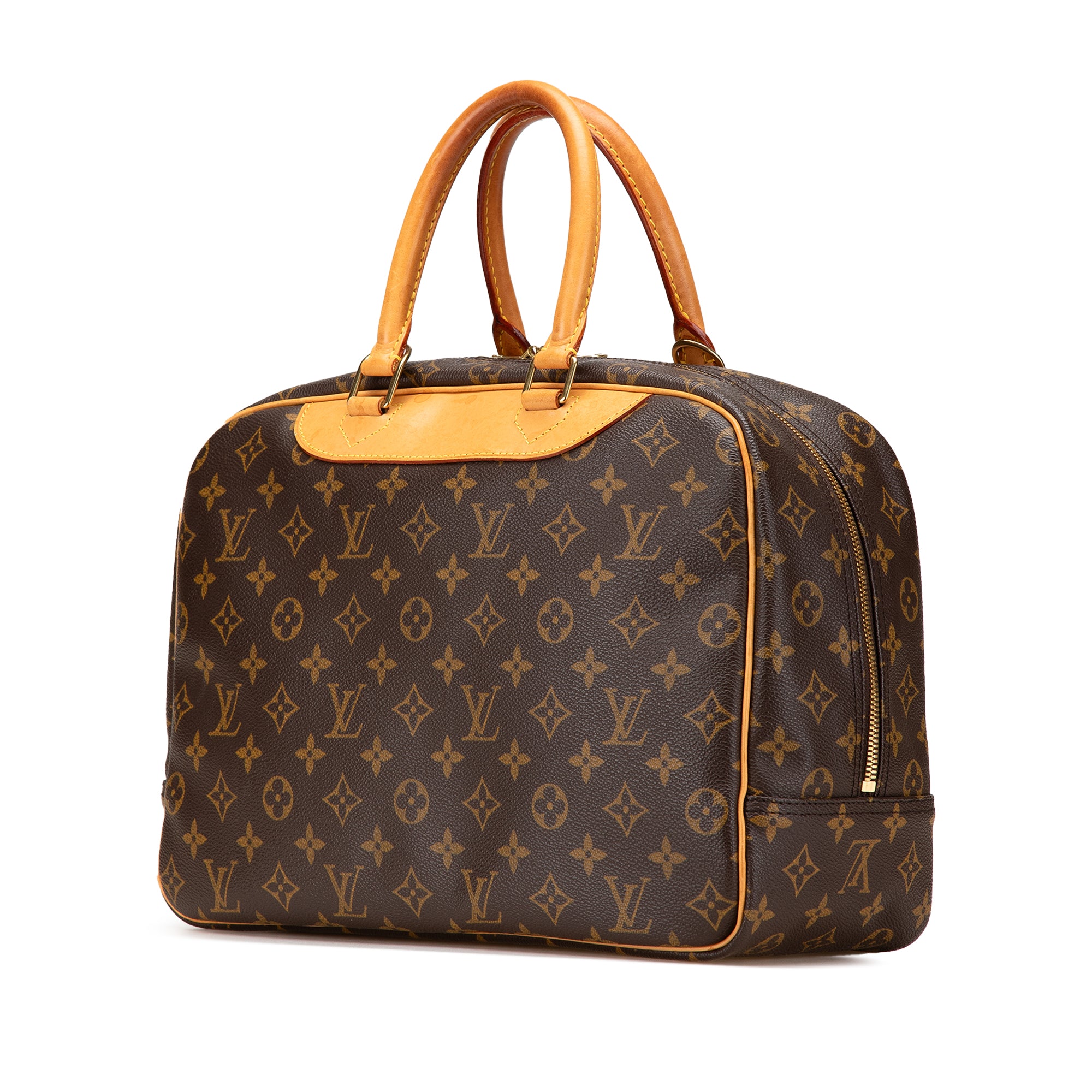 The Deauville features a monogram canvas body with vachetta leather trim, rolled vachetta leather handles, an exterior slip pocket, a top zip closure, and interior open pockets. Retail Price: 968.00