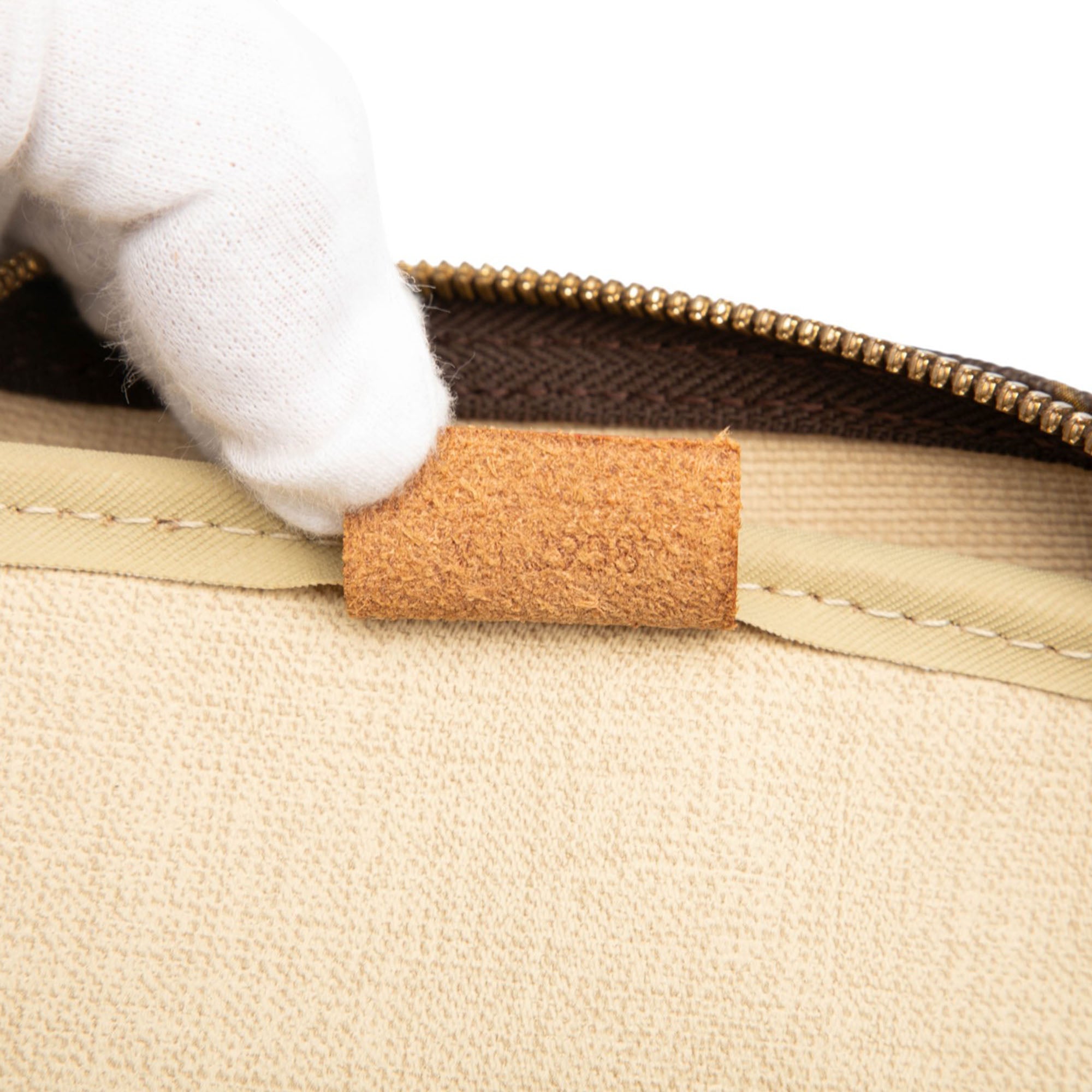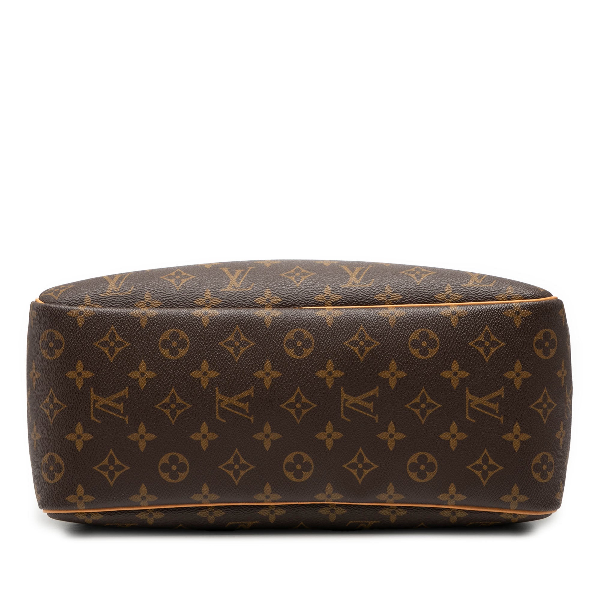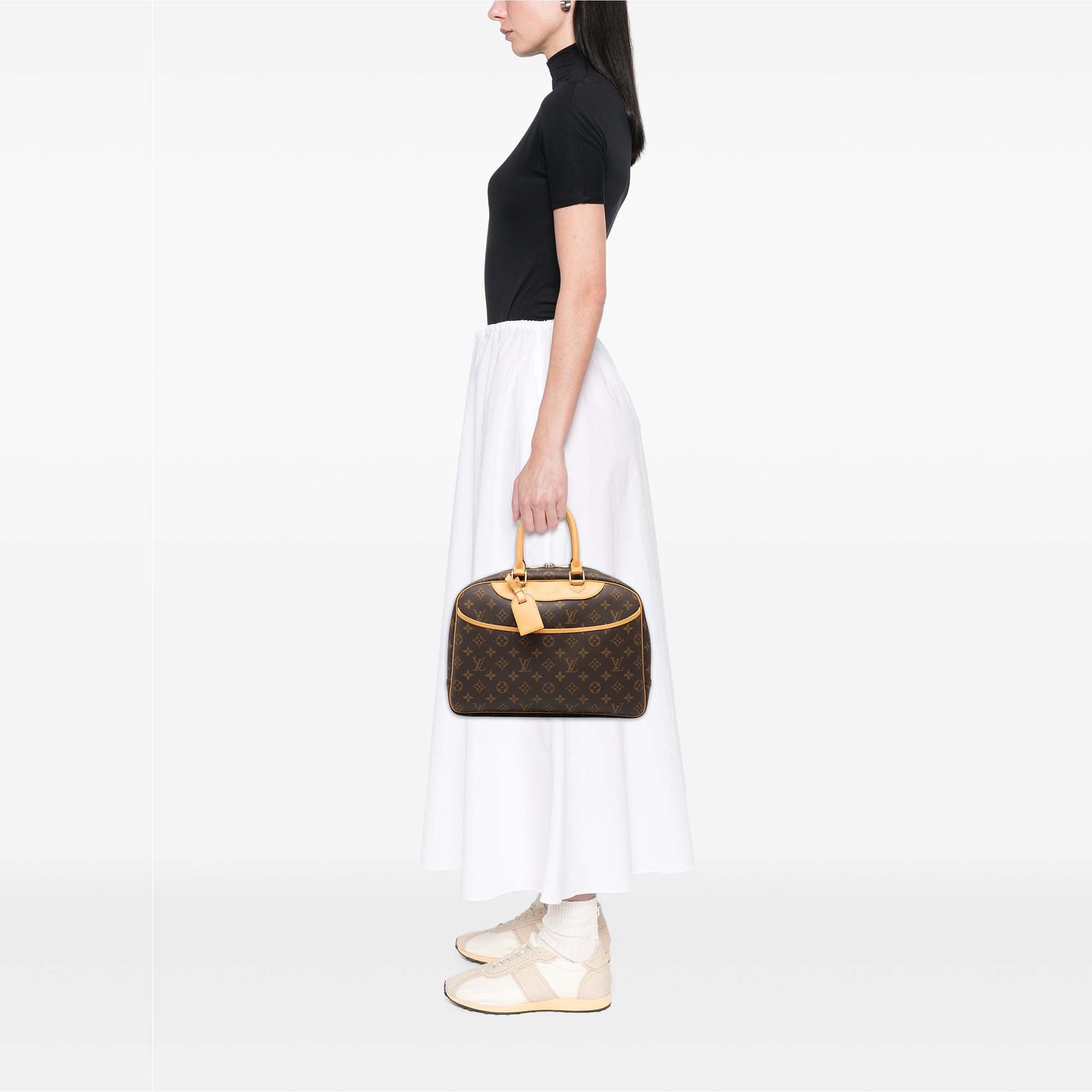 The Deauville features a monogram canvas body with vachetta leather trim, rolled vachetta leather handles, an exterior slip pocket, a top zip closure, and interior open pockets. Retail Price: 968.00