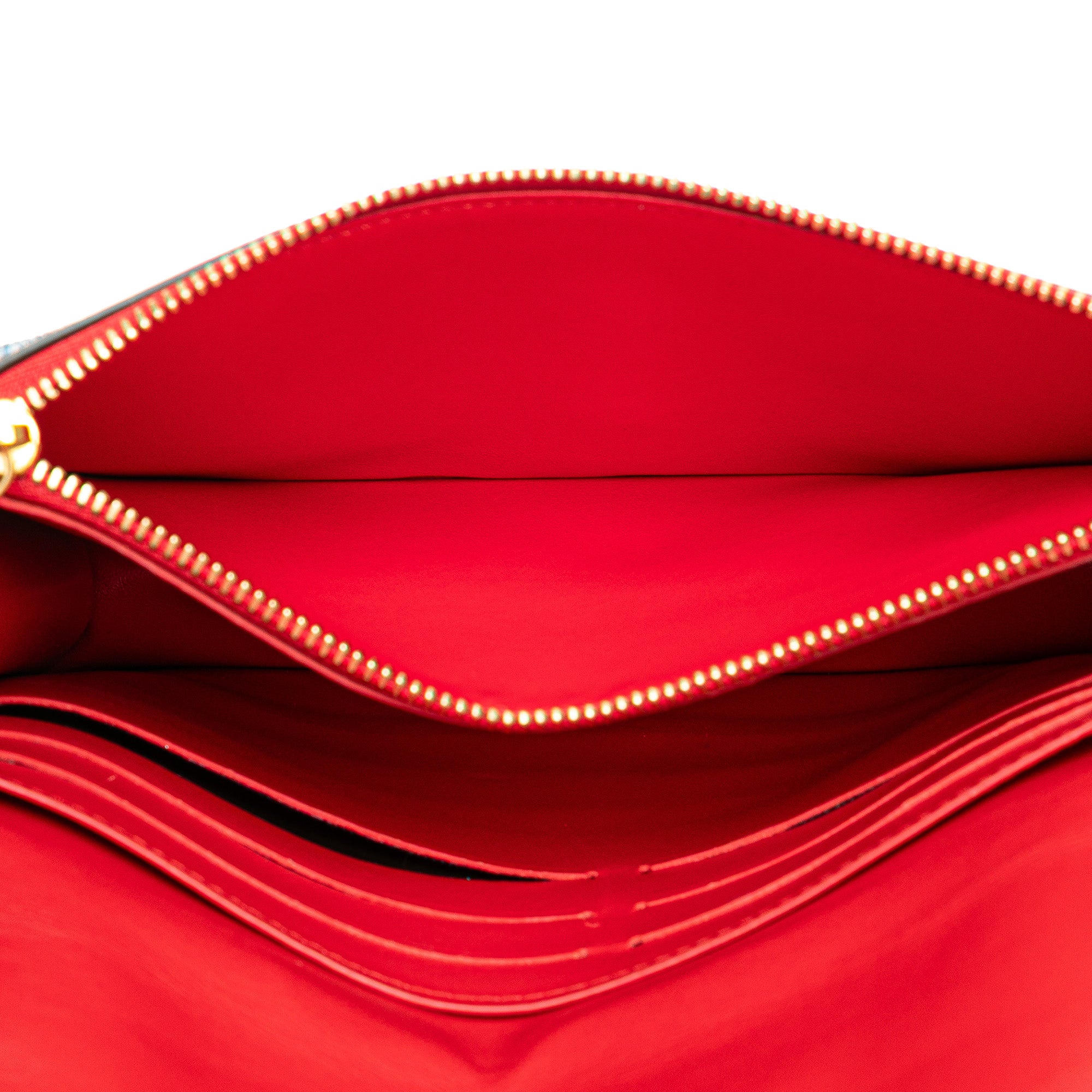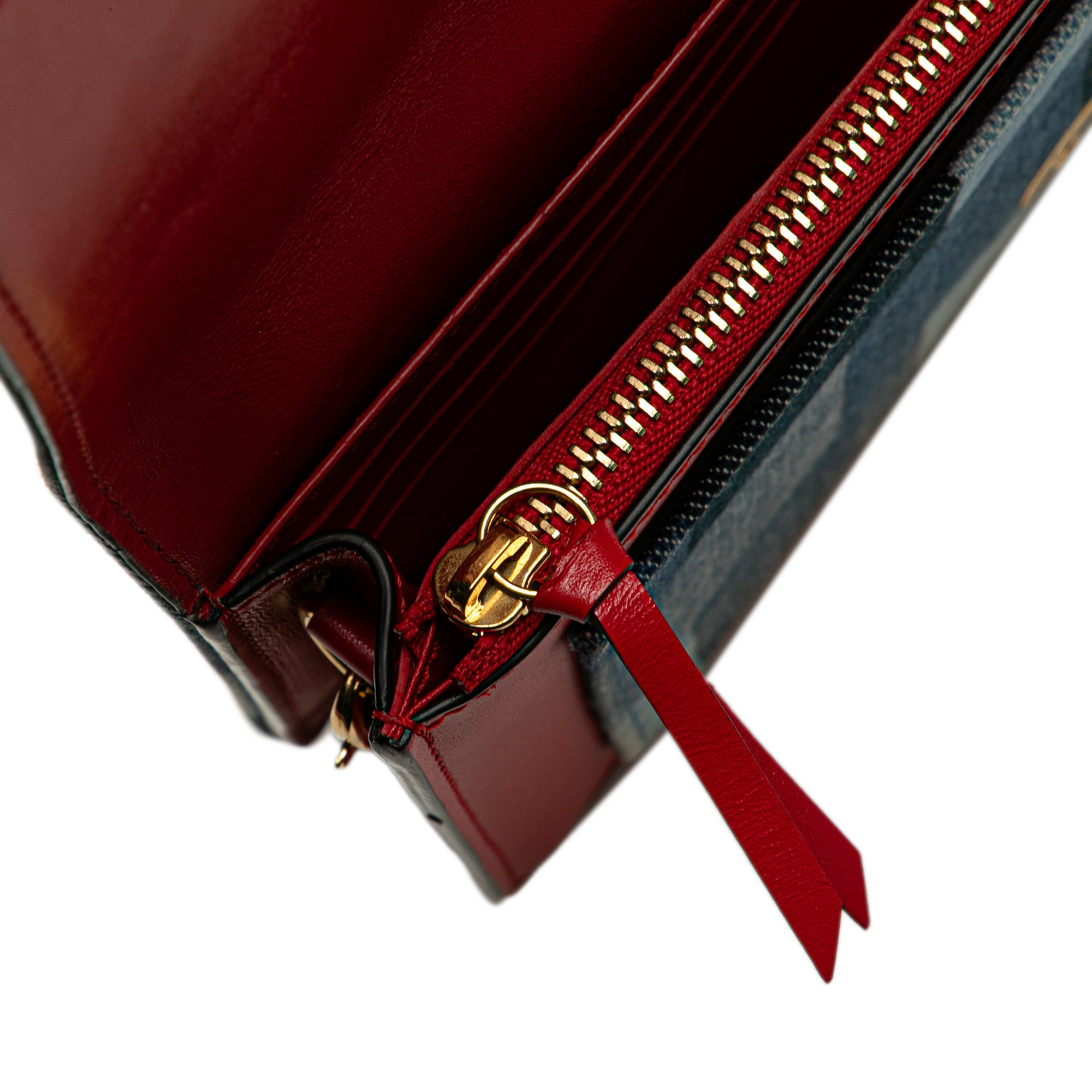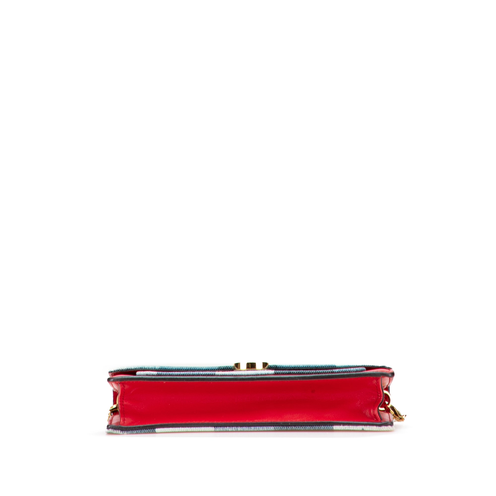 The Fiore Chain Wallet features a printed denim on monogram canvas body, a removable chain strap, a front flap with magnetic snap closure, an exterior front slip pocket, an interior zip compartment, an interior slip pocket, and card slots. Inclusion: Dust bag. Retail Price: 2270.00