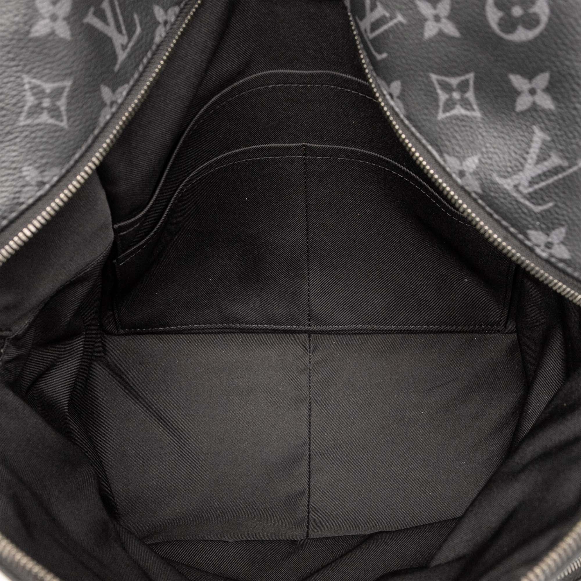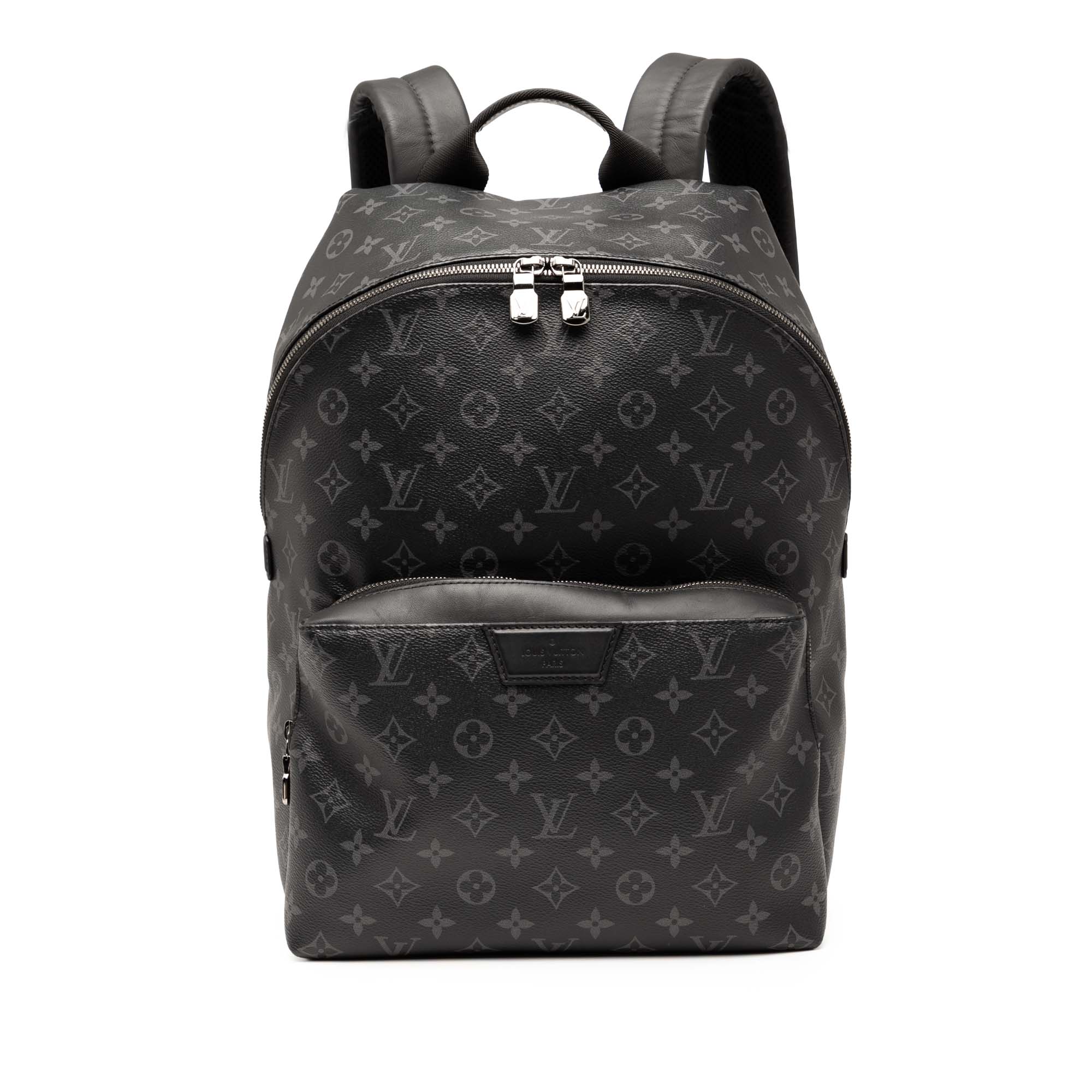 The Discovery backpack features a monogram eclipse canvas body, a top handle, adjustable leather back straps, a zip around closure, an exterior front zip and slip pockets, and interior slip pockets. Retail Price: 2500.00