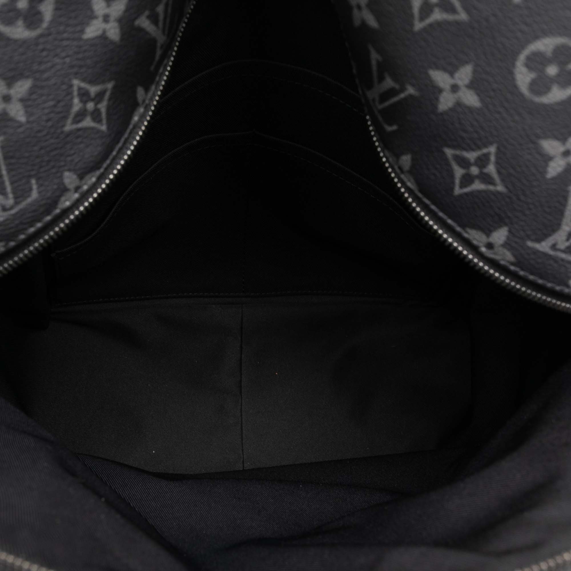 The Discovery backpack features a monogram eclipse canvas body, a top handle, adjustable leather back straps, a zip around closure, front exterior zip and slip pockets, and interior slip pockets. Retail Price: 2500.00