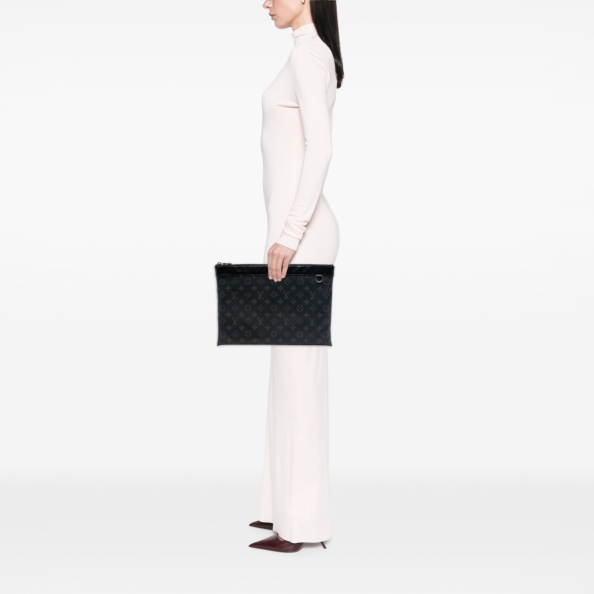 The Discovery Pochette features a monogram eclipse body with leather trim, a top zip closure, and an interior slip pocket. Retail Price: 1200.00