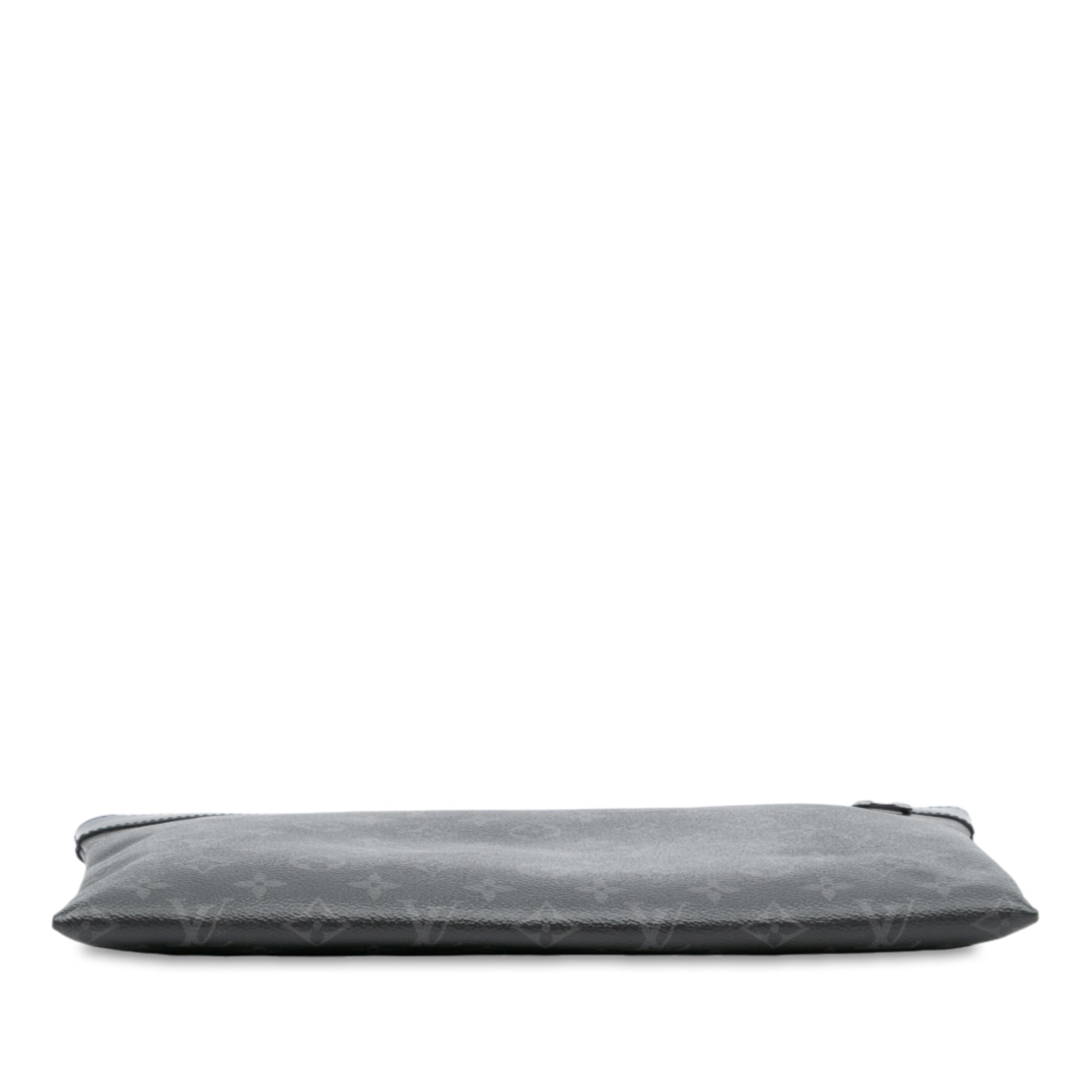 The Discovery Pochette GM features a monogram eclipse canvas body with leather trim, a top zip closure, and an interior slip pocket. Retail Price: 1200.00