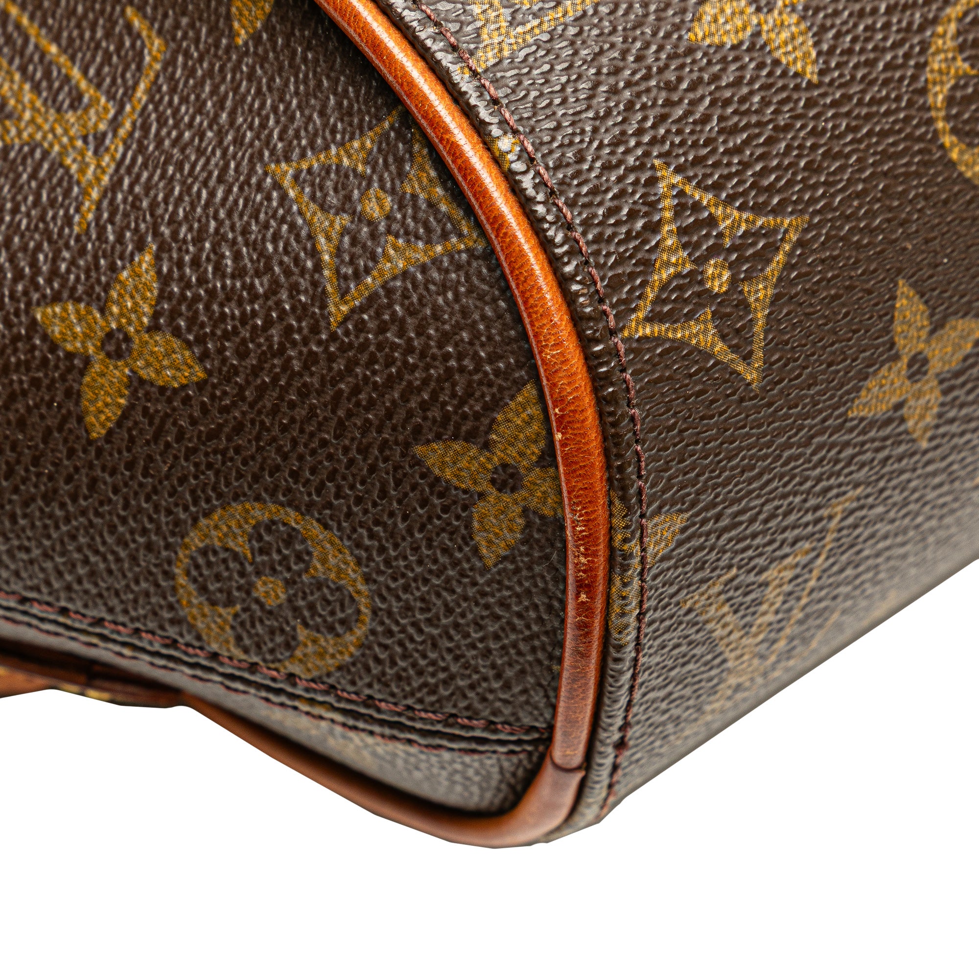 The Ellipse backpack features a monogram canvas body with vachetta leather trim, adjustable flat vachetta leather back straps, a top zip closure, and an interior slip pocket. Retail Price: 1027.00