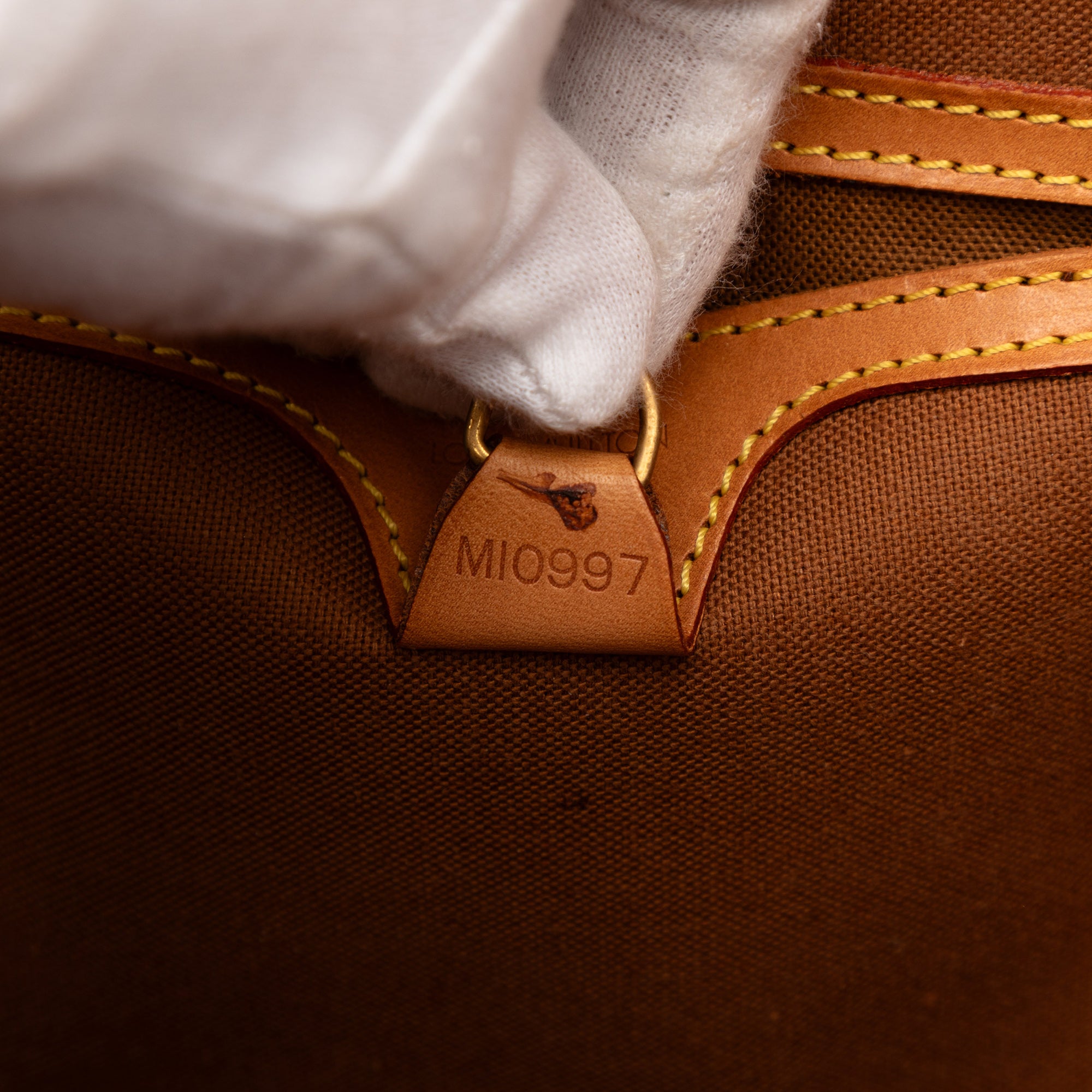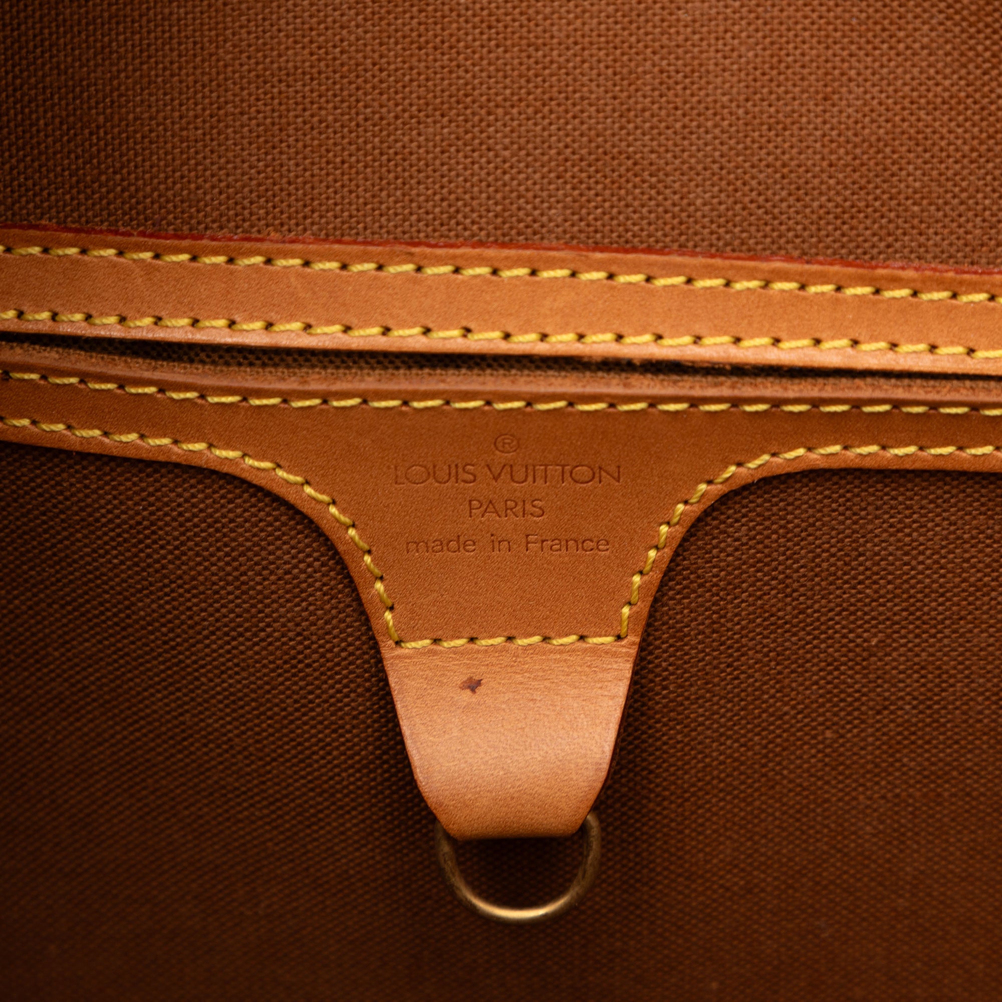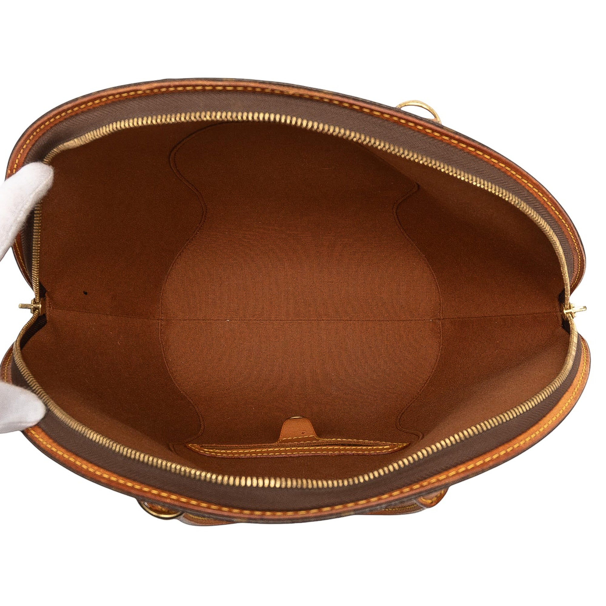 The Ellipse features a monogram canvas body with vachetta leather trim, rolled vachetta leather handles, a top zip closure, and an interior slip pocket. Retail Price: 1473.00