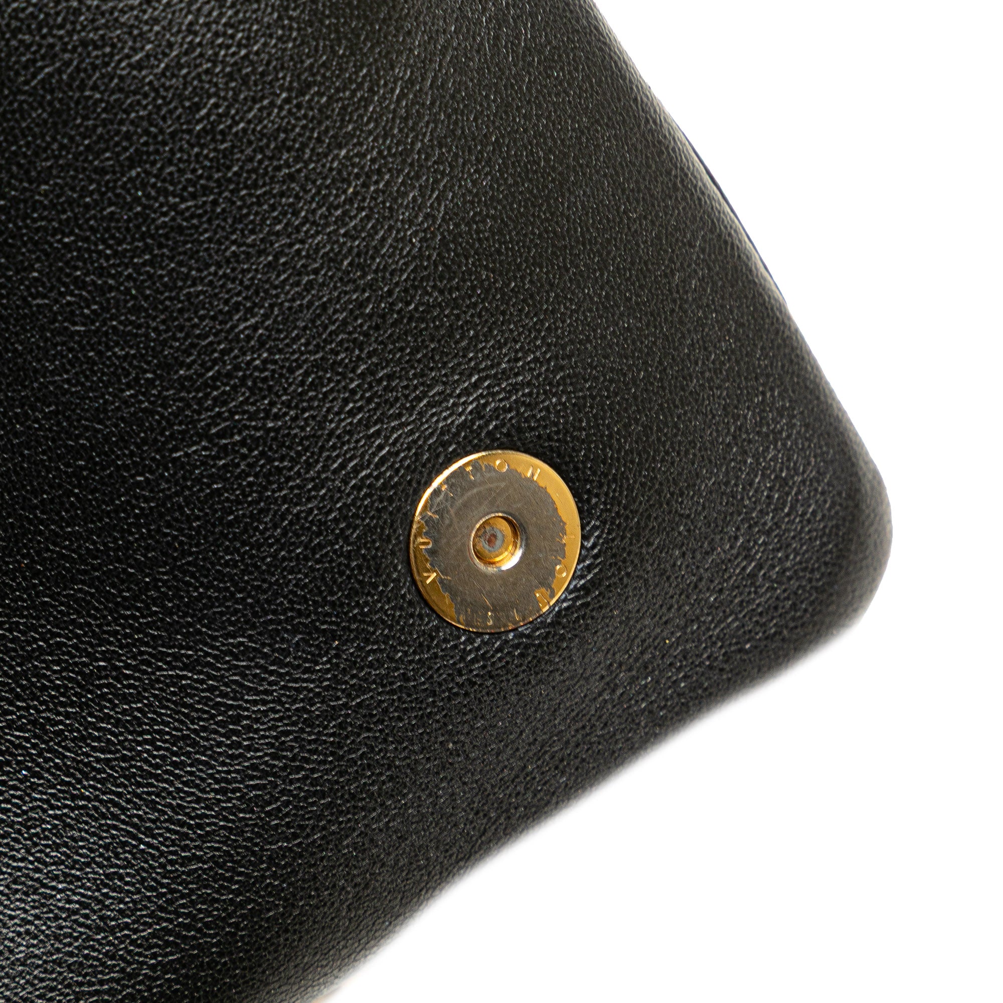 The Coussin features an embossed lambskin leather body, a detachable gold-tone chain link strap, a front flap with magnetic snap closures, and interior zip and slip pockets. Retail Price: 3100.00