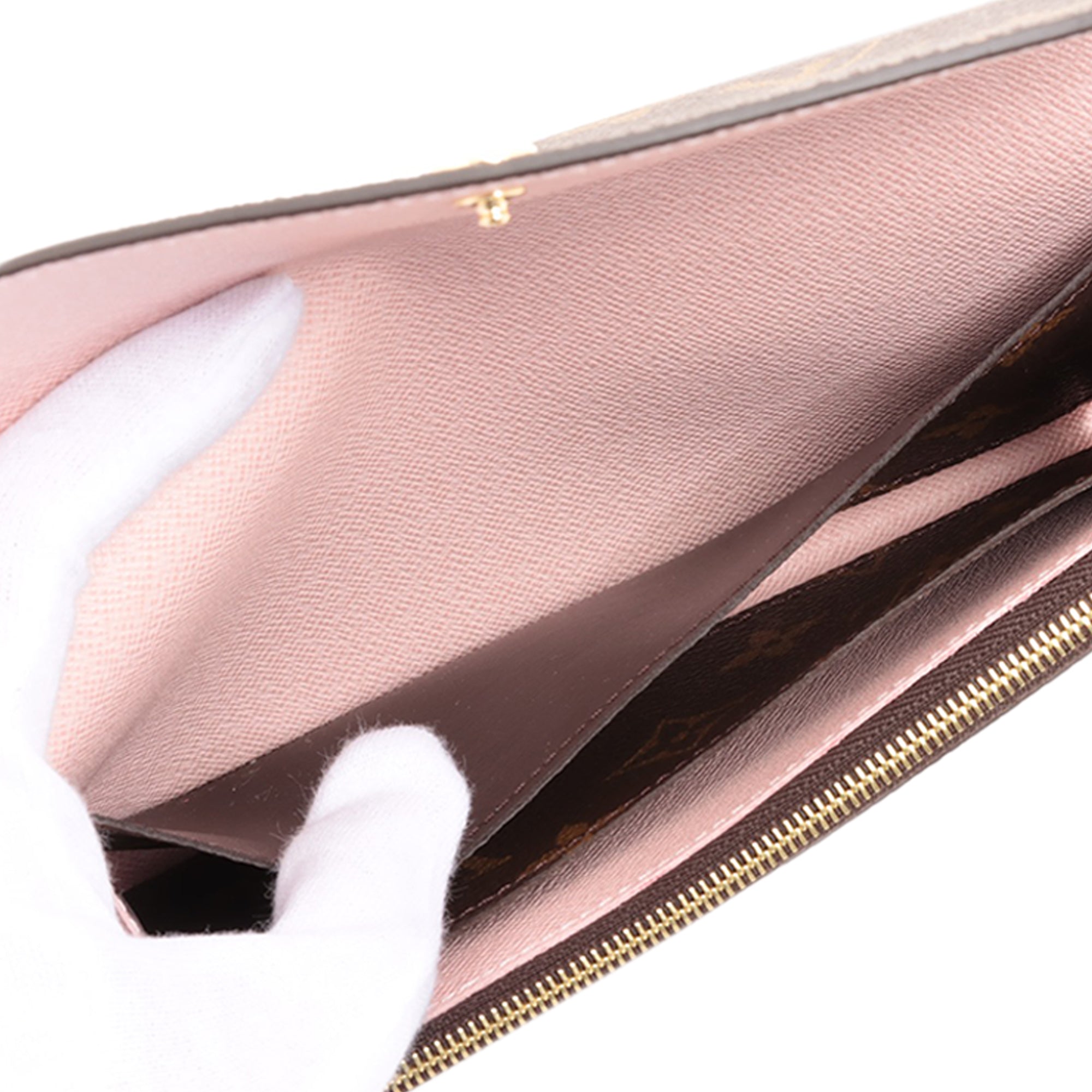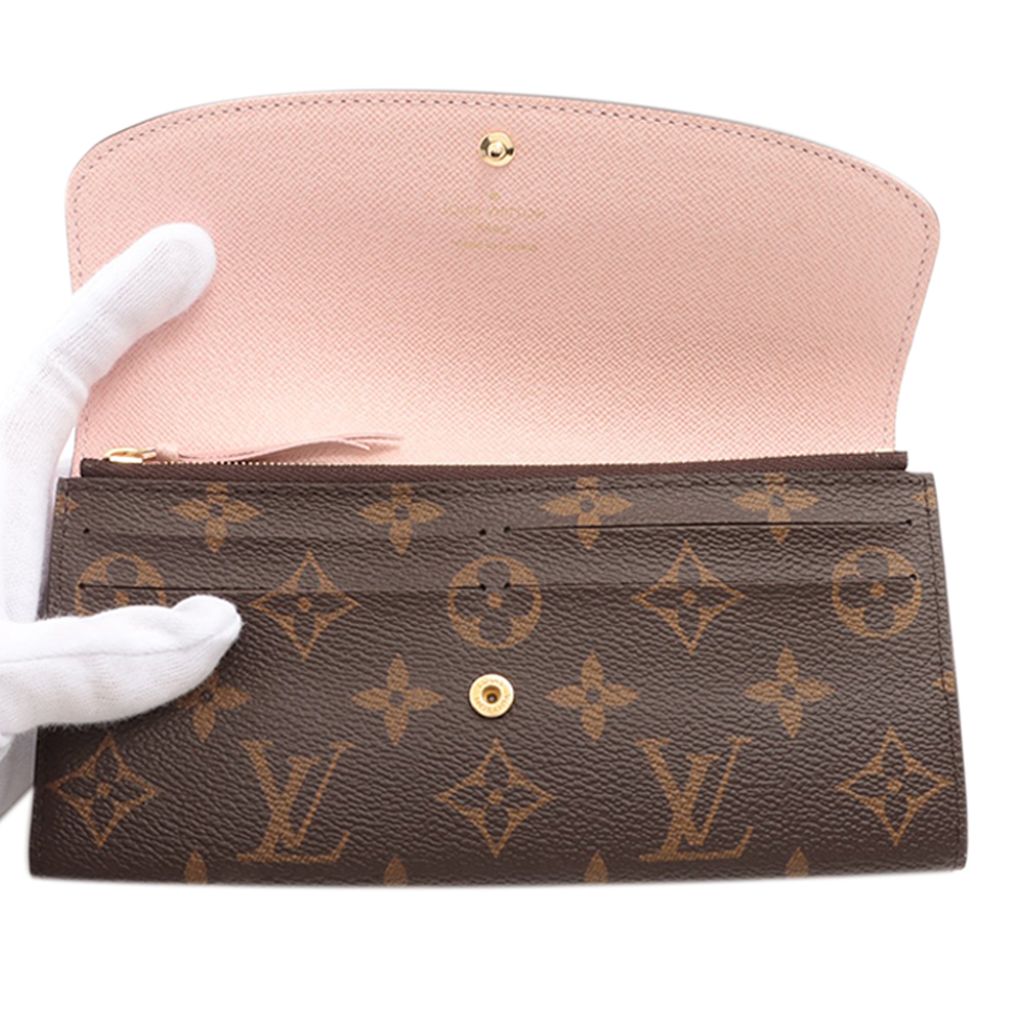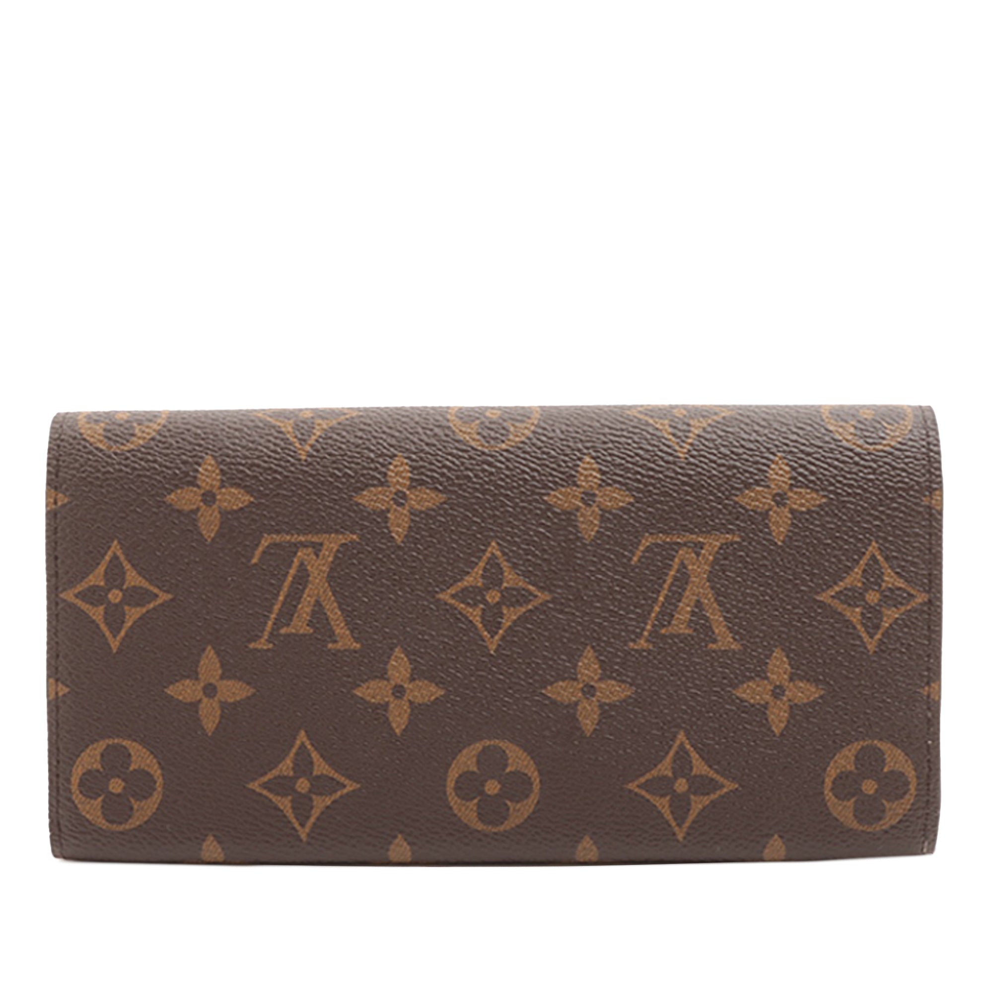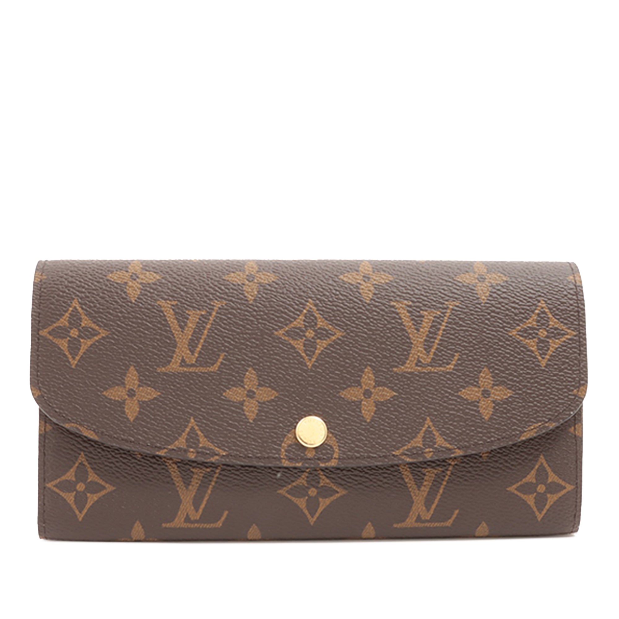 The Emilie wallet features a monogram canvas body, a front flap with snap button closure, and interior zip and slip pockets. Inclusion: Dust bag, box. Retail Price: 615.00