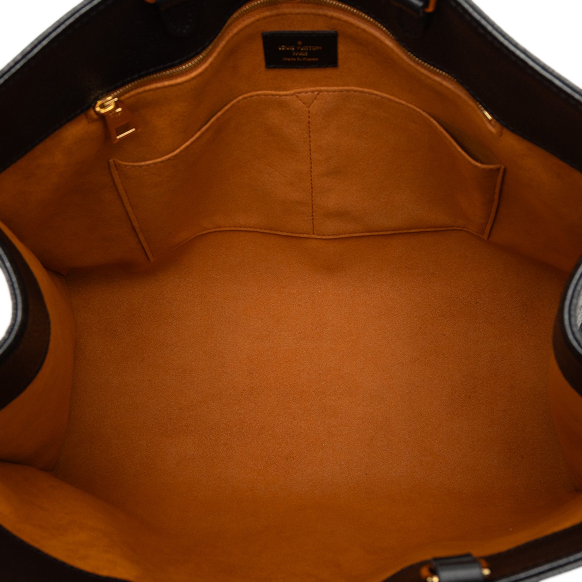 The Onthego features a monogram empreinte body, rolled handles, flat shoulder straps, a detachable flat strap, an open top with lobster clasp closure, and interior zip and slip pockets. Retail Price: 3500.00