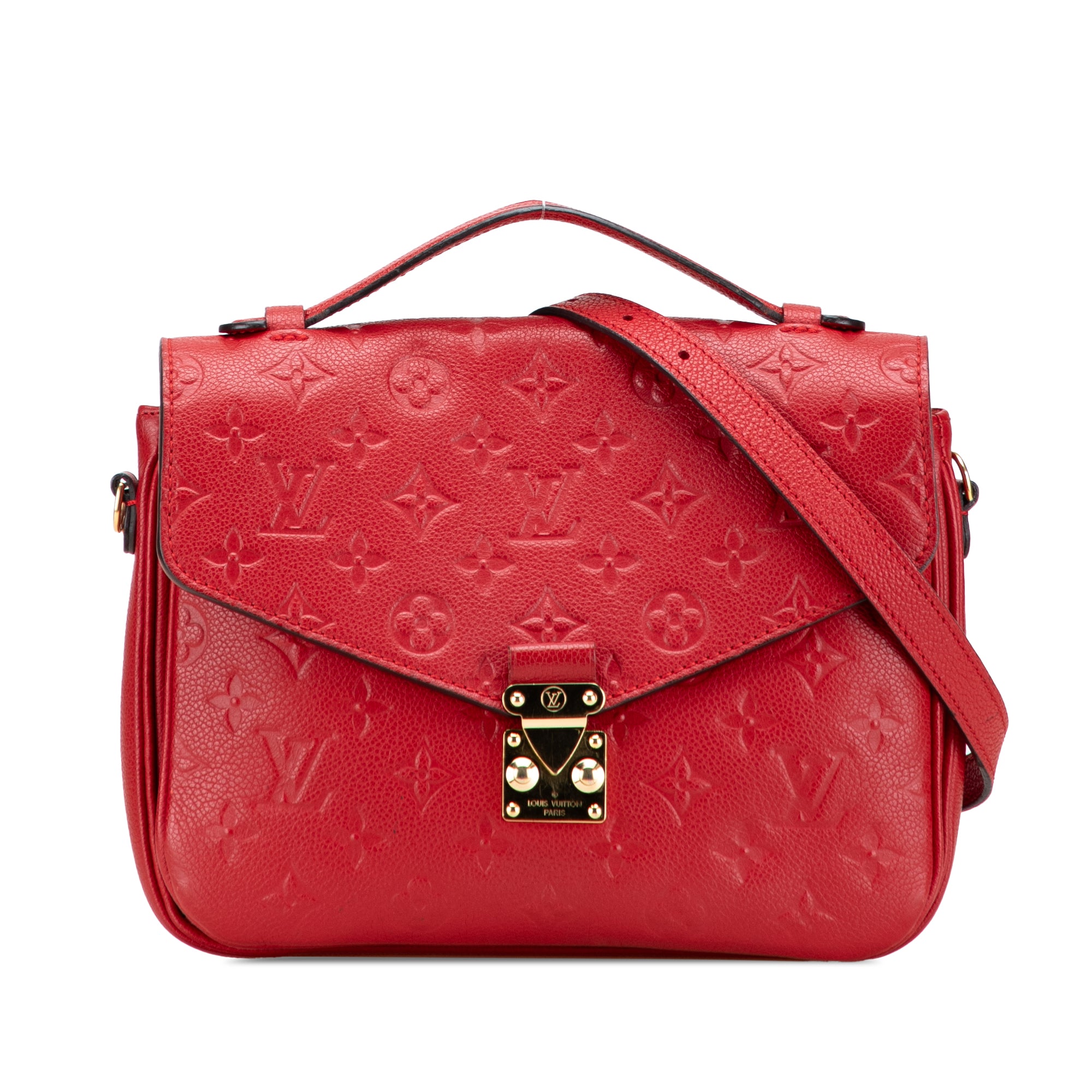 The Pochette Metis features a monogram empreinte leather body, a flat leather top handle, a detachable flat leather strap, a front flap with an S-lock closure, an exterior back zip pocket, open compartments, and an interior slip pocket. Retail Price: 2820.00