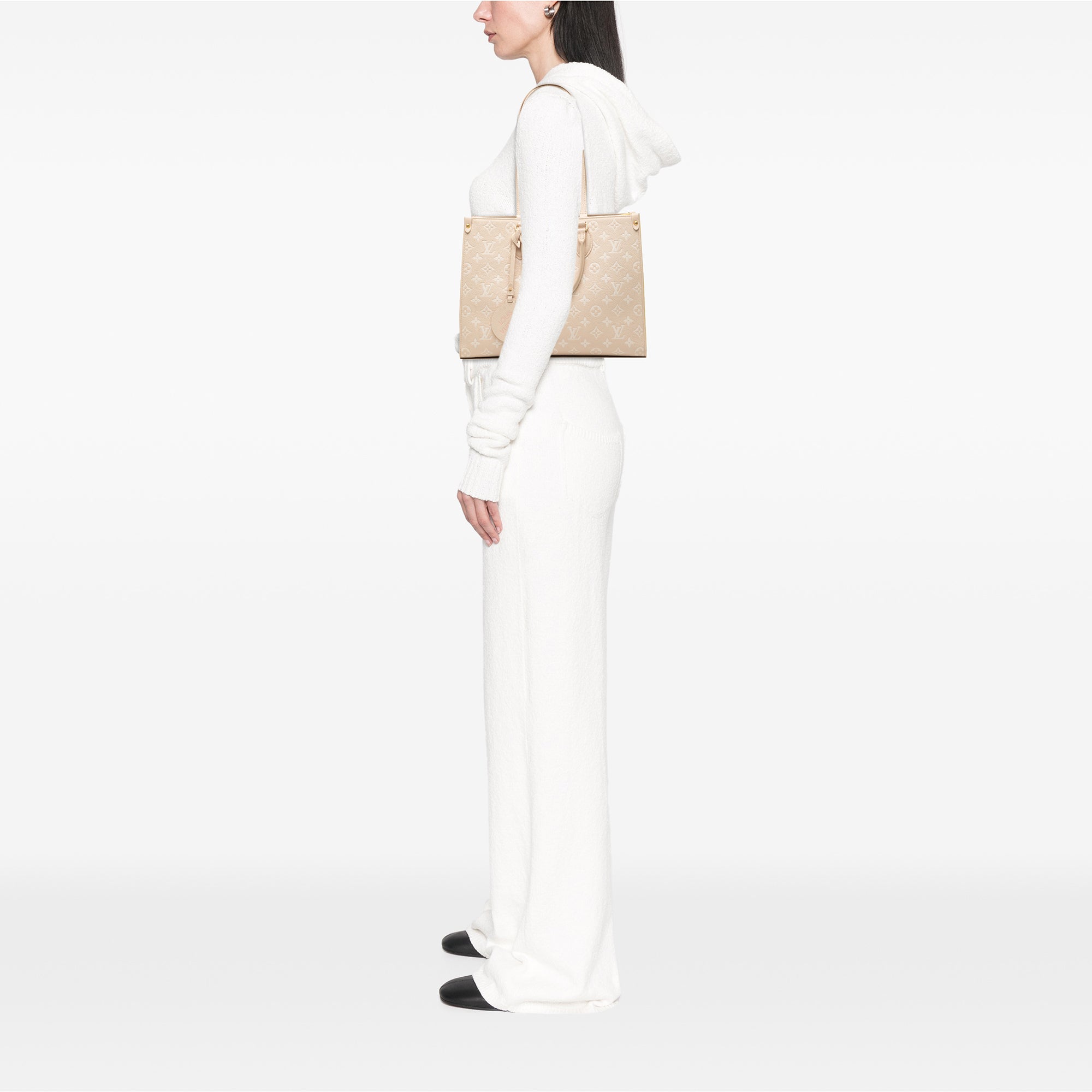 The Spring In The City Onthego MM features a monogram empreinte leather body, rolled leather handles, flat leather shoulder straps, an open top with a lobster clasp closure, and interior zip and slip pockets. Retail Price: 3650.00