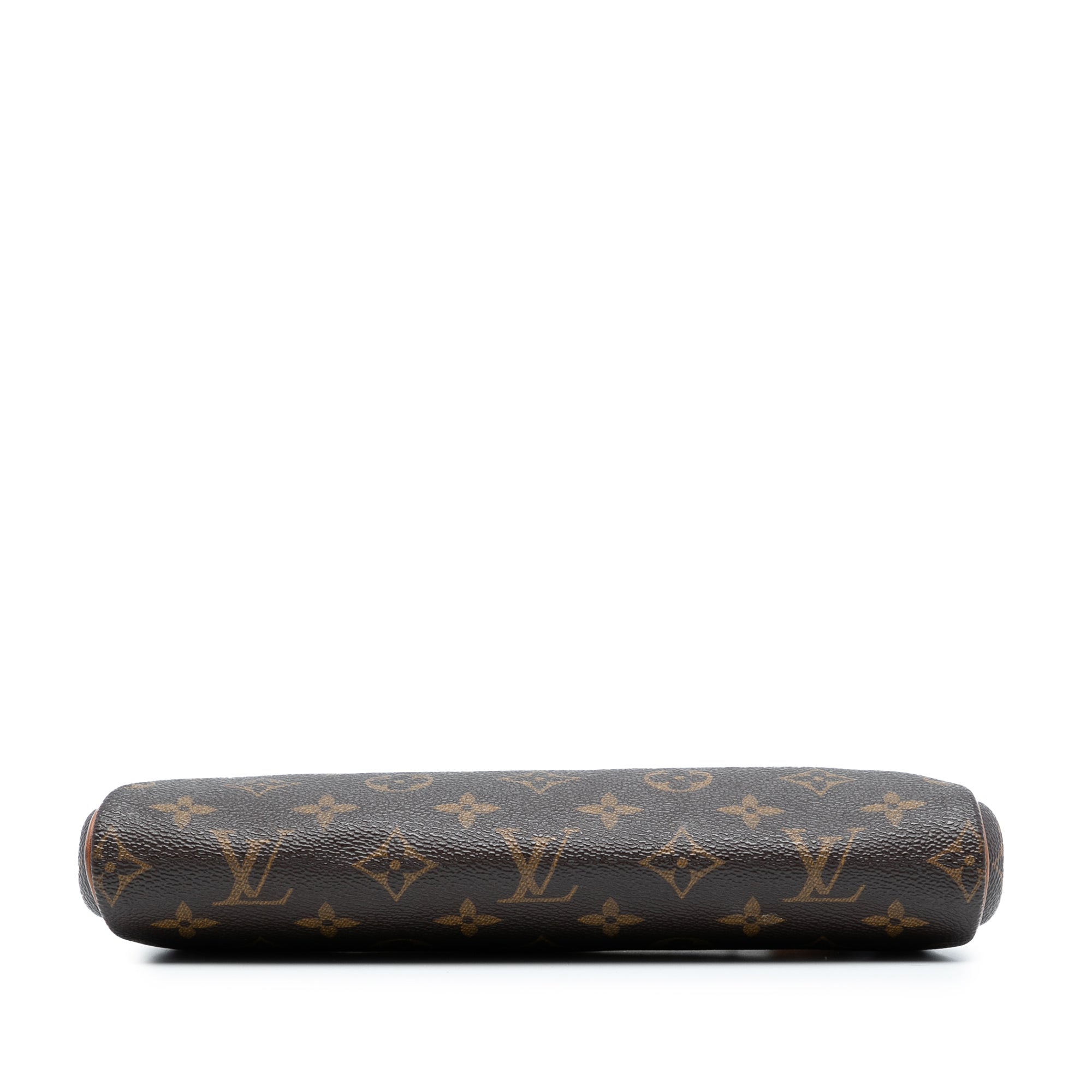 The Eva features a monogram canvas body with vachetta leather trim, a gold-tone chain link strap, a detachable flat vachetta leather strap, and a top zip closure. Retail Price: 1895.00