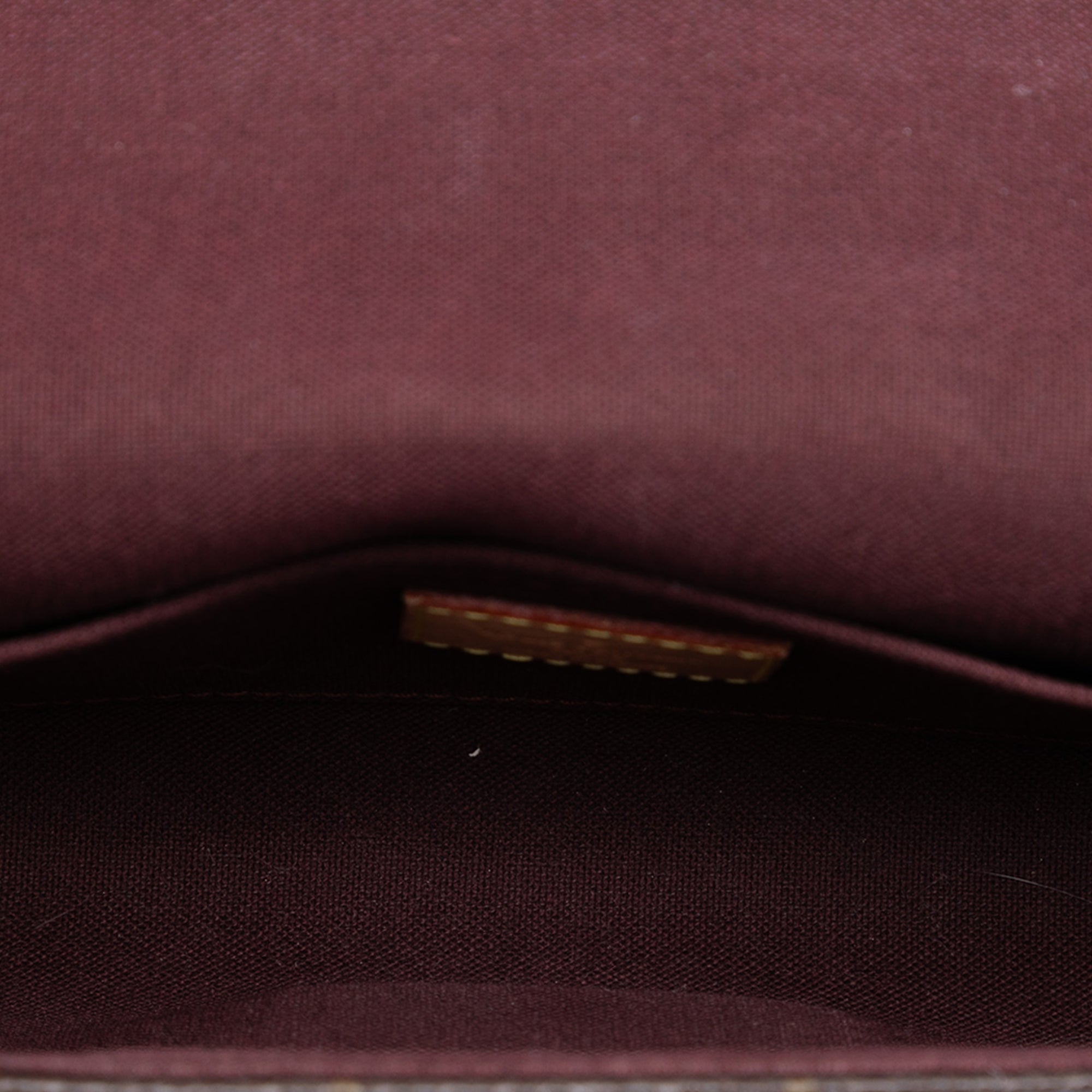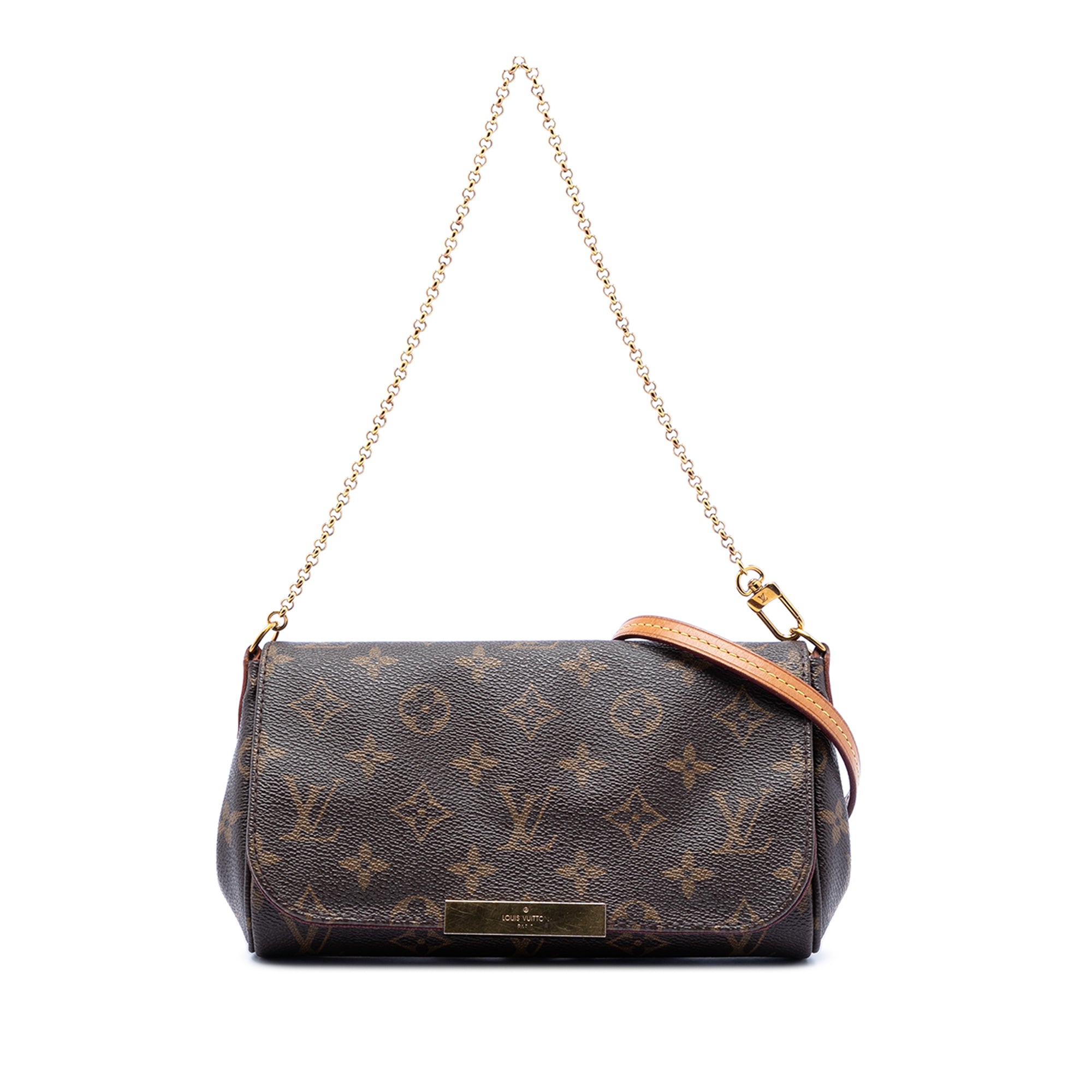 The Favorite features a monogram canvas body, a detachable flat vachetta leather shoulder strap, a chain link shoulder strap, a flap with magnetic snap closure, and an interior slip pocket. Retail Price: 1975.00