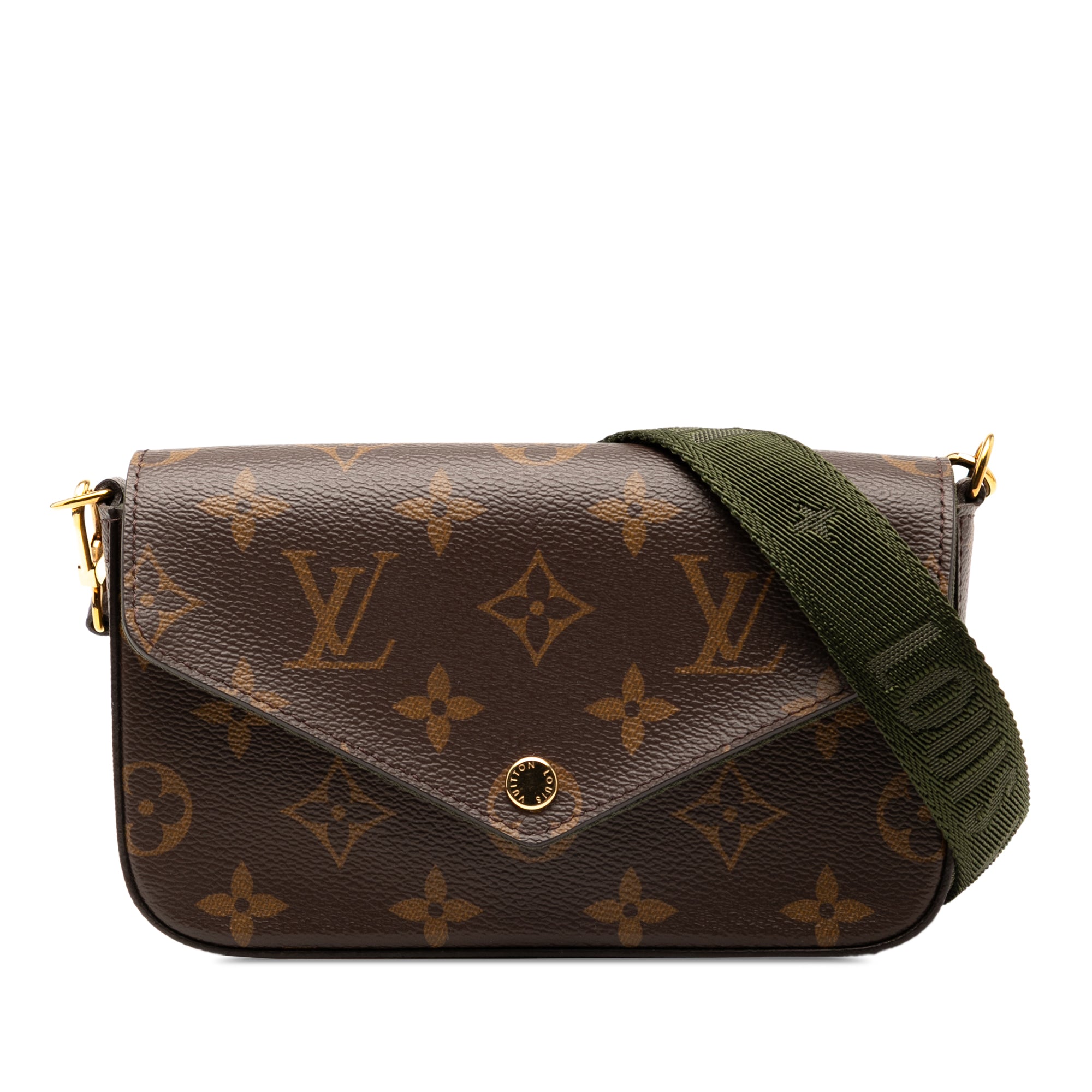 The Felicie Strap and Go features a monogram canvas body, an adjustable and detachable flat strap, a front flap with snap closure, an interior slip pocket, and interior card slots. It comes with a detachable flap pouch with snap closure. Inclusion: Dust bag. Retail Price: 2450.00