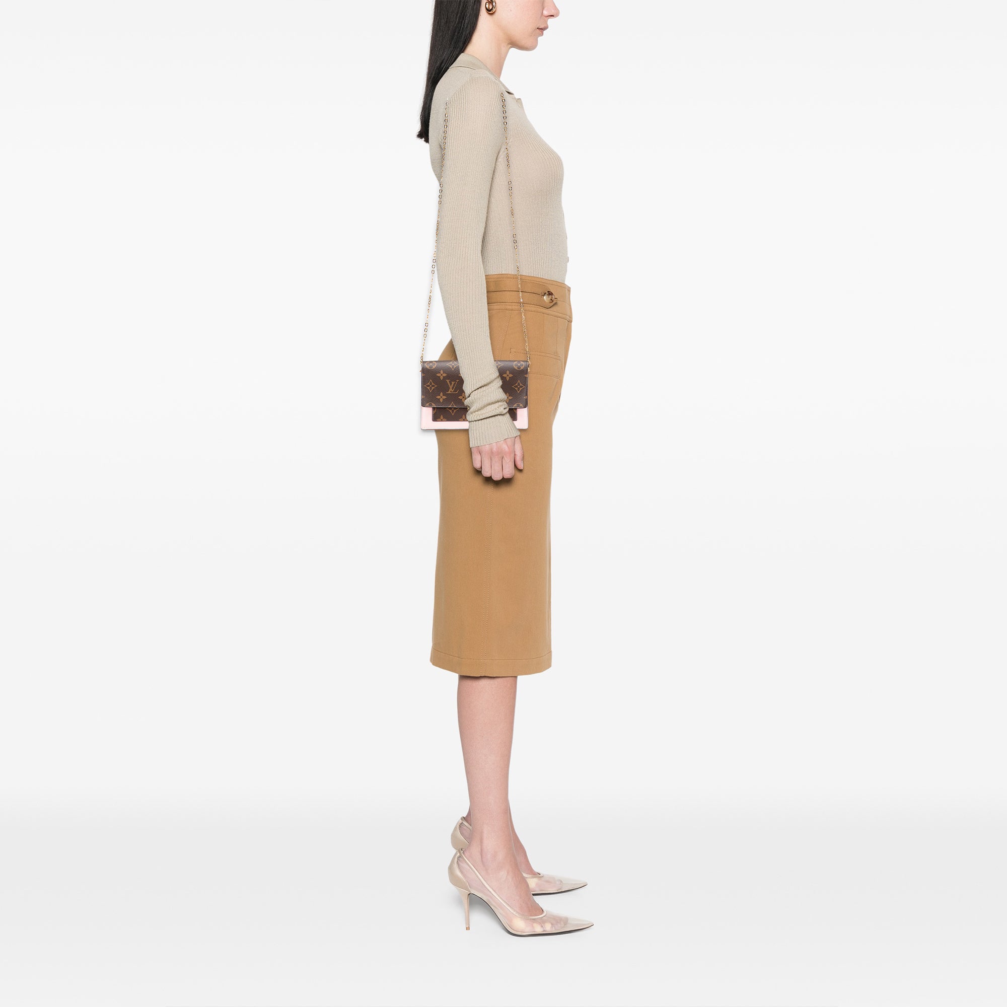 The Flore crossbody bag features a monogram canvas body with leather trim, a chain link shoulder strap, a front flap with magnetic snap closure, and interior zip and slip pockets. Retail Price: 1990.00