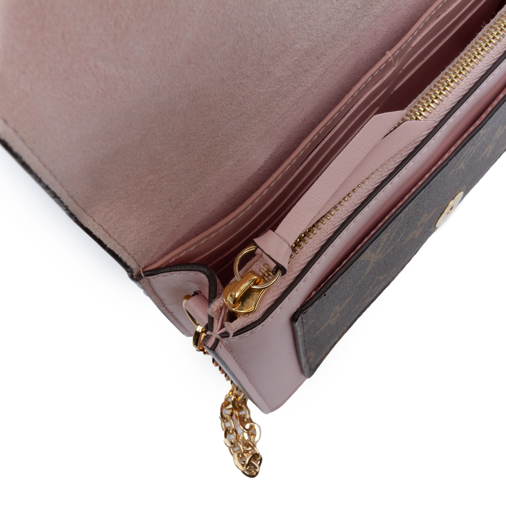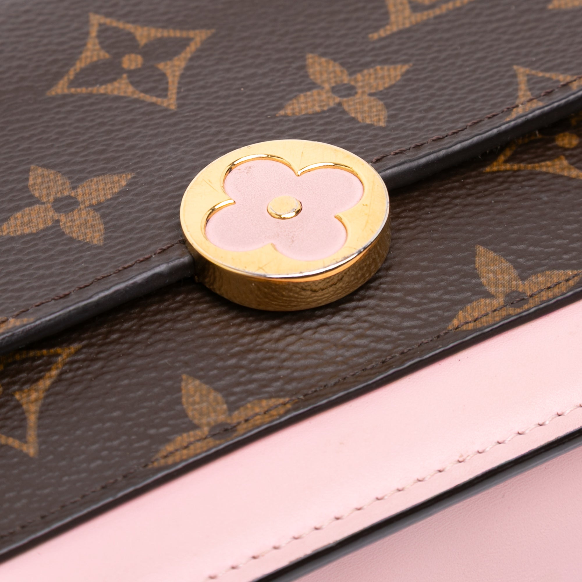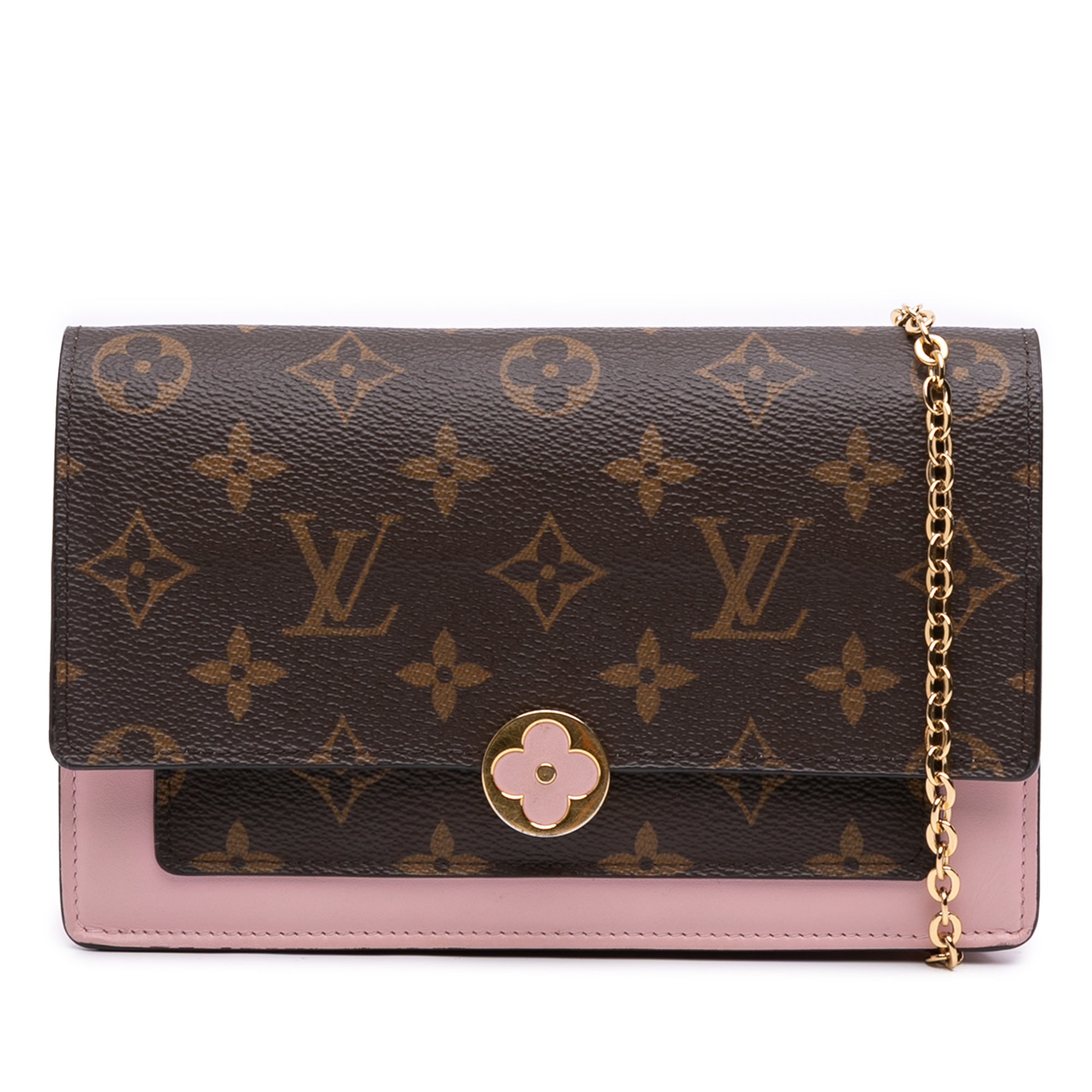 The Flore crossbody bag features a monogram canvas body with leather trim, a chain link shoulder strap, a front flap with snap closure, and interior zip and slip pockets. Inclusion: Dust bag. Retail Price: 1990.00
