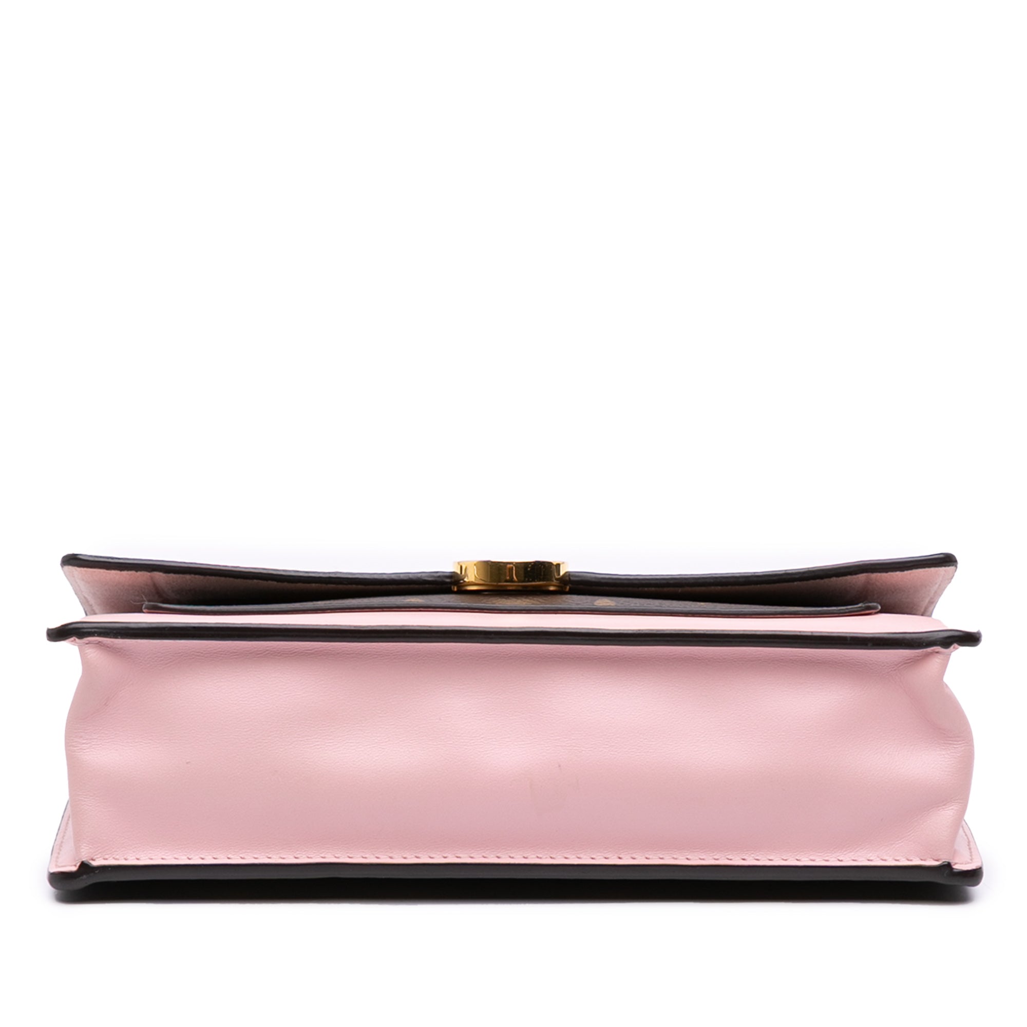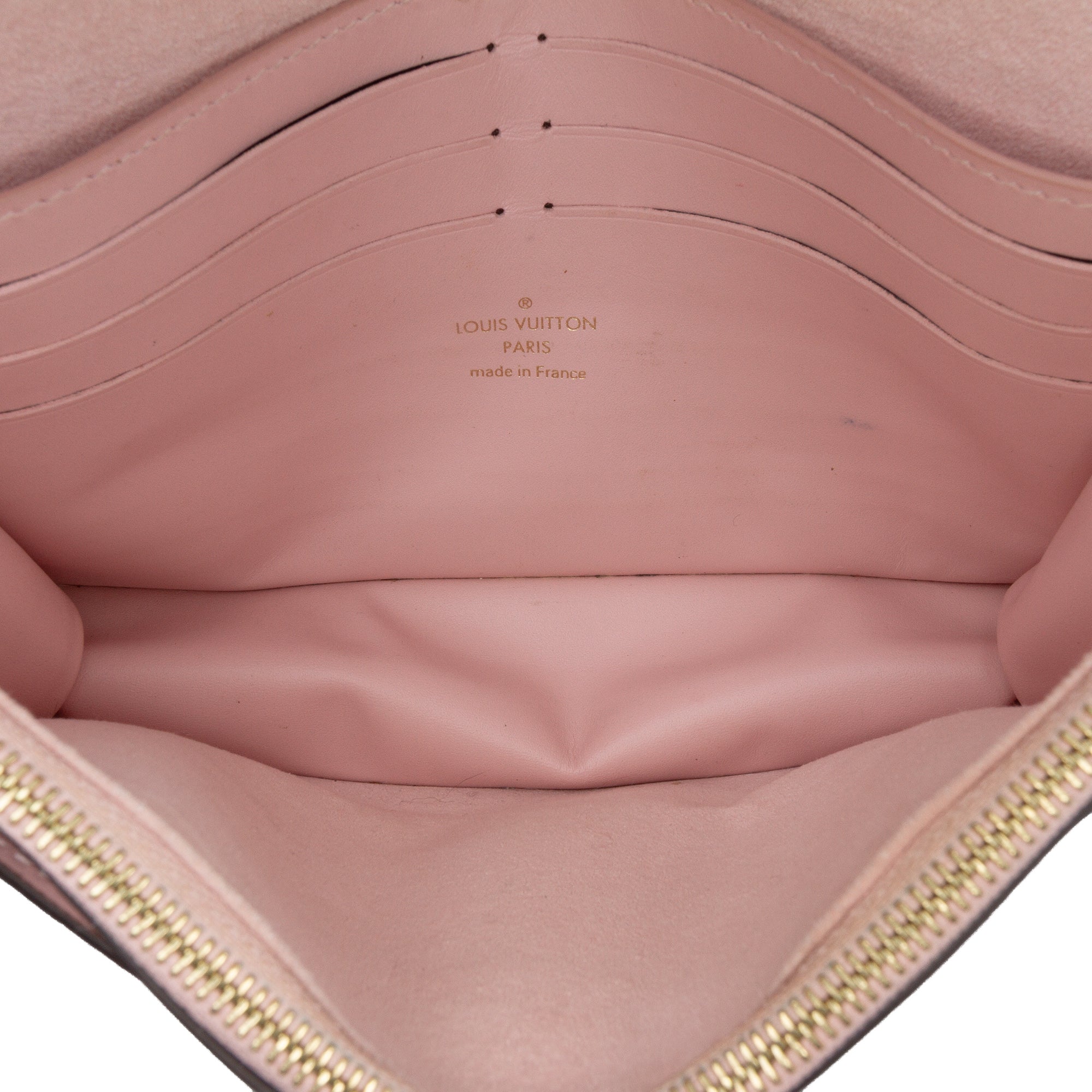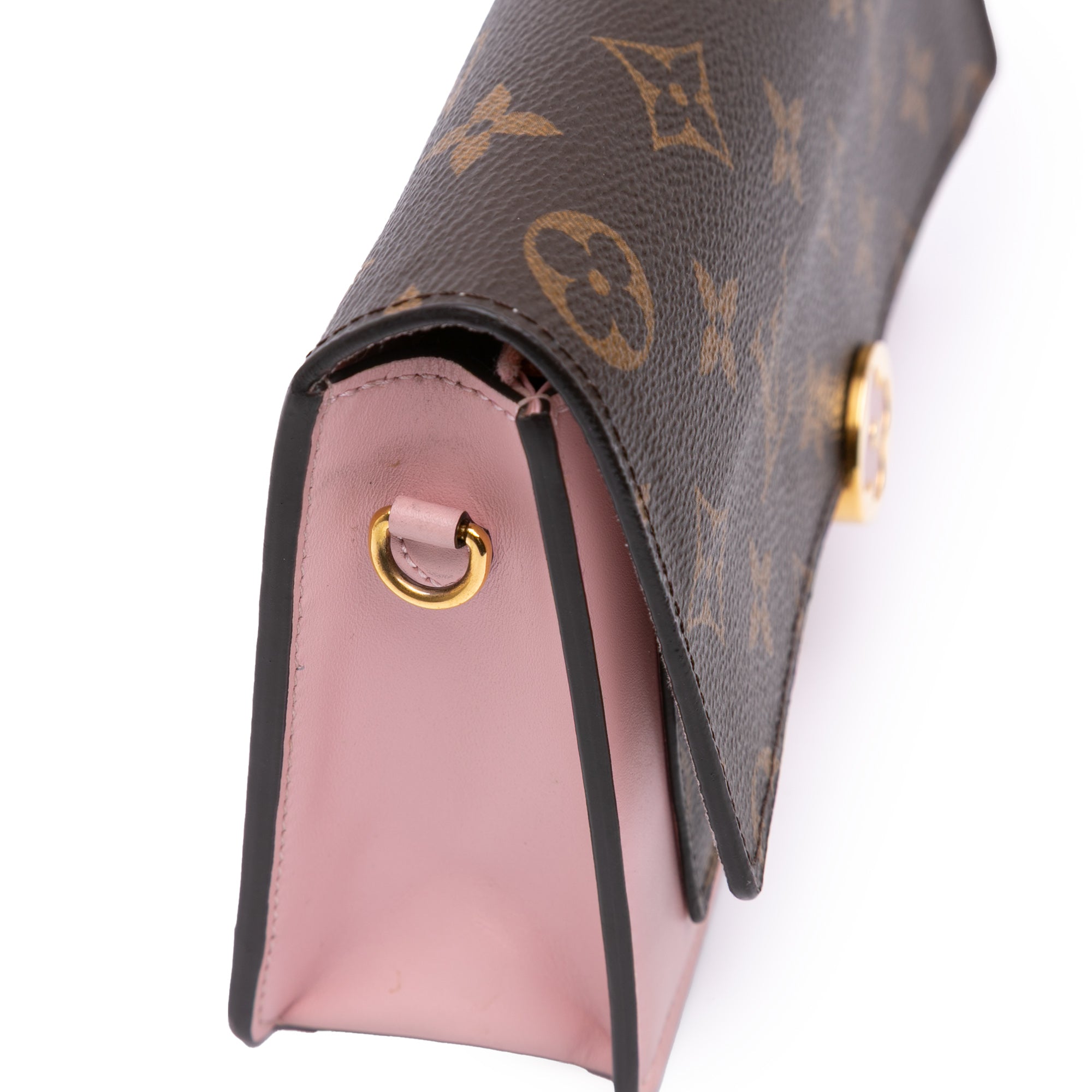 The Flore crossbody bag features a monogram canvas body with leather trim, a chain link shoulder strap, a front flap with snap closure, and interior zip and slip pockets. Inclusion: Dust bag. Retail Price: 1990.00