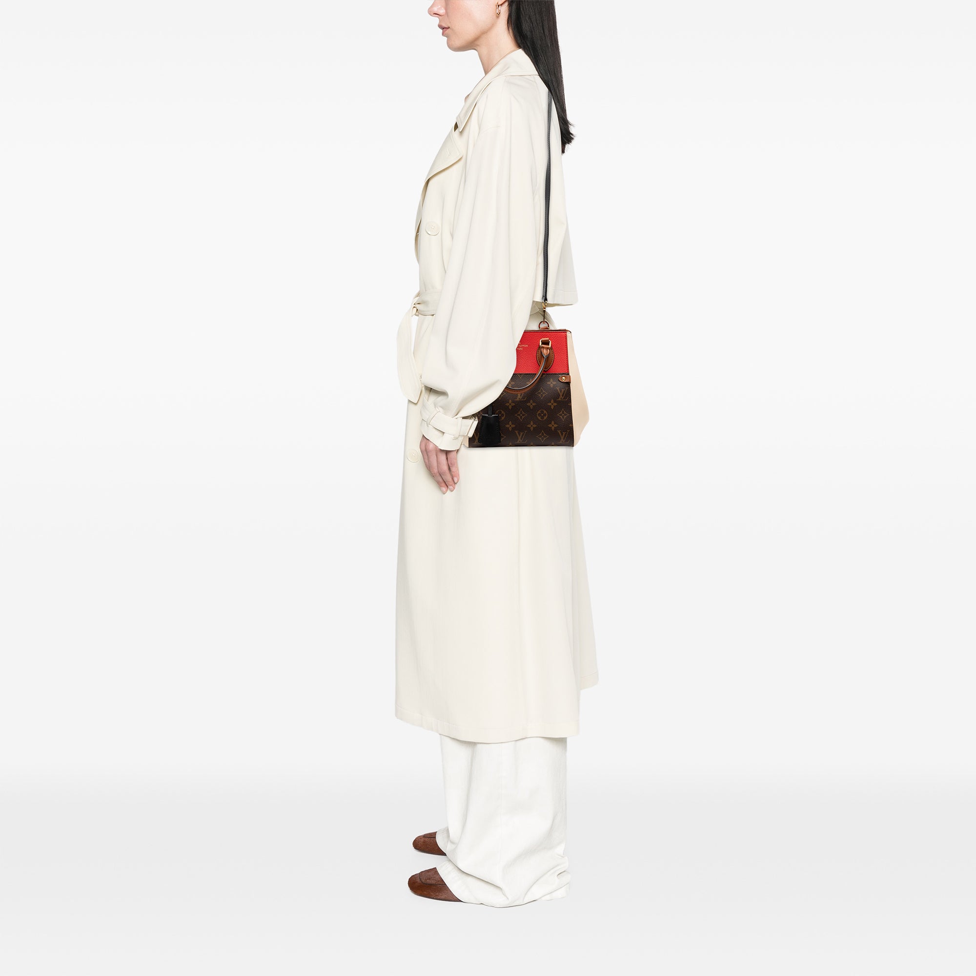The Fold Tote PM features a monogram canvas body with top leather panel, rolled leather handles, a detachable flat strap, a hook closure, and interior zip and slip pockets. Retail Price: 3785.00
