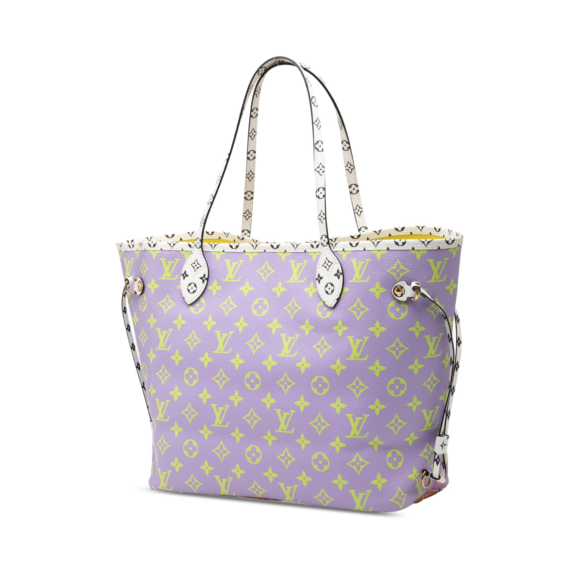 The Giant Neverfull MM features a monogram canvas body, flat leather handles, a top lobster claw clasp closure, and an interior zip pocket. Retail Price: 2675.00
