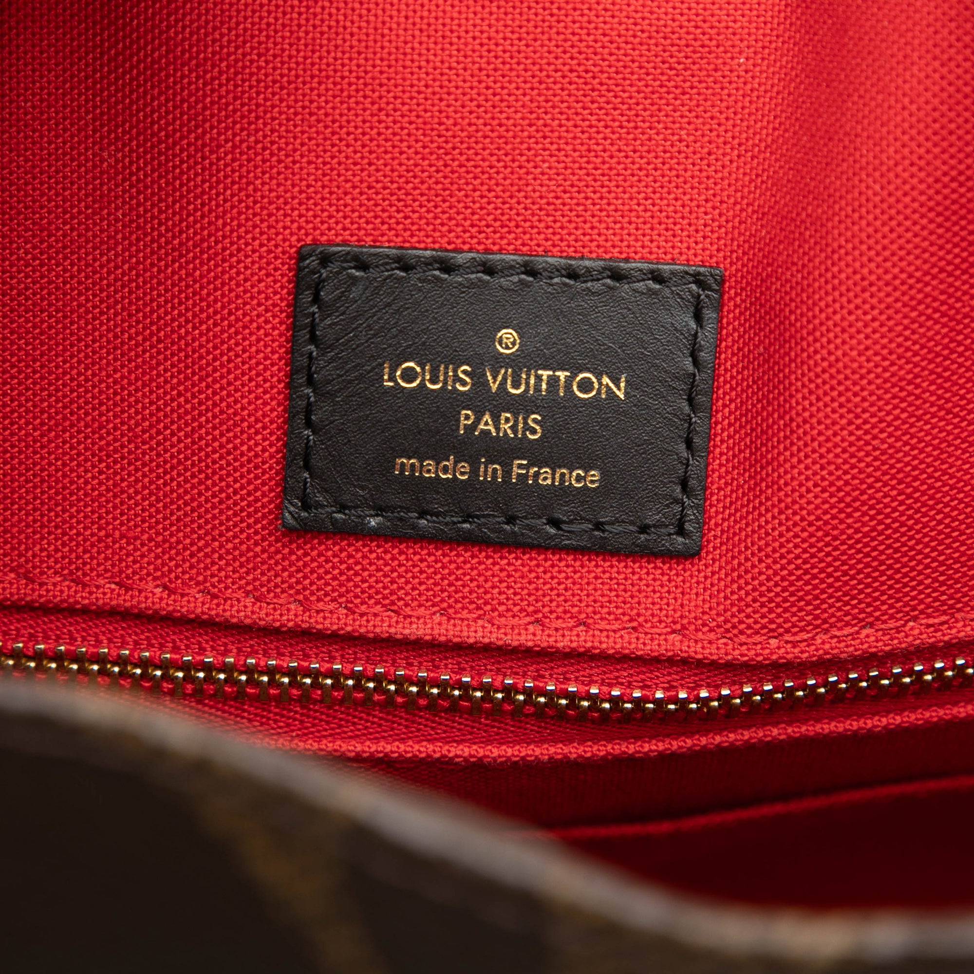The Onthego GM features a monogram giant canvas body, rolled handles, flat shoulder straps, an open top with lobster clasp closure, and interior zip and slip pockets. Retail Price: 3200.00