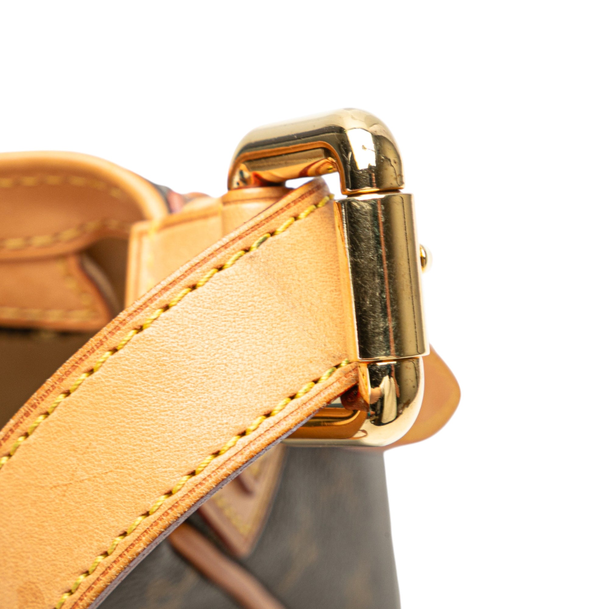 The Hudson GM features a monogram canvas body with vachetta leather trim, a flat vachetta leather strap, a top zip closure, exterior front zip and flap pockets, and interior slip pockets. Inclusion: Dust bag. Retail Price: 1890.00
