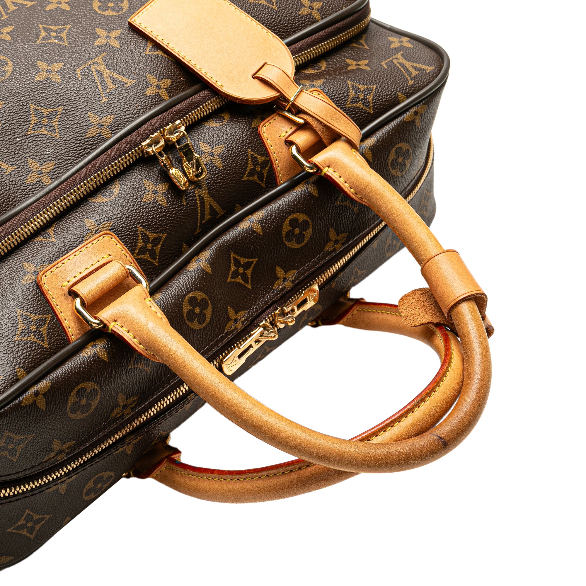 The Icare features a monogram canvas body, rolled vachetta leather handles, a flat canvas strap, a top zip closure, a front zip compartment with interior slip pockets, an exterior back slip pocket, and an interior laptop holster. Retail Price: 2340.00