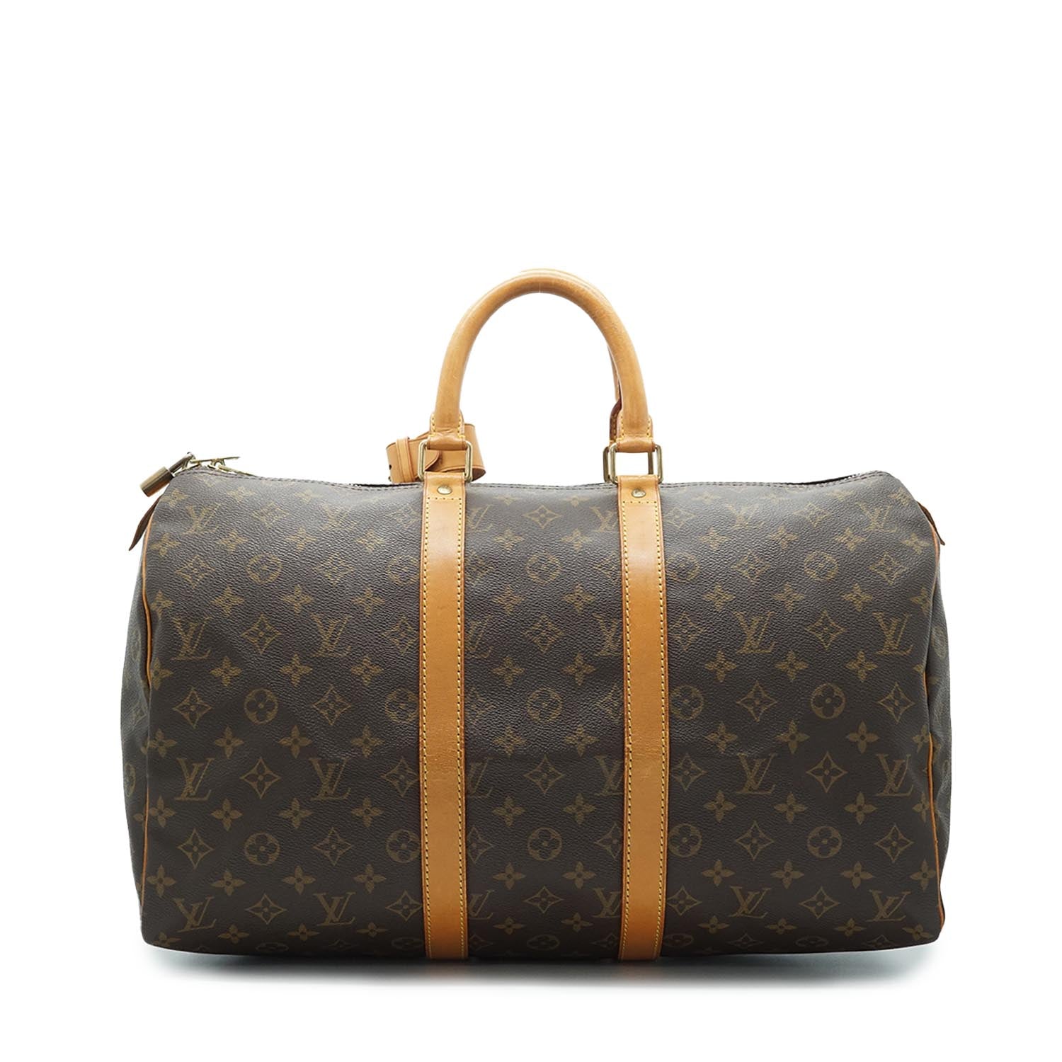 Monogram Keepall 45 Brown Canvas, LeatherDepth: 20.5cmHeight: 25cmWidth: 45cmHand Drop: 14cmOutside Rank: BInside Rank: BDiscoloration: Some hardware tarnishPeeling: Some cracking on the leather partsWorn: In generalOdor: No odor presentInclude: Padlock (the key is missing), Leather luggage tagSerial code: SP0954SKU: 6110143