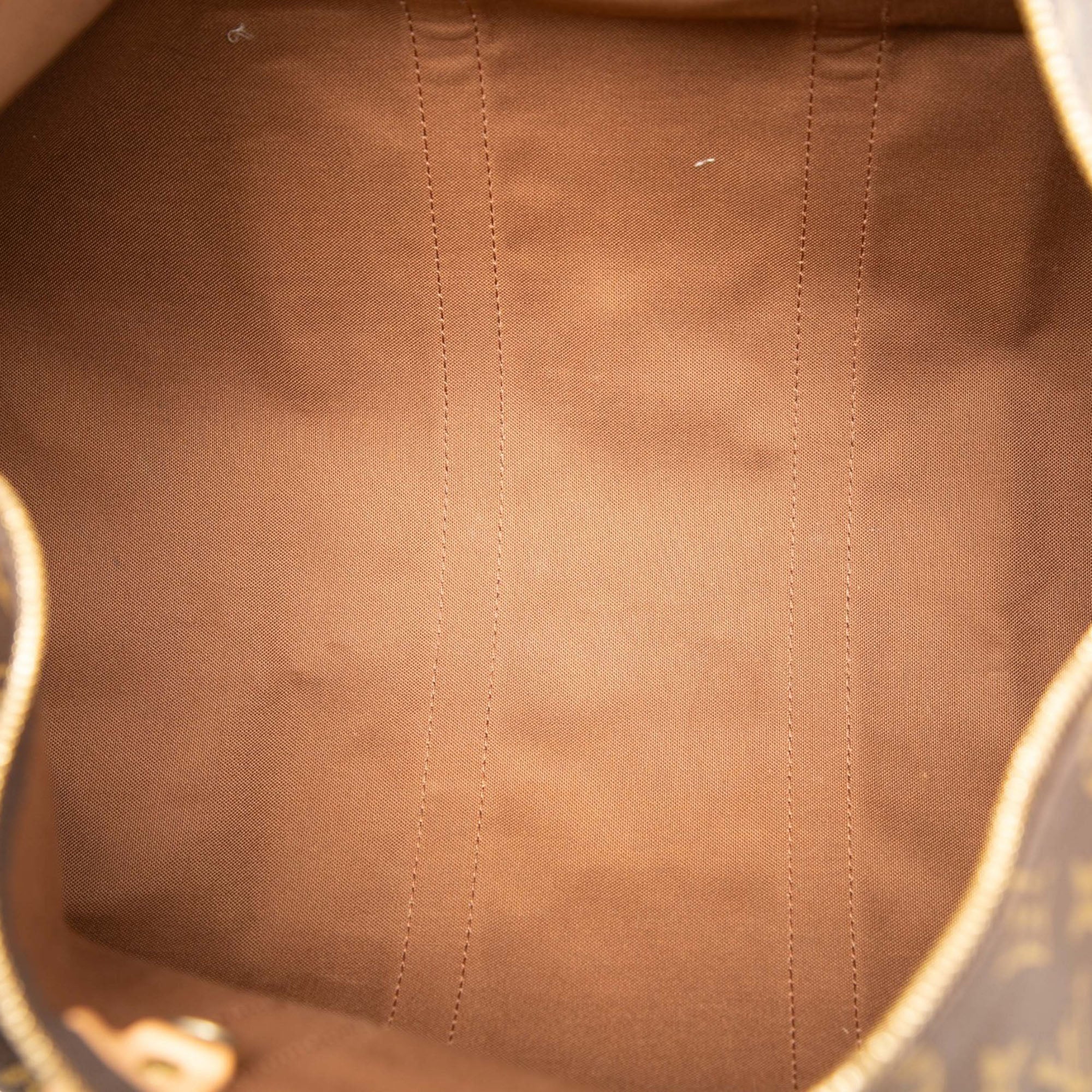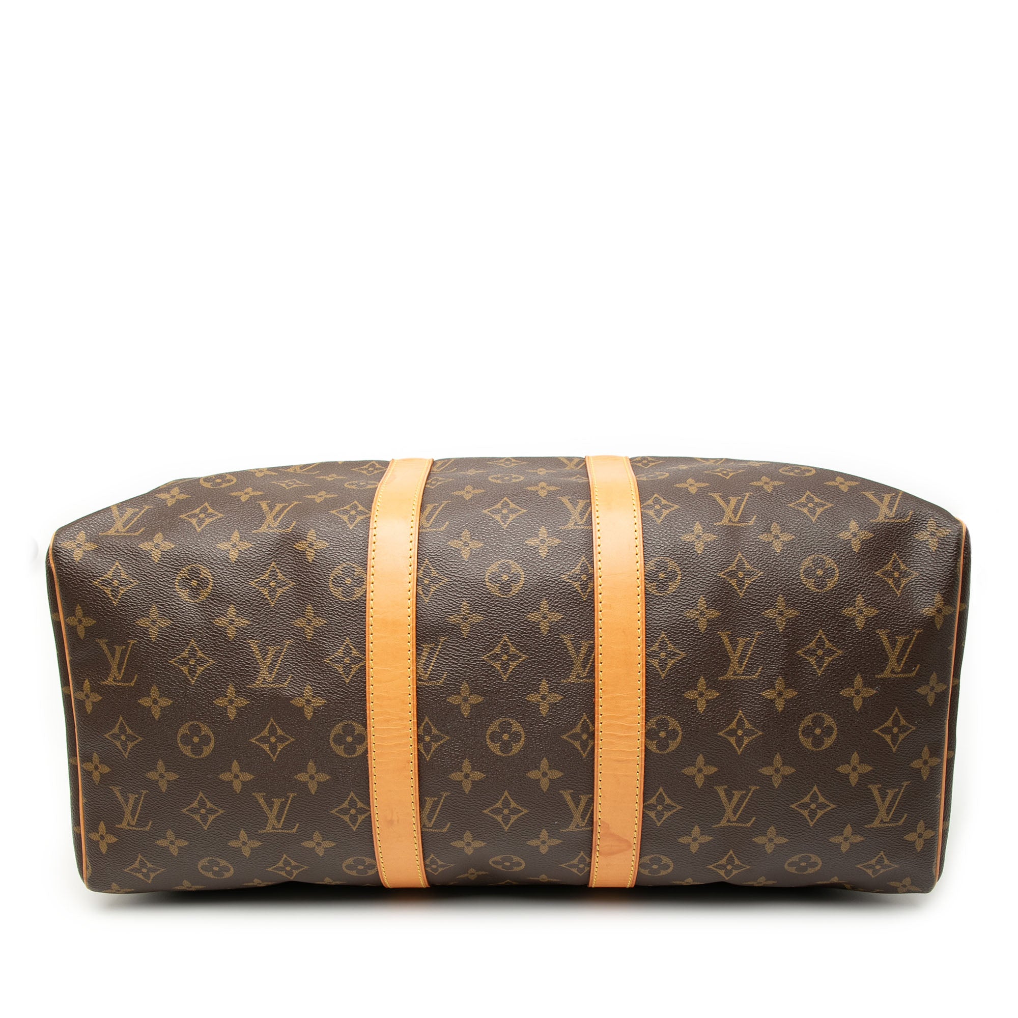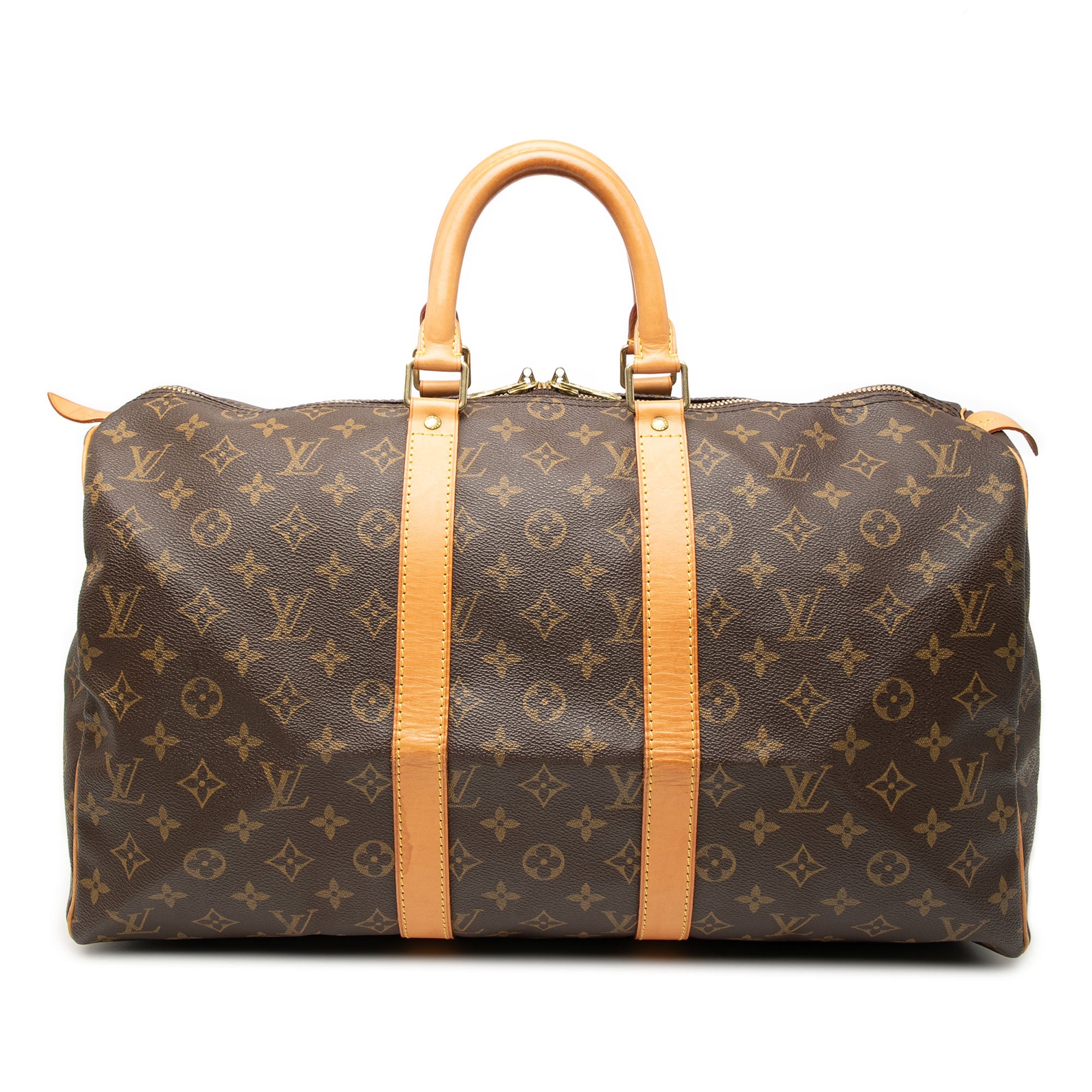 The Keepall 45 features a monogram canvas body with vachetta leather trim, rolled vachetta leather handles, and a top zip closure. Retail Price: 2020.00