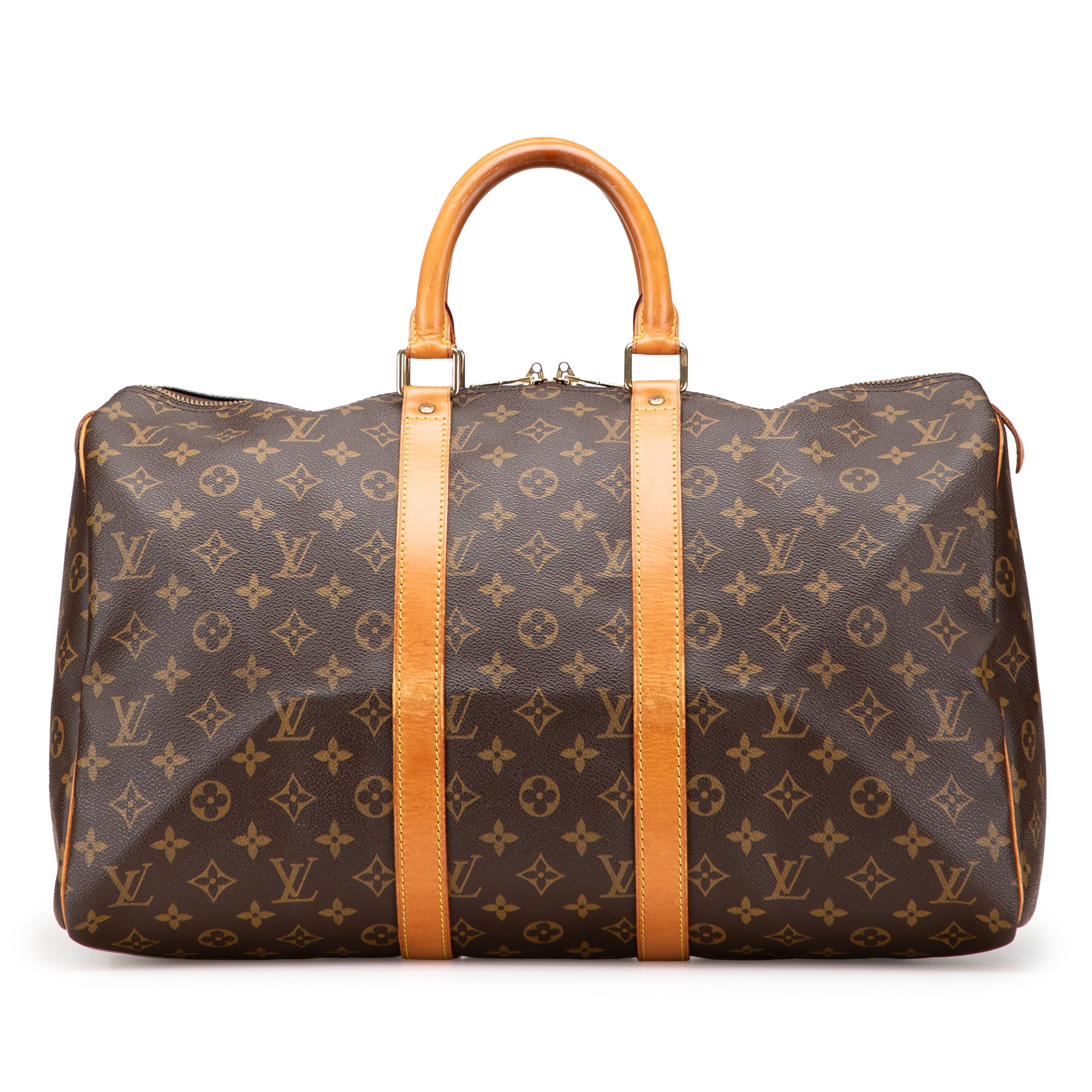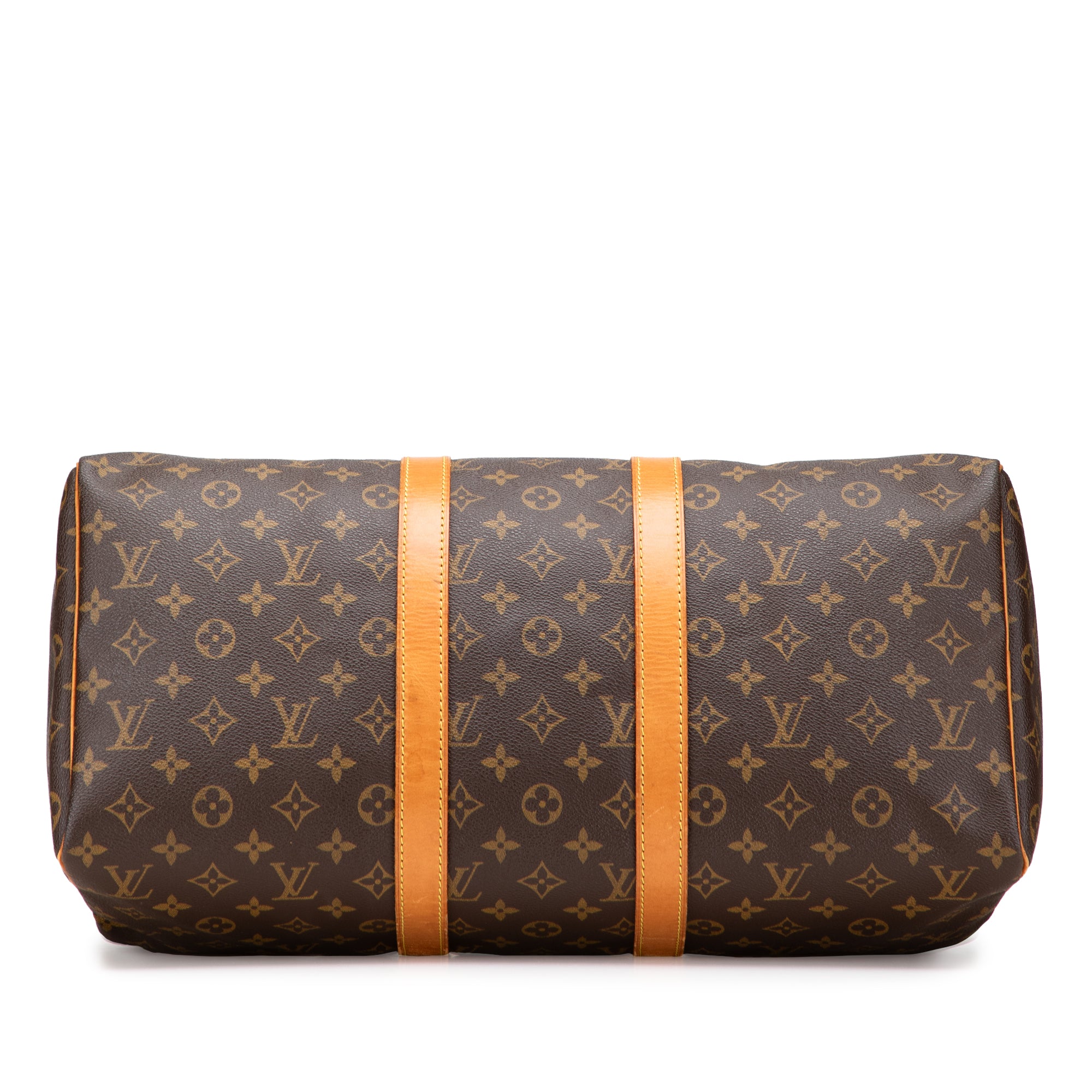 The Keepall 45 features a monogram canvas body with vachetta leather trim, rolled vachetta leather handles, and a top zip closure. Retail Price: 2200.00