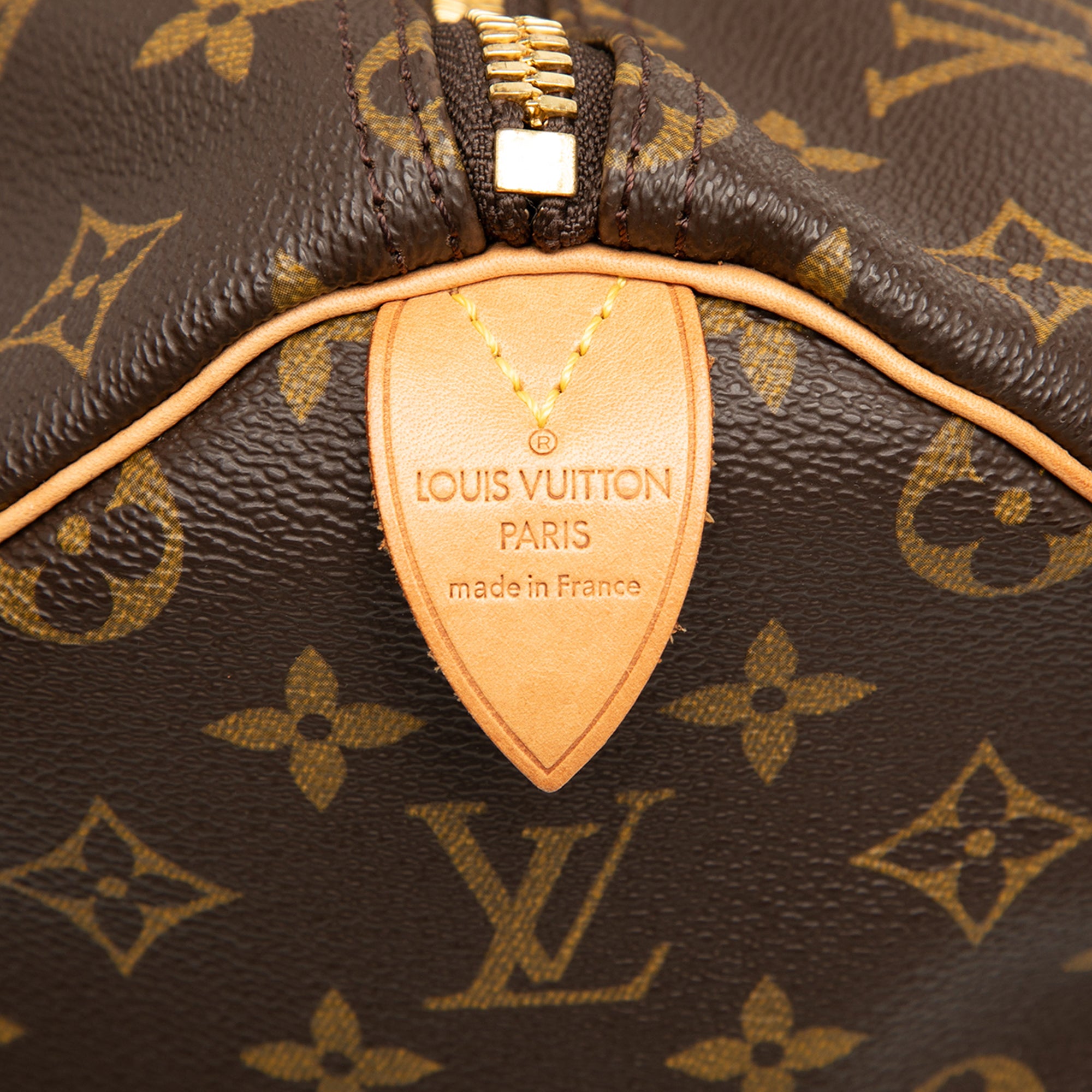 The Keepall 50 features a monogram canvas body with vachetta leather trim, rolled vachetta leather handles and a top zip closure. Retail Price: 1705.00