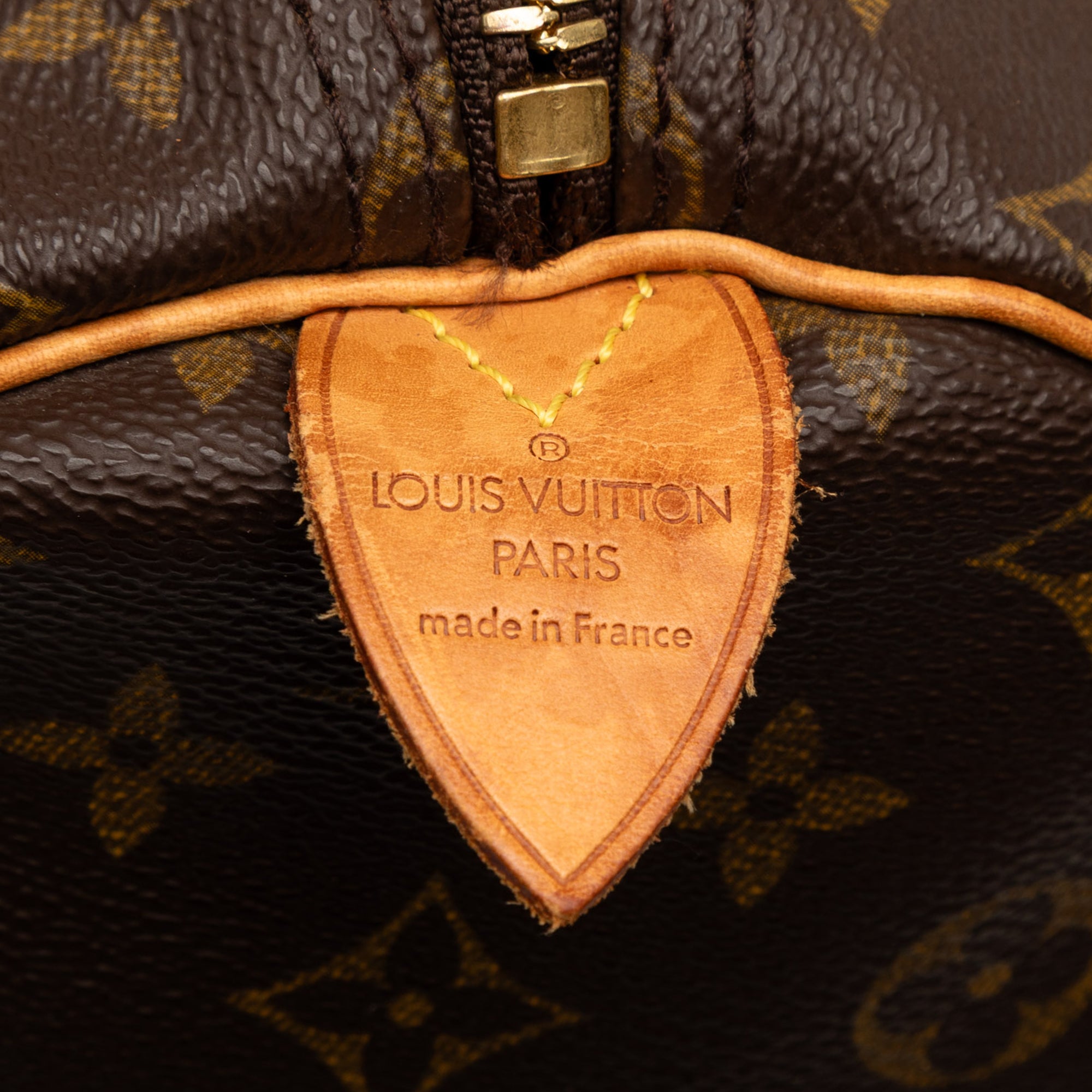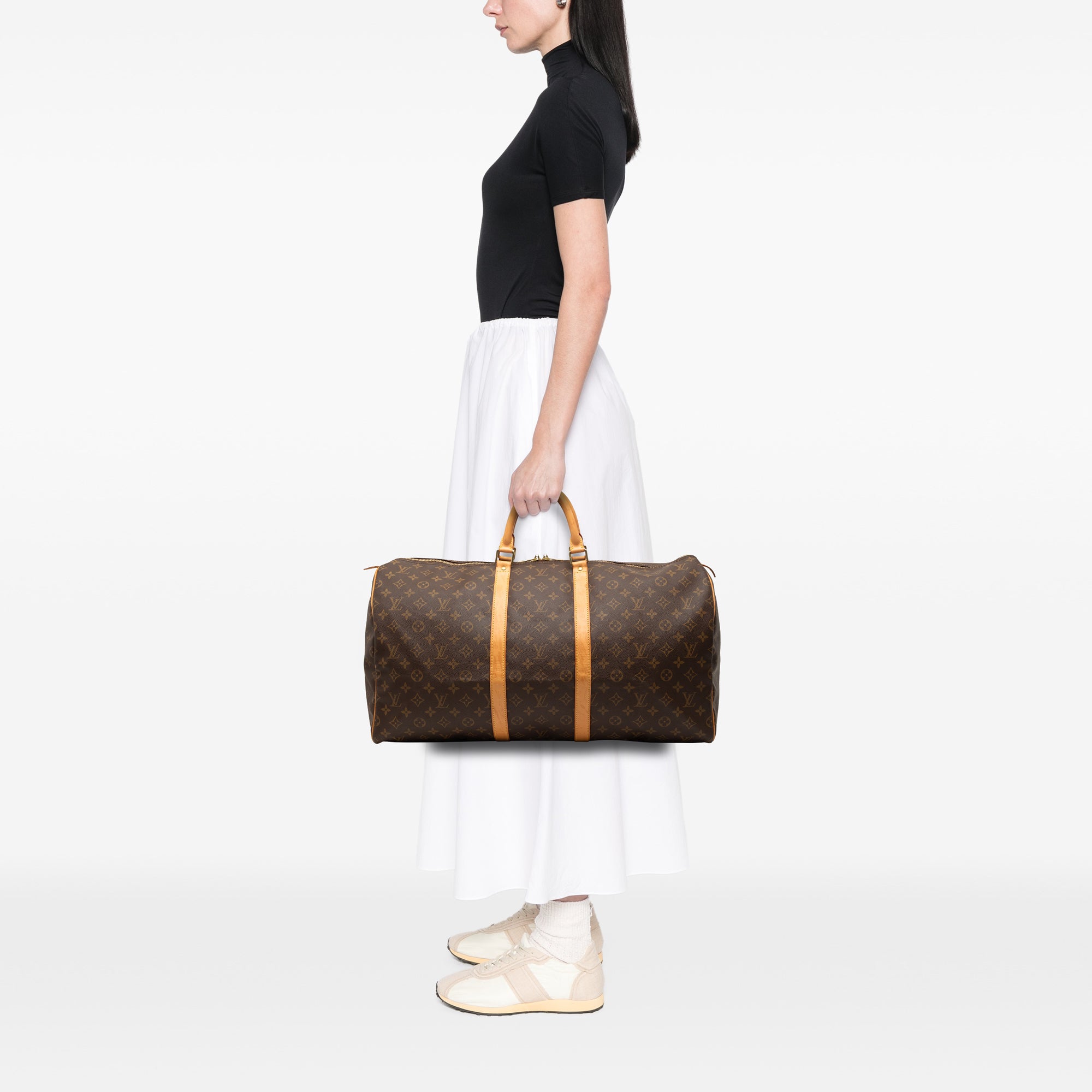 The Keepall 55 features a monogram canvas body with vachetta leather trim, rolled vachetta leather handles, and a top zip closure. Retail Price: 1864.00