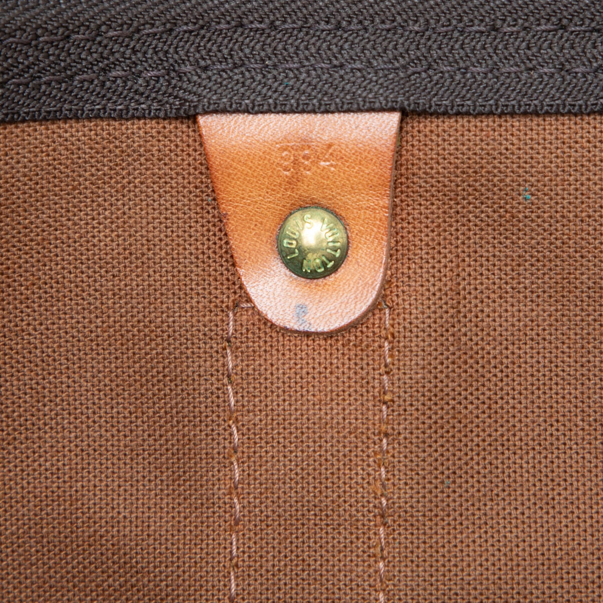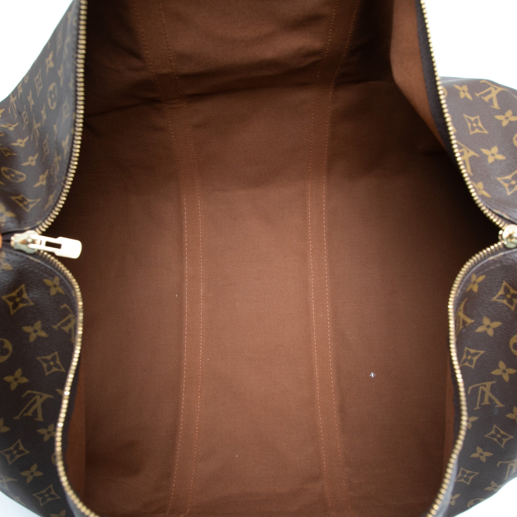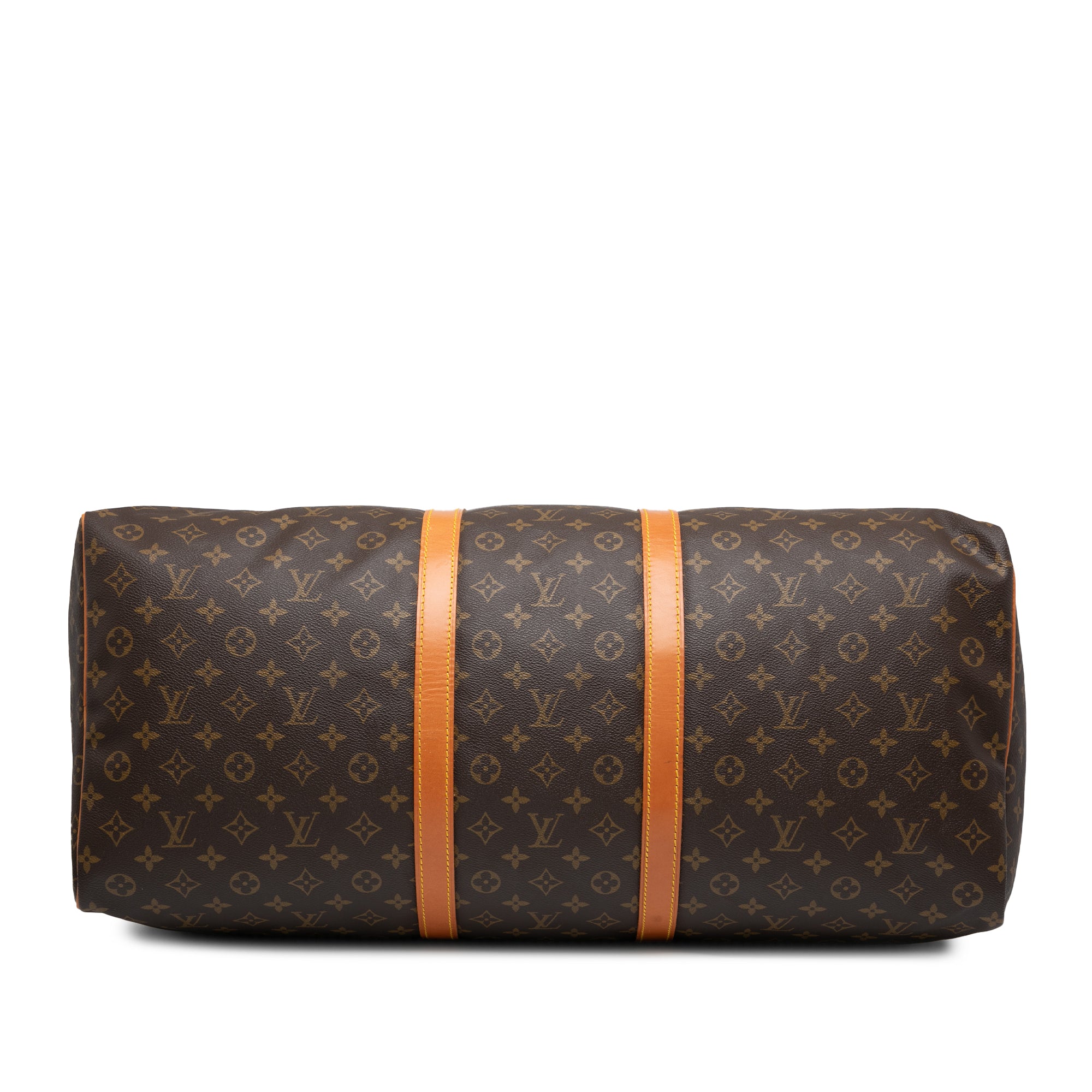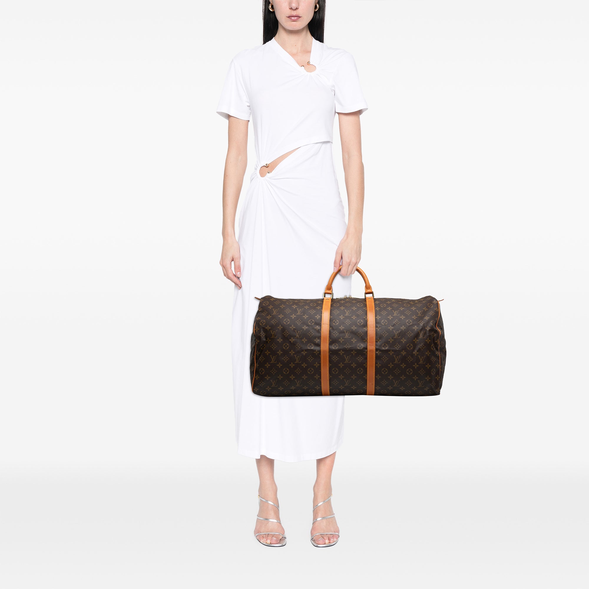 The Keepall 60 features a monogram canvas body with vachetta leather trim, rolled vachetta leather handles, and a top zip closure. Retail Price: 1968.00
