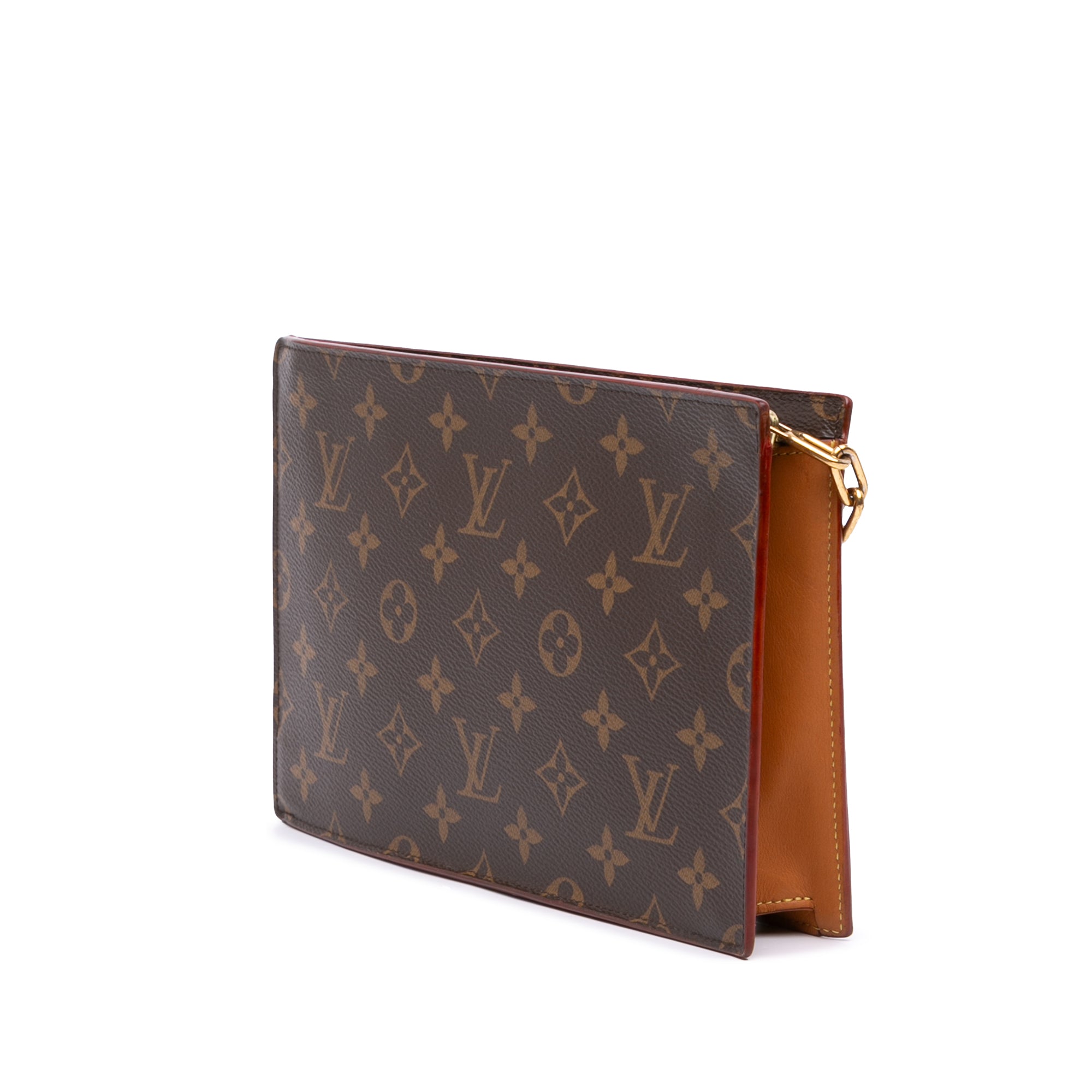The Legacy Chain Clutch features a monogram canvas body, a gold-tone chain detail, a top zip closure, and interior slip pockets. Retail Price: 1883.00
