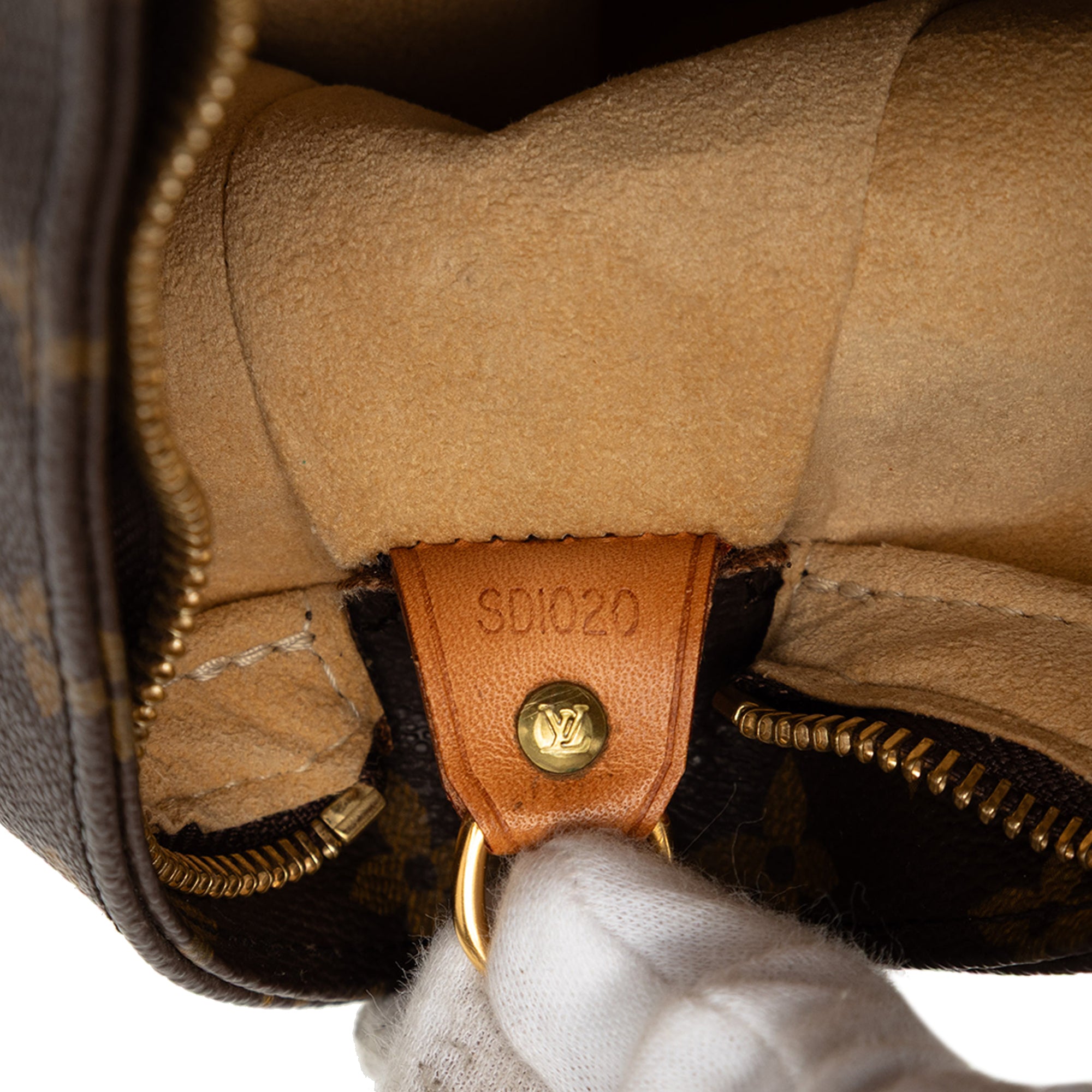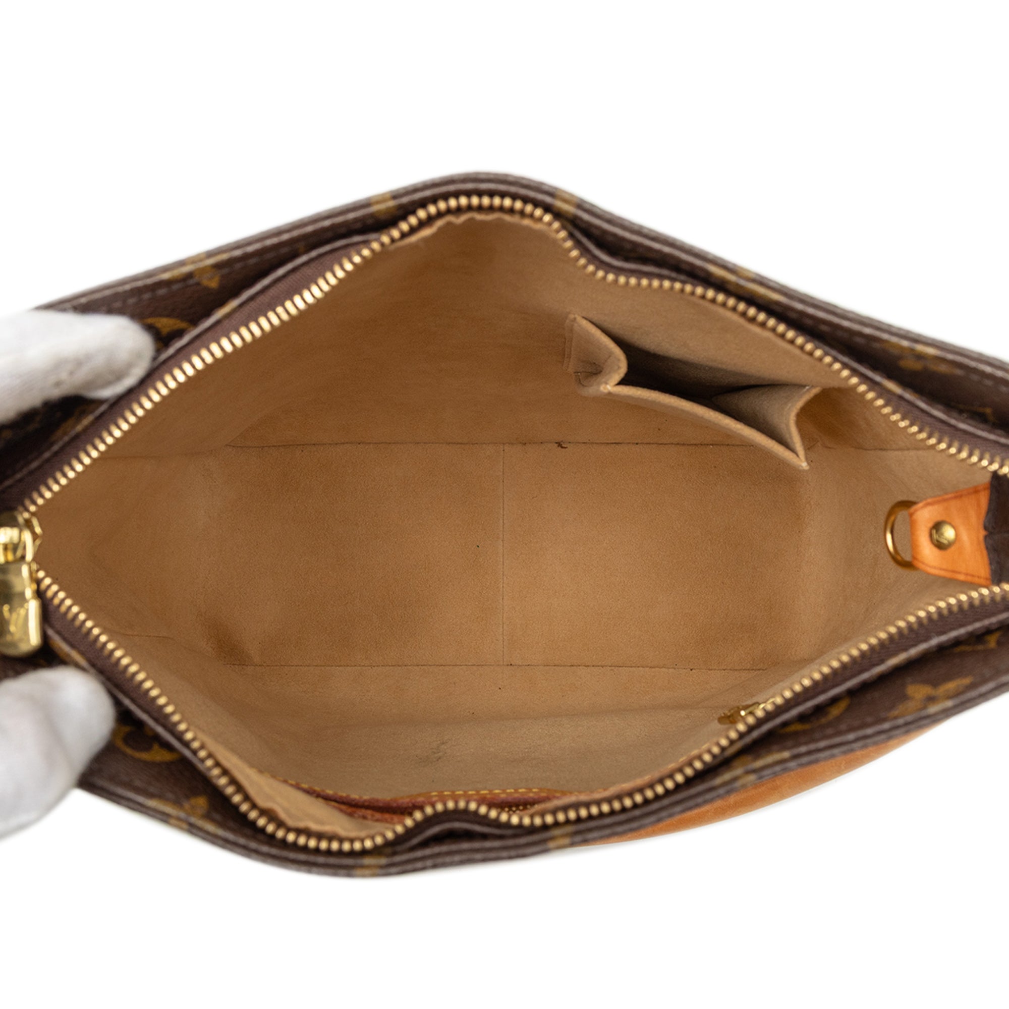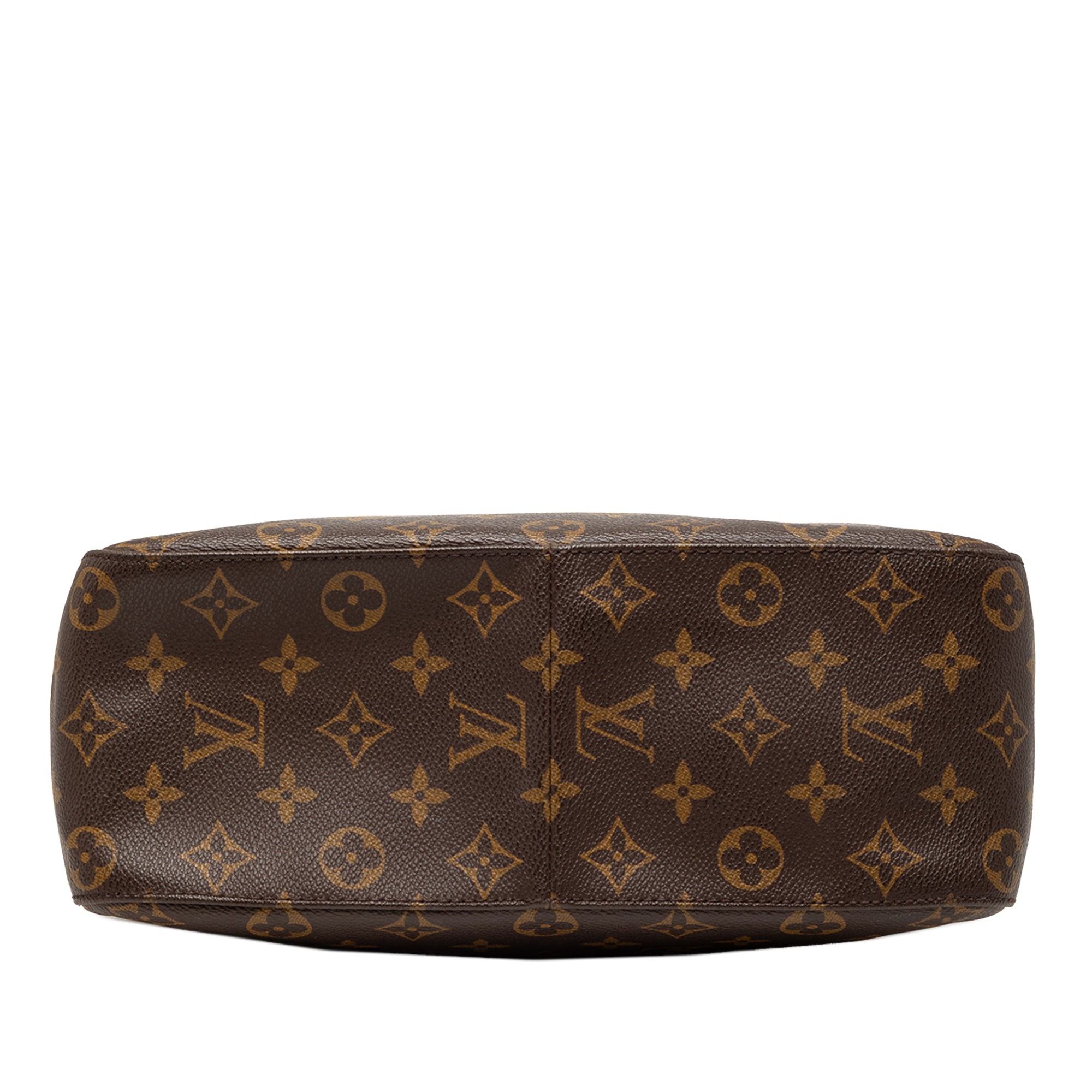 The Looping GM features a monogram canvas body, a rolled vachetta leather shoulder strap, a top zip closure, and interior zip and slip pockets. Retail Price: 1273.00
