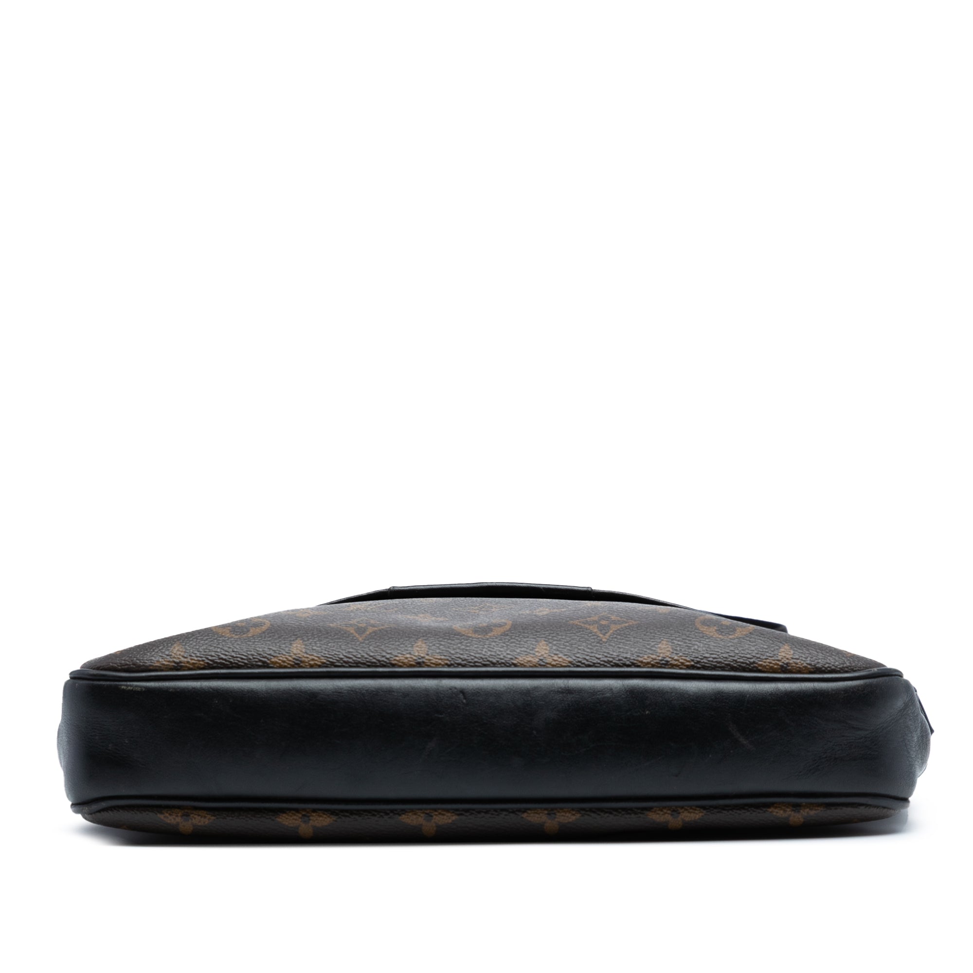 The Bass MM features a monogram canvas body with leather trim, an adjustable flat strap, a top flap with magnetic closure, a back exterior zip pocket, and interior slip pockets. Retail Price: 1477.00