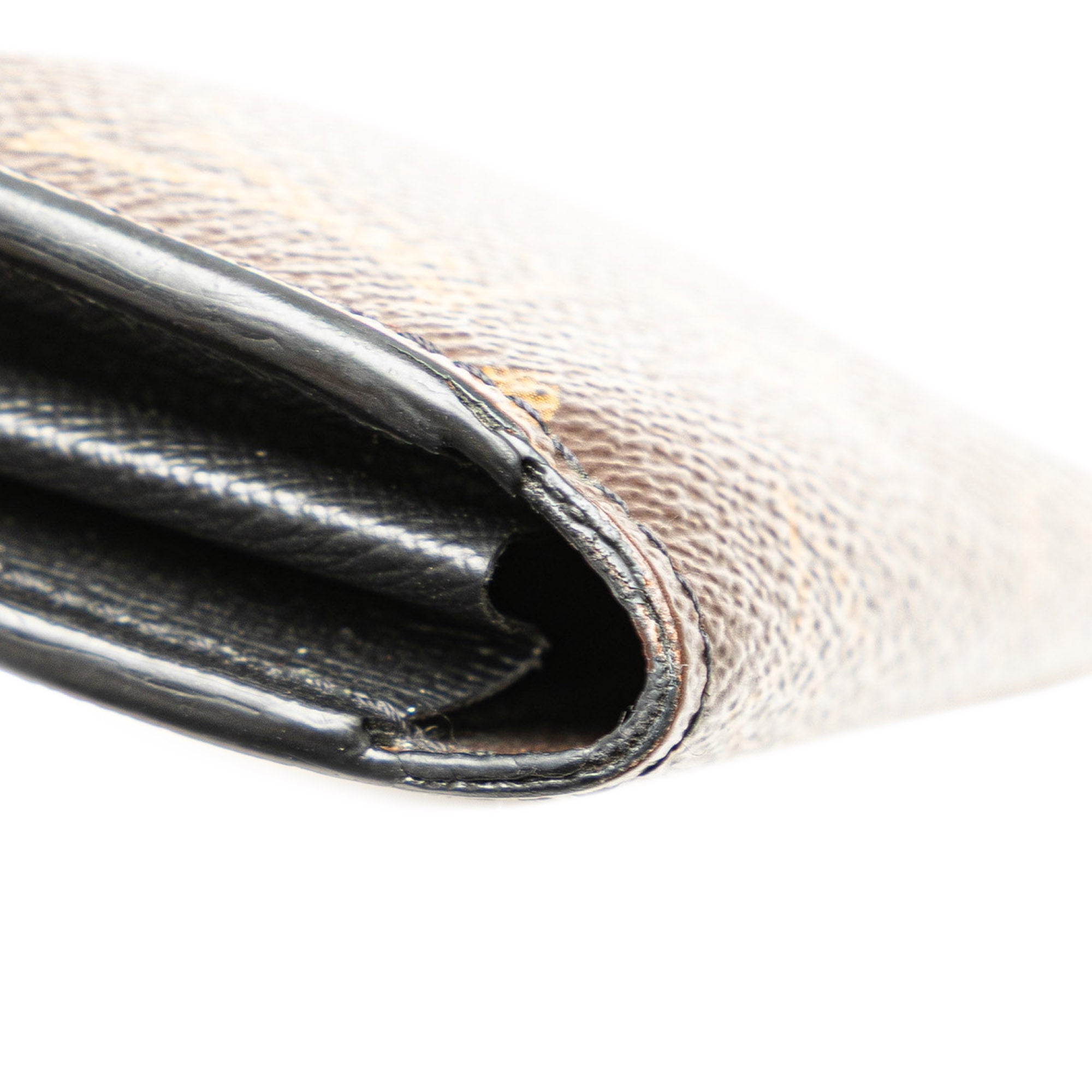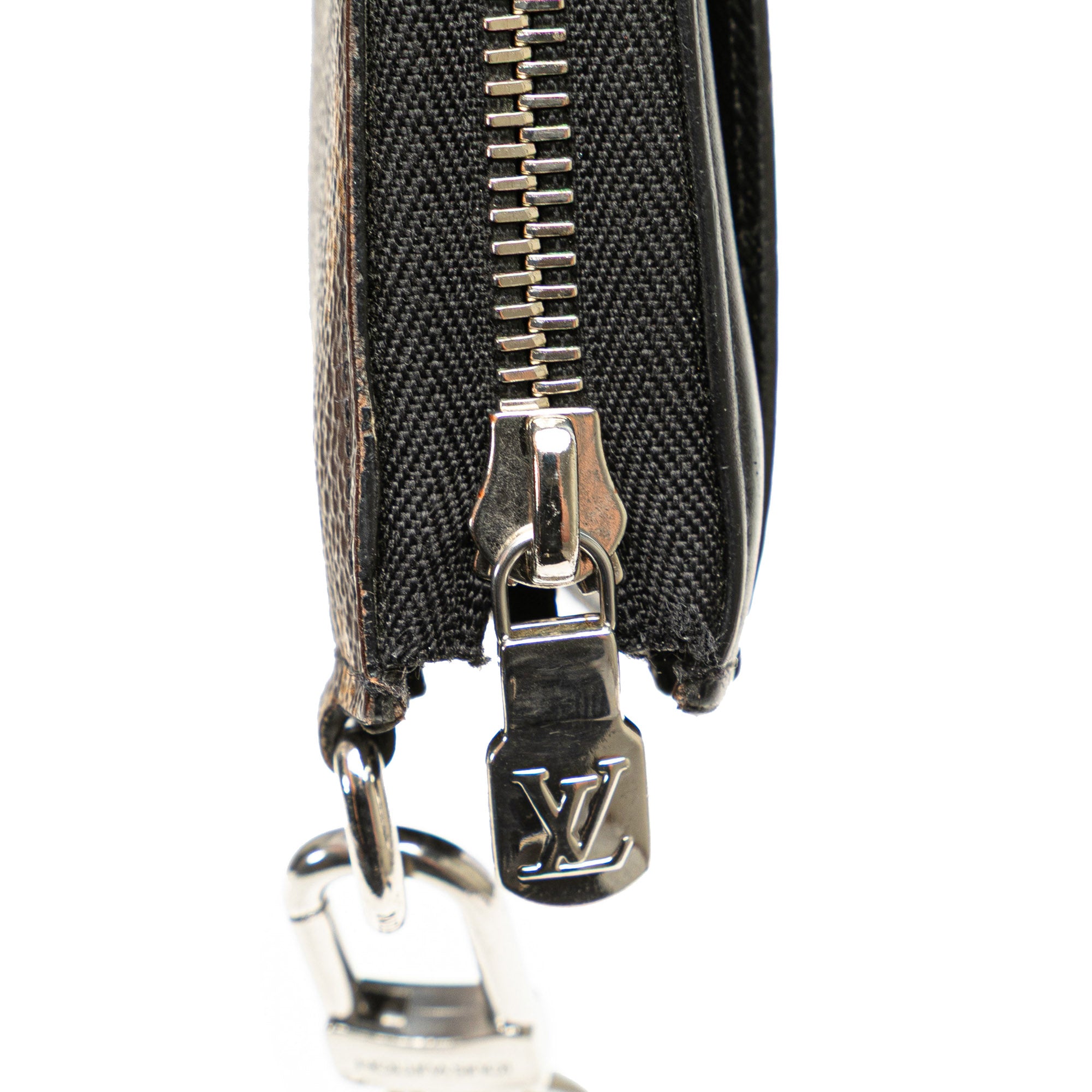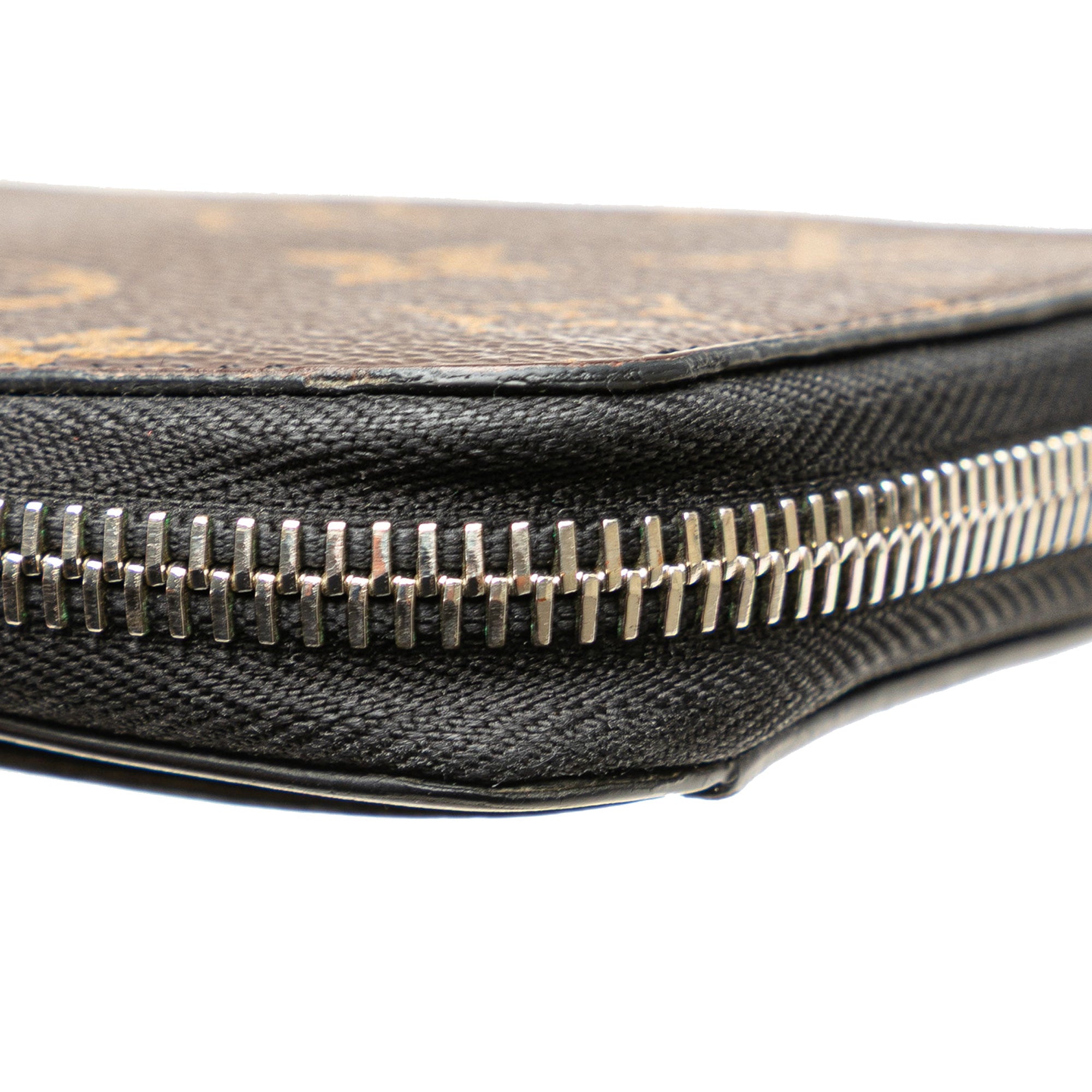 This wallet features a monogram canvas body with leather trim, a detachable wrist strap, a top zip closure, and interior zip and slip pockets and compartments. Inclusion: Dust bag. Retail Price: 1320.00