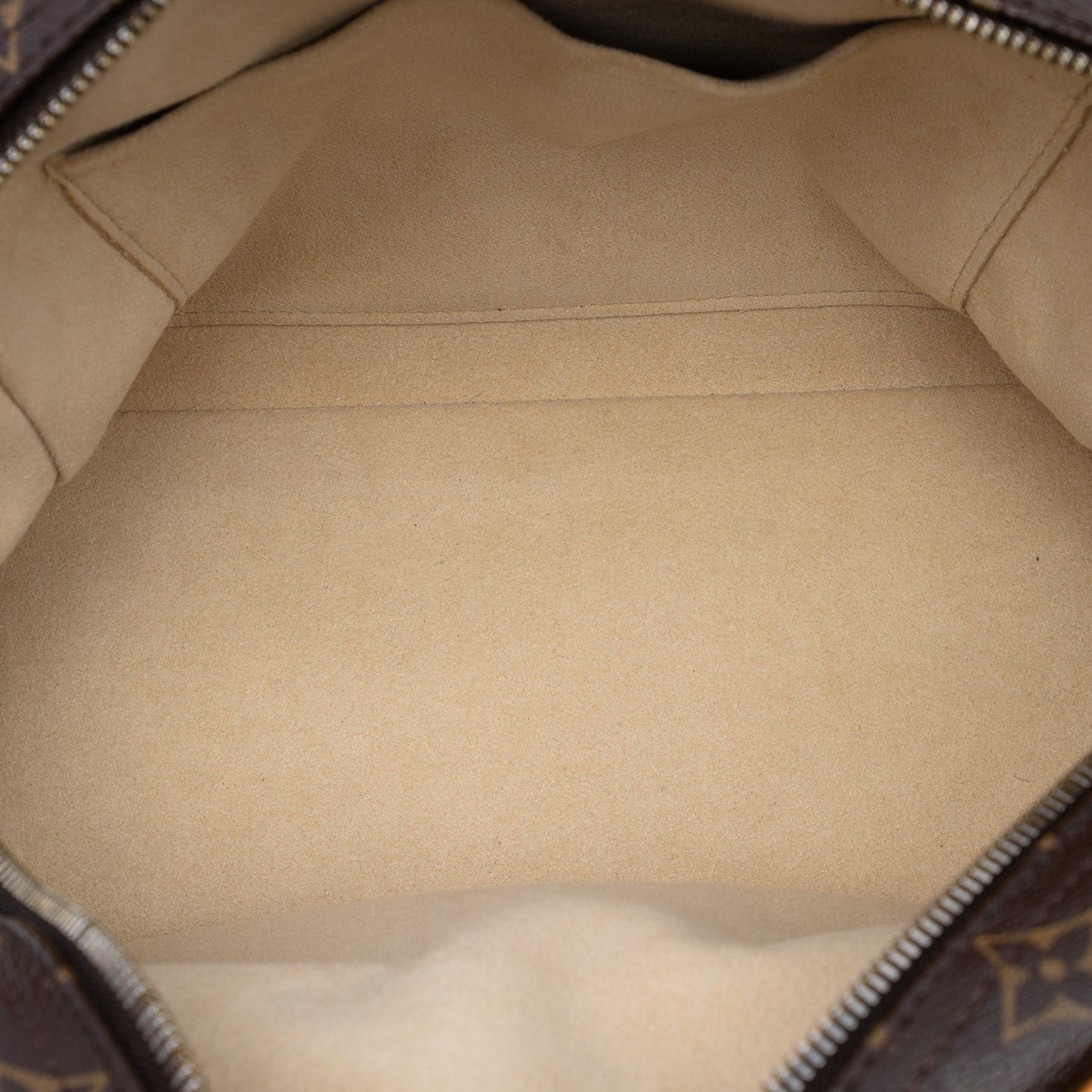 The Manhattan PM features a monogram canvas body with vachetta leather trim, rolled vachetta leather handles, a top zip closure, exterior flap pockets with gold-tone hardware and push lock closures, and an interior slip pocket. Retail Price: 1413.00
