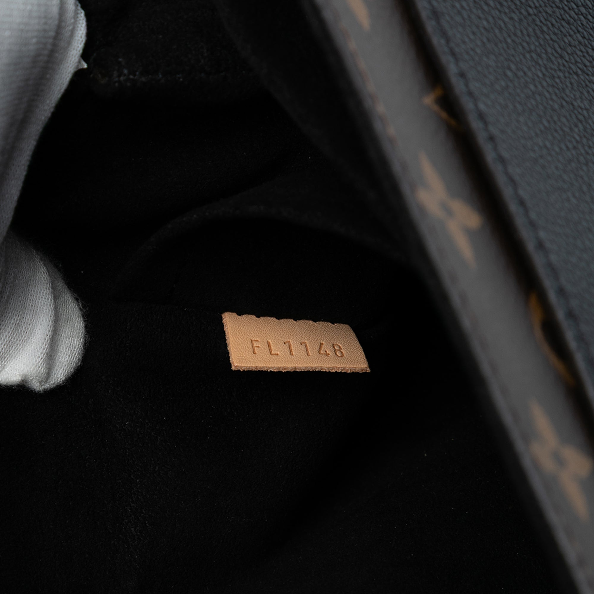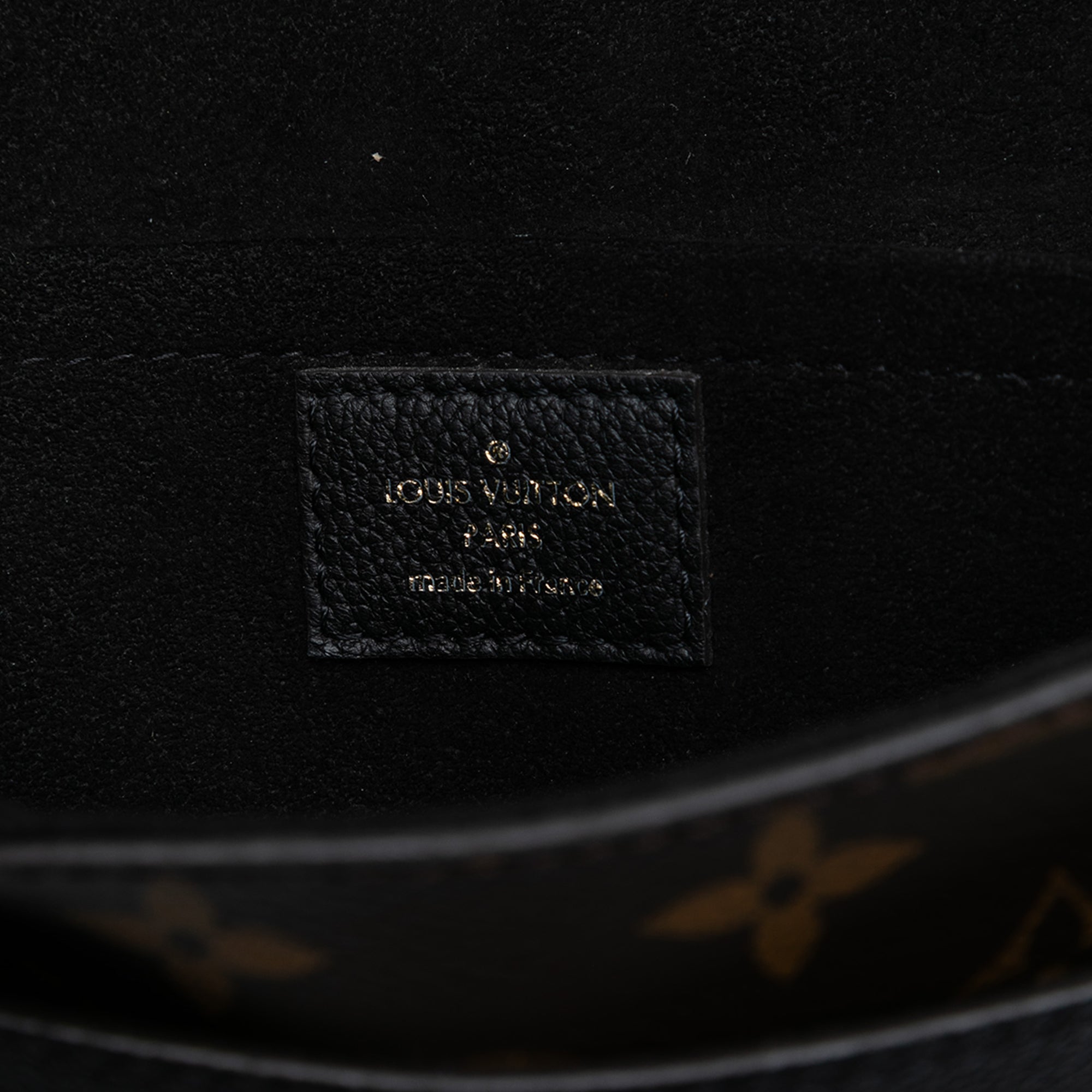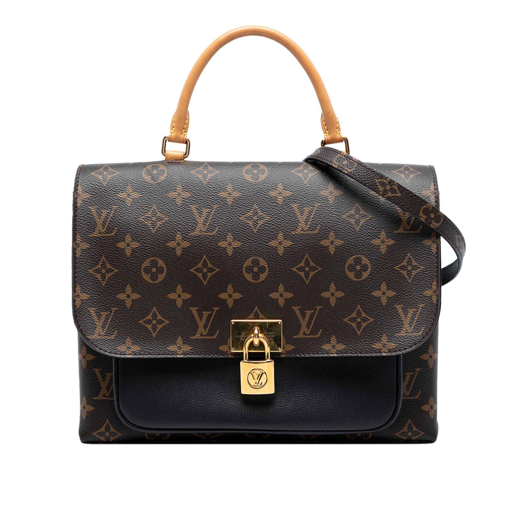 The Marignan features a monogram canvas body with leather trim, a rolled vachetta leather top handle, a detachable flat monogram canvas shoulder strap, a front flap with magnetic snap button closure, and interior slip pockets. Retail Price: 2230.00