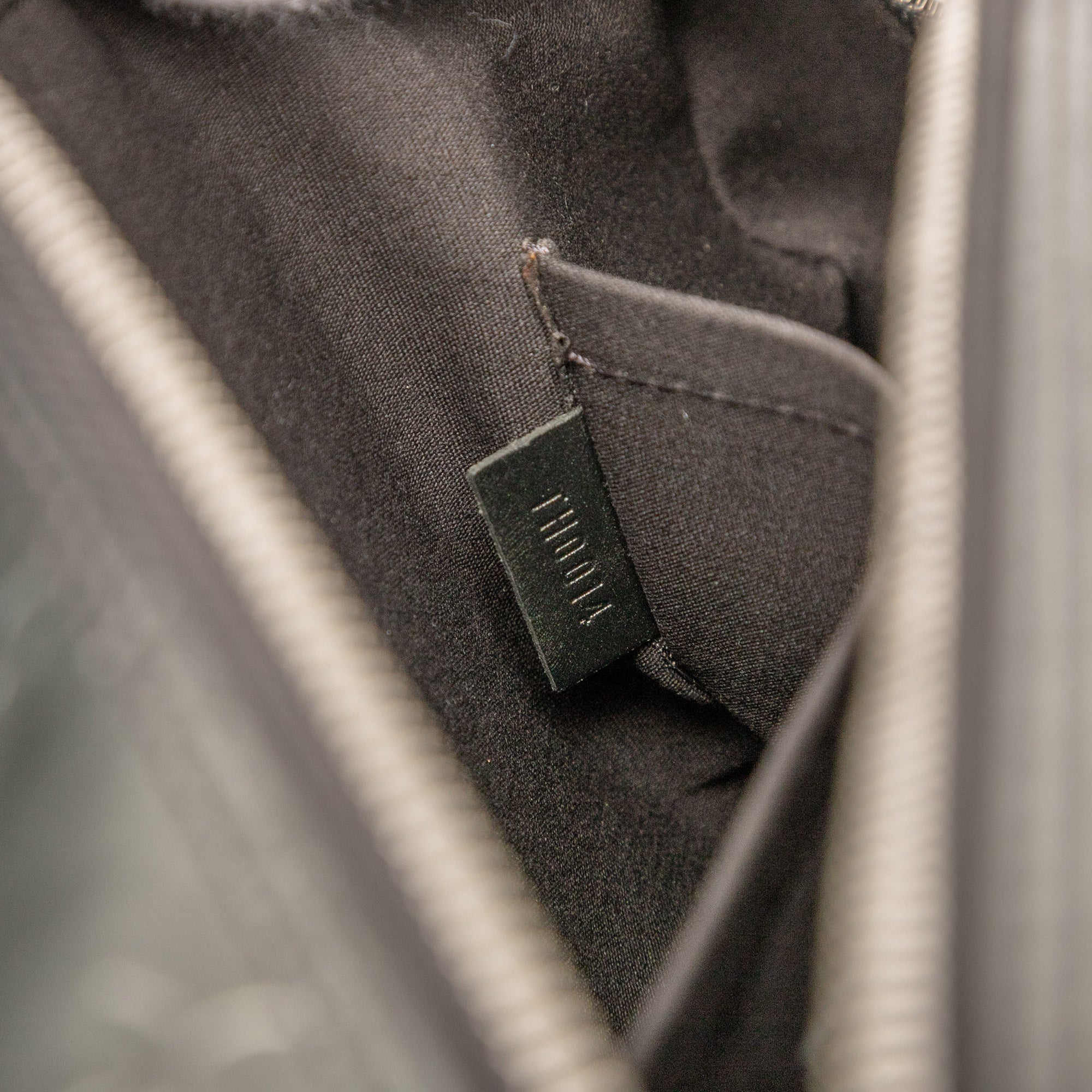The Mat Shelton features a monogram leather body, flat leather handles, a top zip closure, an exterior slip pocket, and interior slip pockets. Retail Price: 916.00