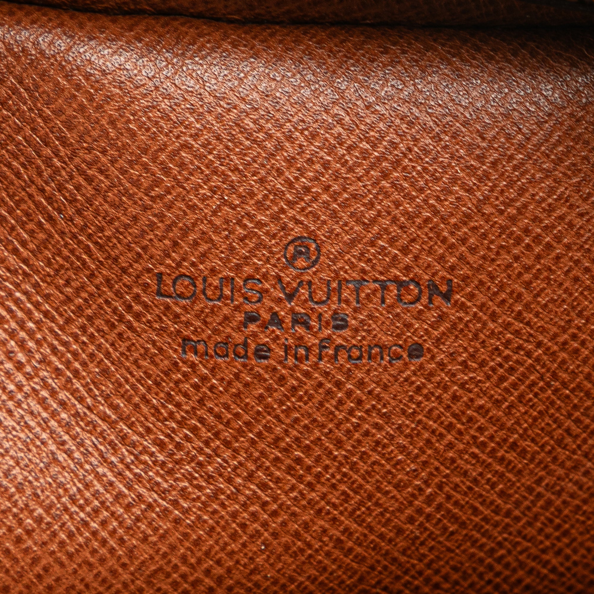 The Mini Amazone features a monogram canvas body with vachetta leather trim, an adjustable flat shoulder strap, a top zip closure, and an exterior front zip pocket. Retail Price: 1000.00