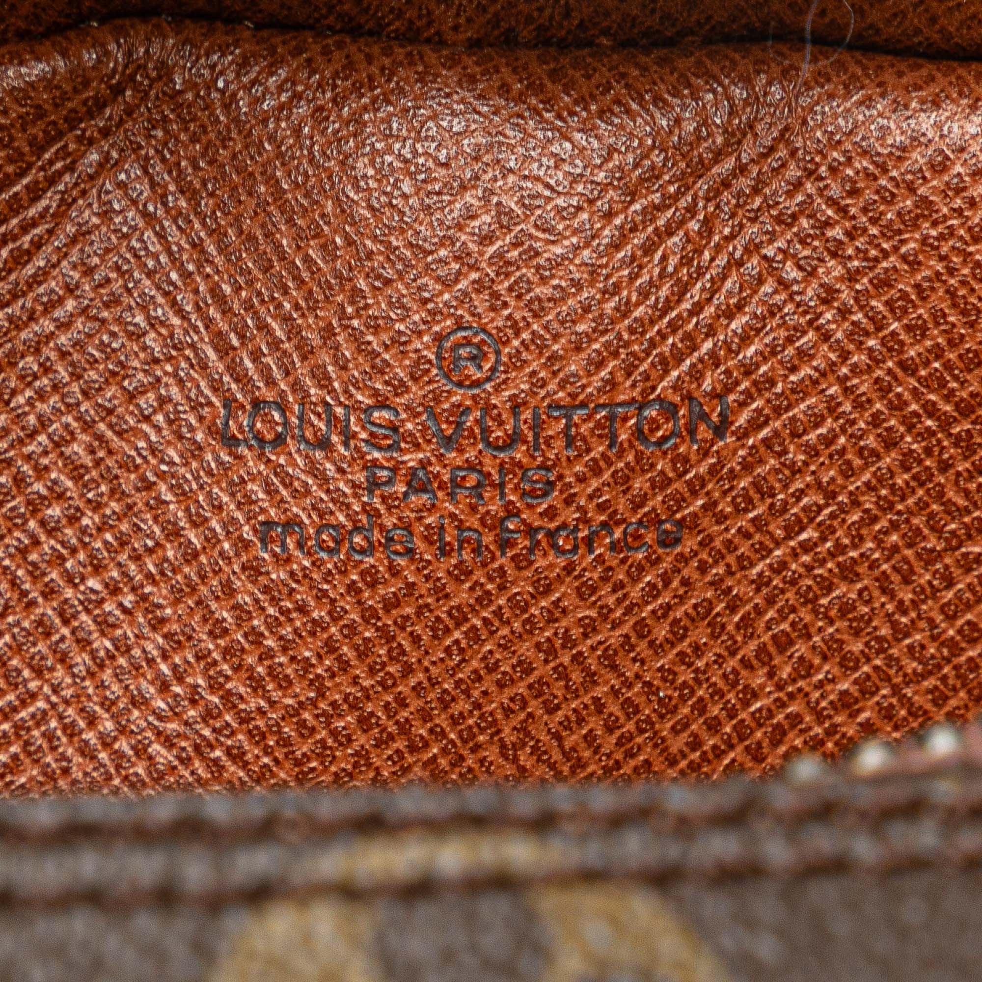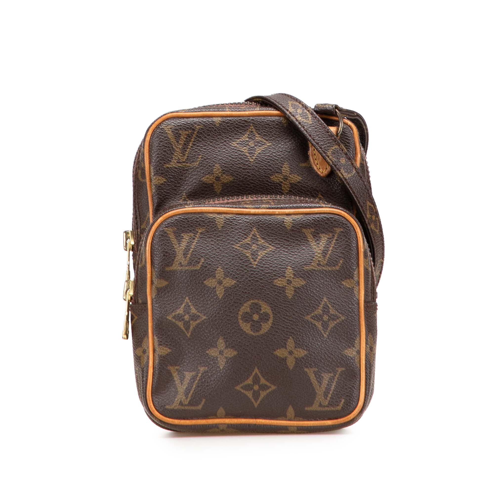 The Mini Amazone features a monogram canvas body with vachetta leather trim, an adjustable flat shoulder strap, a top zip closure, and an exterior front zip pocket. Retail Price: 1000.00