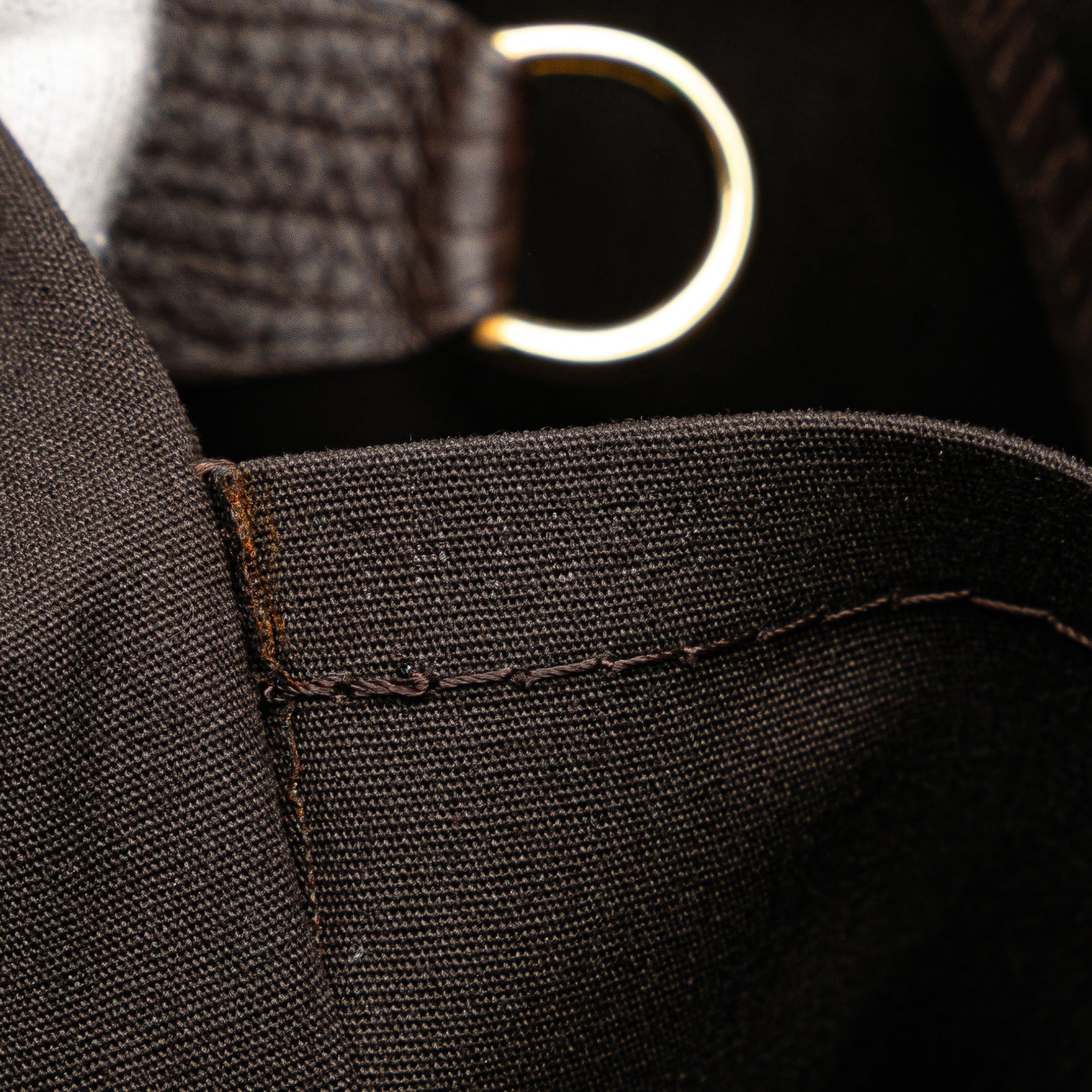 The Besace Angele features a monogram mini lin canvas body with leather trim, rolled leather handles, a detachable flat leather strap, a top zip closure, and interior slip pockets. Retail Price: 1420.00