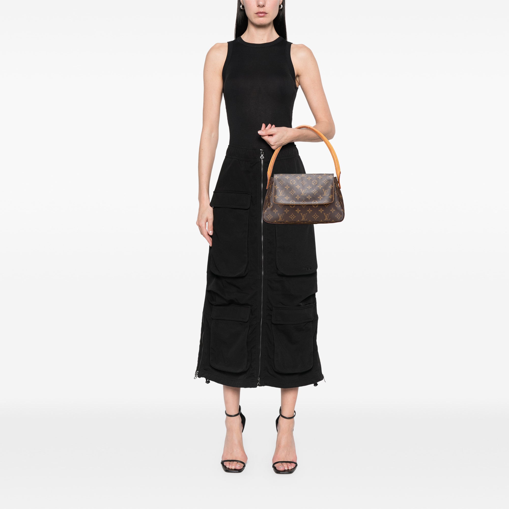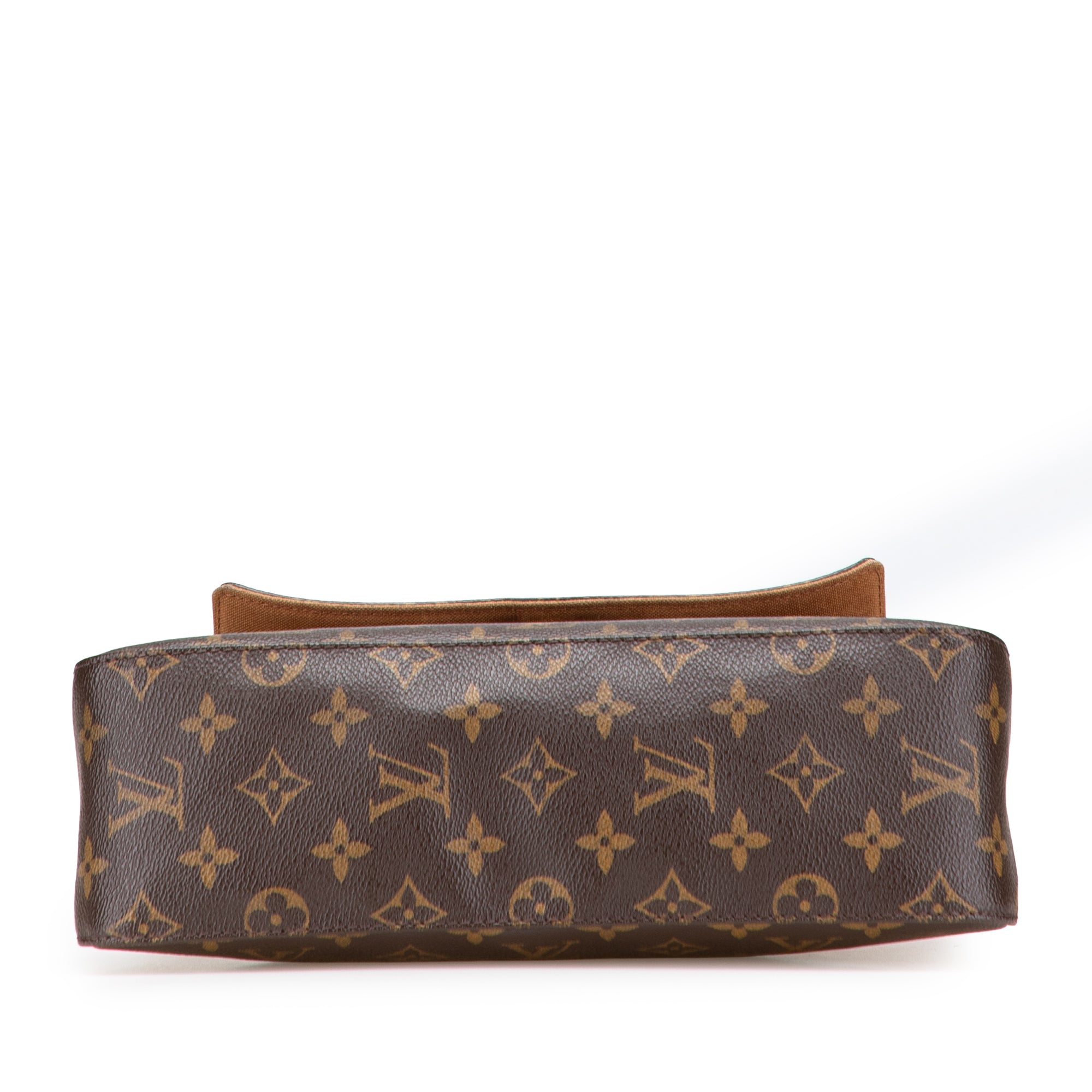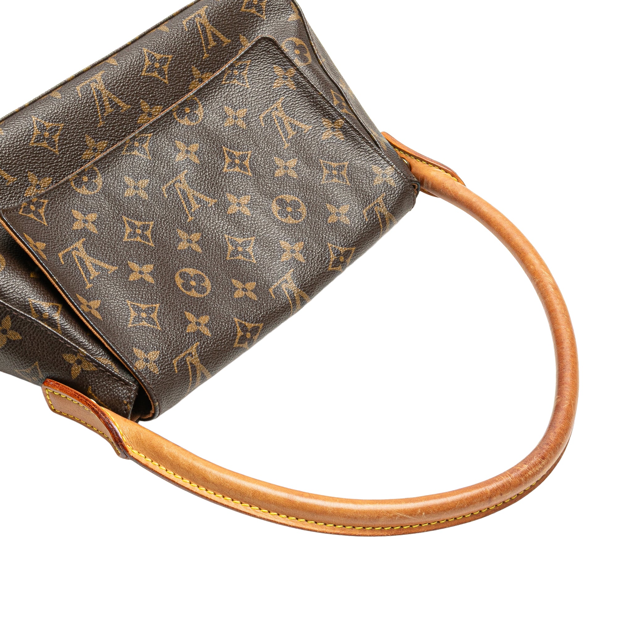 The Looping Mini features a monogram canvas body, a rolled vachetta leather handle, a flap with magnetic snap closure, and an interior zip pocket. Retail Price: 1008.00