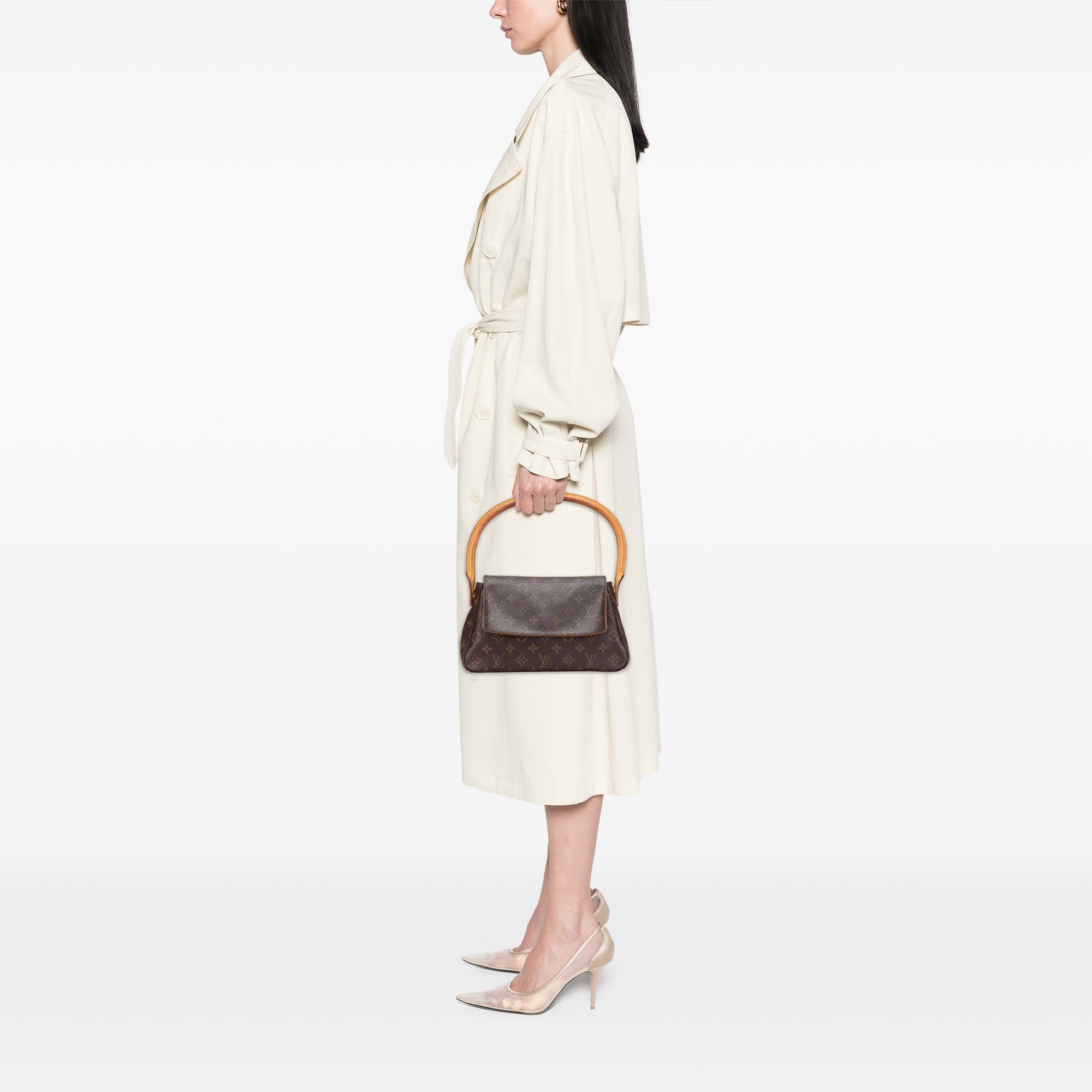 The Looping Mini features a monogram canvas body, a rolled vachetta leather handle, a flap with magnetic snap closure, and an interior zip pocket. Retail Price: 985.00