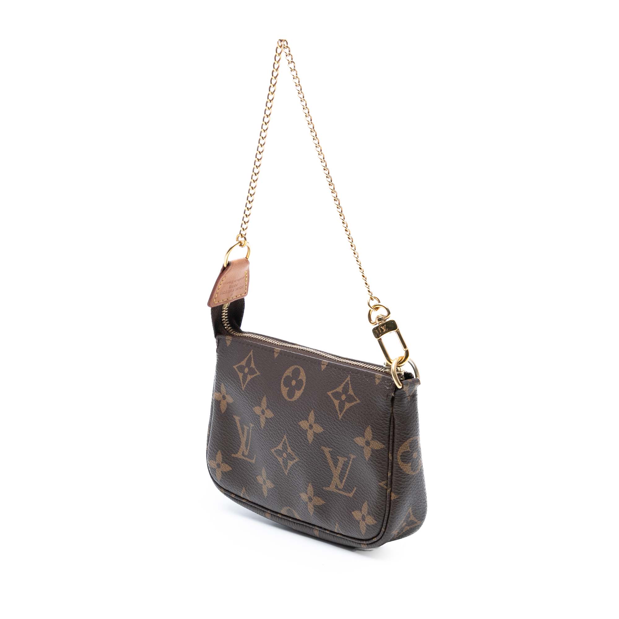 The Mini Pochette Accessoires features a monogram canvas body, a gold-tone chain strap, and a top zip closure. Retail Price: 868.00