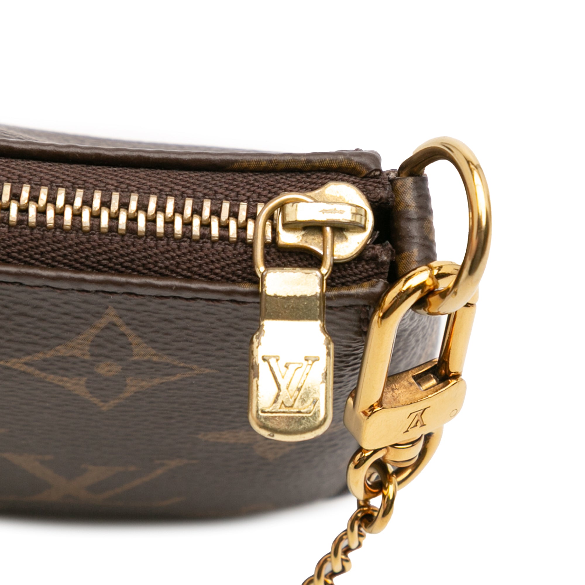 The Mini Pochette Accessoires features a monogram canvas body, a gold-tone chain strap, and a top zip closure. Retail Price: 868.00