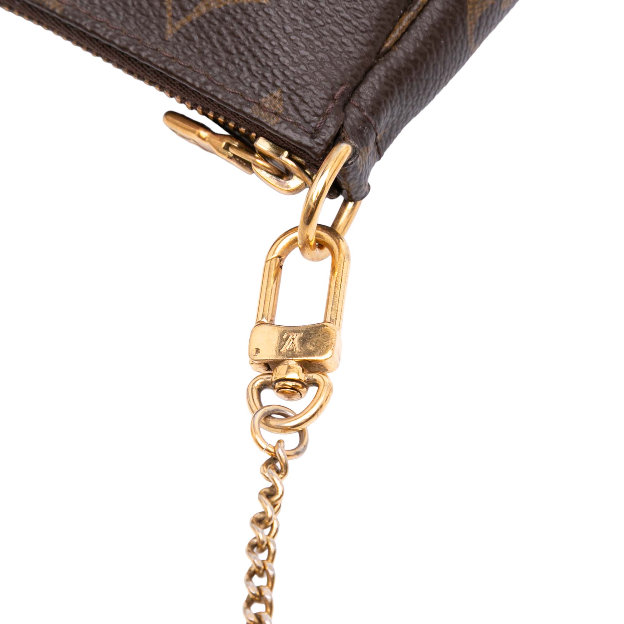The Mini Pochette Accessoires features a monogram canvas body, a chain link handle, and a top zip closure. Retail Price: 868.00